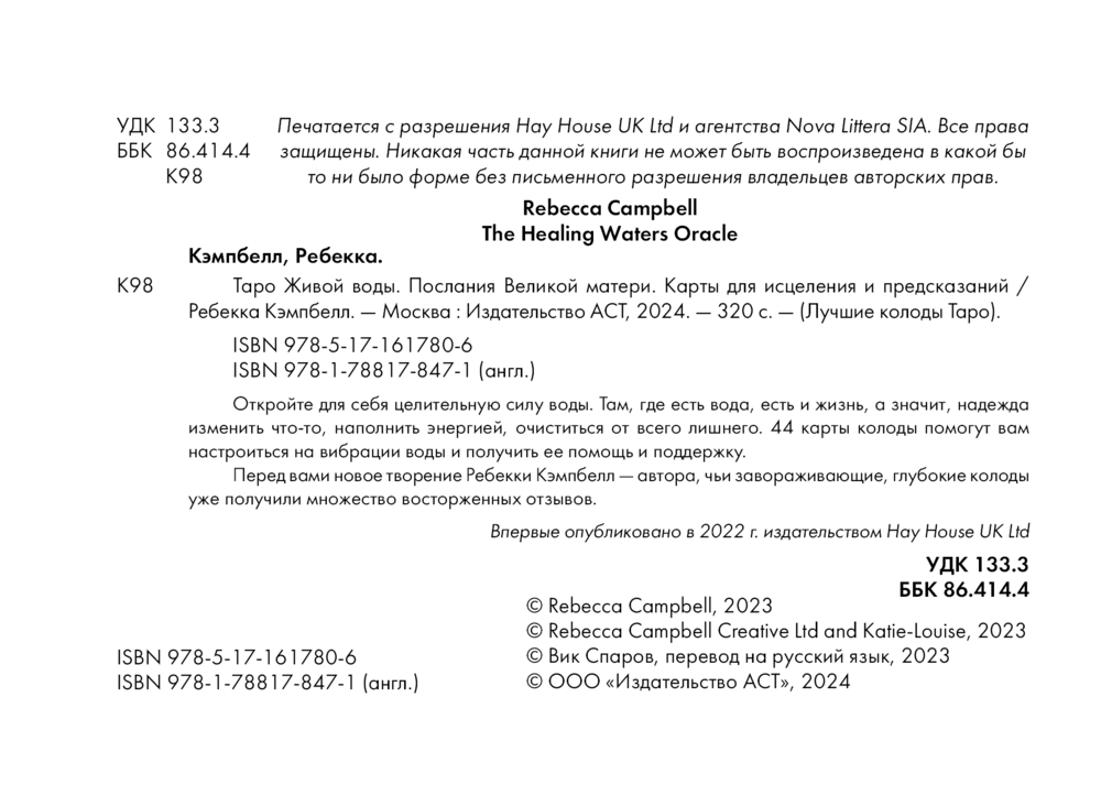 Известно, что главный источник жизни на планете – это вода. Однако она хранит в себе намного больше, чем мы можем представить. Вода – это стихия, наполненная священной целебной энергией и древними знаниями. Колода в ваших руках позволит прикоснуться к ним, заглянуть глубоко внутрь себя и слиться воедино с природой – получить доступ к энергиям, которые нас окружают.