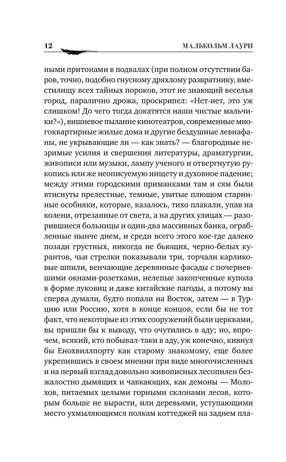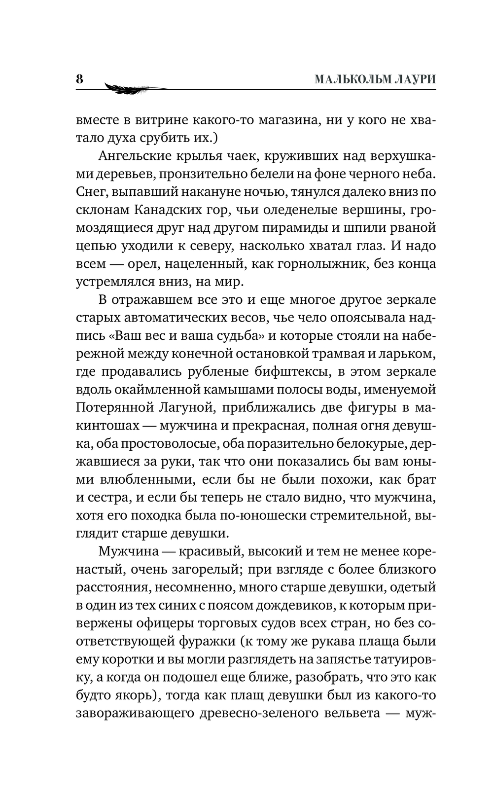 У Малькольма Лаури выдалась довольно трудная, но насыщенная жизнь. Писатель много ездил по свету, и пережитые им приключения, испытания и путешествия нередко служили источниками идей для его повестей и рассказов. В прозе Лаури переплетаются сюжеты о счастье любви и о красотах природы, о мимолетности жизни и о тяготах пребывания на земле, ее отличает пронзительность сюжетов и яркость, красочность и образность описаний.
