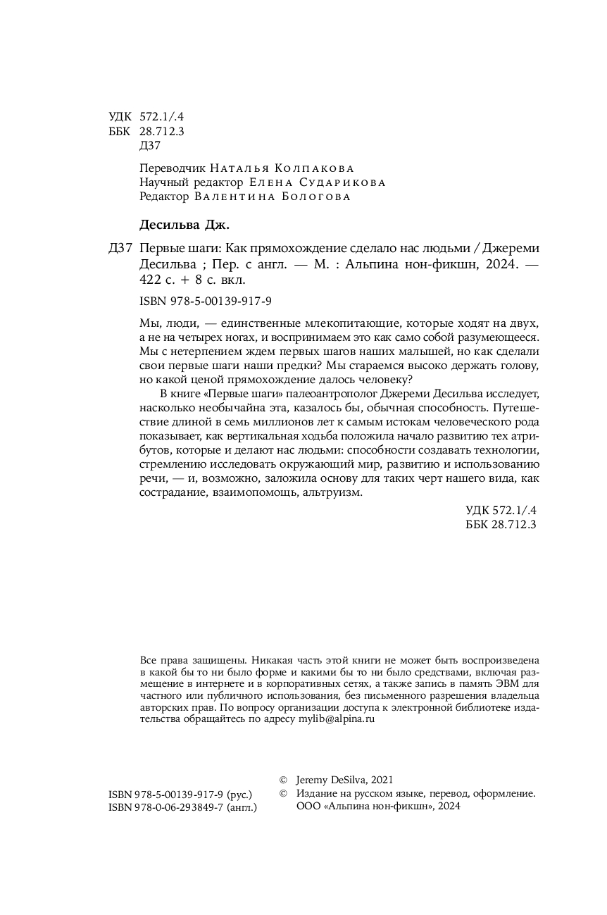 В книге "Первые шаги" палеоантрополог Джереми Десильва исследует, насколько необычайна эта, казалось бы, обычная способность. Путешествие длиной в семь миллионов лет к самым истокам человеческого рода показывает, как вертикальная ходьба положила начало развитию тех атрибутов, которые и делают нас людьми: способности создавать технологии, стремлению исследовать окружающий мир, развитию и использованию речи, – и, возможно, заложила основу для таких черт нашего вида, как сострадание, взаимопомощь, альтруизм.