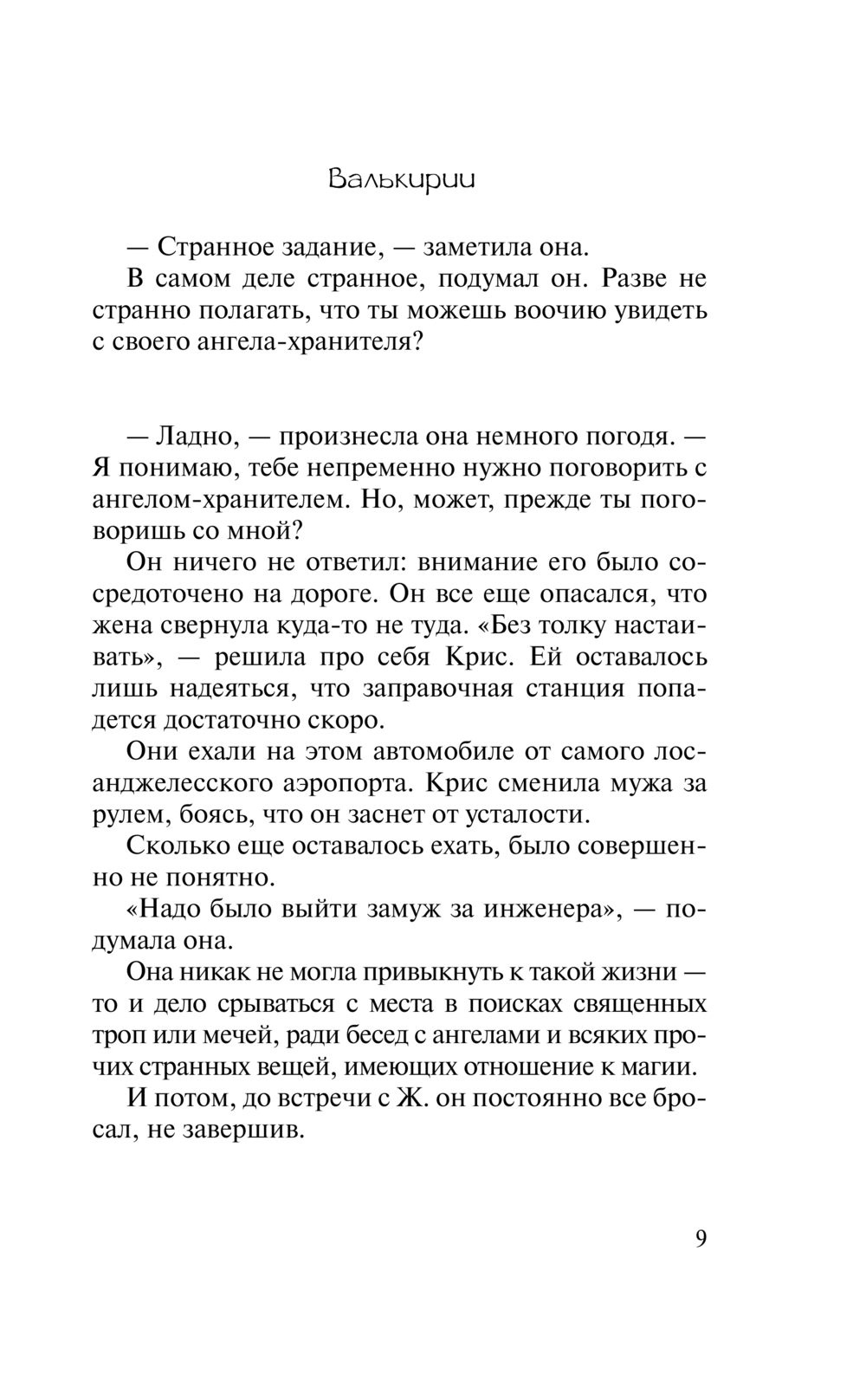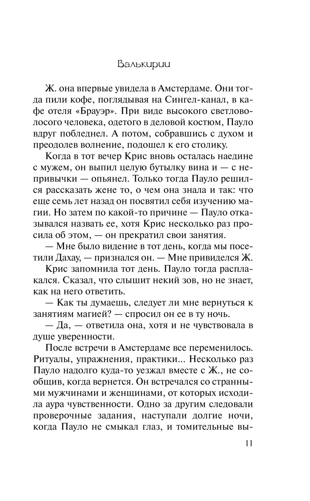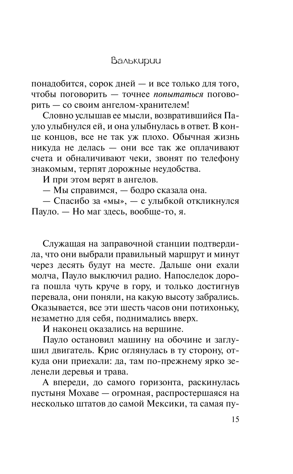 В романе "Валькирии" Пауло Коэльо откровенно рассказывает о борьбе со своими страхами и сомнениями. Вместе с женой Кристиной он отправляется в пустыню Мохаве, где они встречают валькирий, загадочных женщин-воинов, и в течение сорока дней пытаются с их помощью обрести взаимопонимание, а главное забыть о прошлом и поверить в будущее.