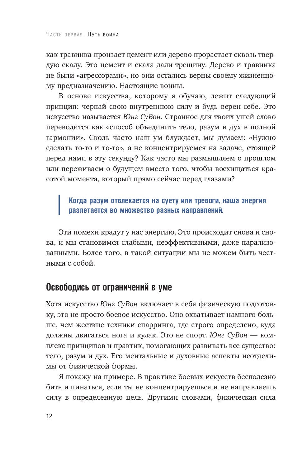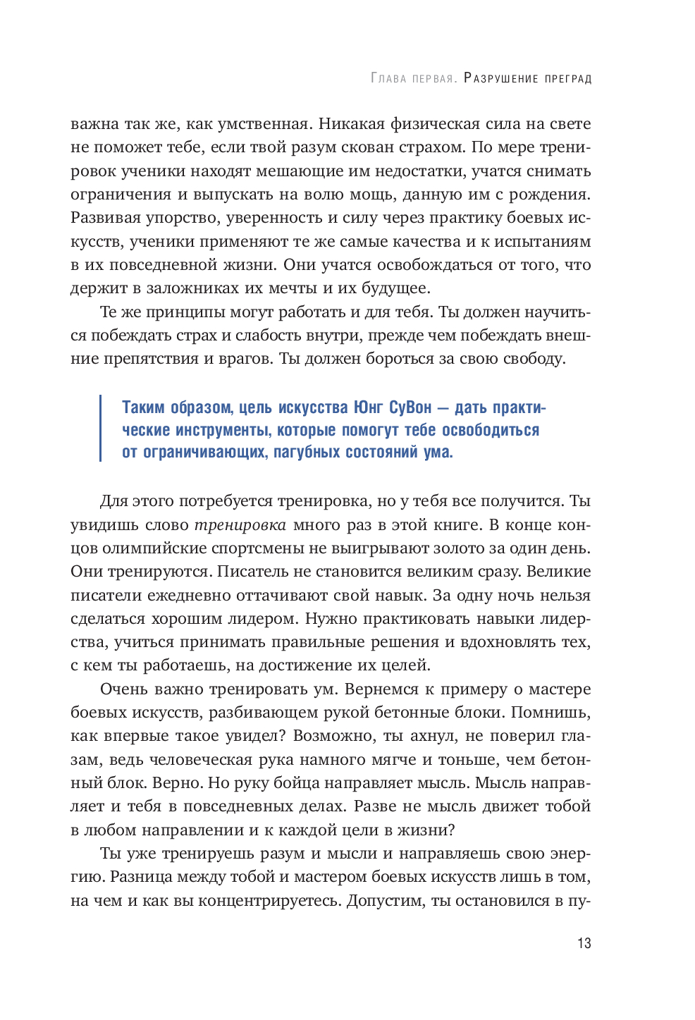 Чтобы избавиться от оков мышления, Ким предлагает обратиться к древнему искусству Юнг СуВон. Это комплекс принципов и практик, которые развивают разум, тело и дух. Всего за 7 шагов вы освоите технику контроля над мыслями и эмоциями, научитесь превращать недостатки в преимущества и выпустите на волю силу, данную вам с рождения.