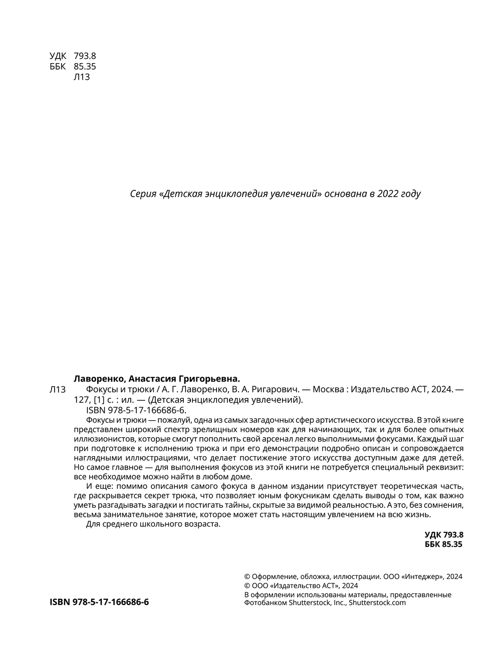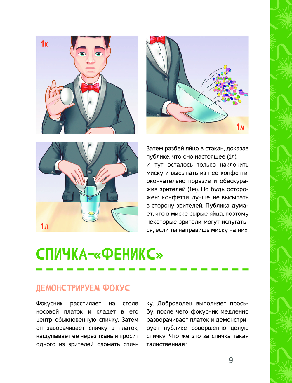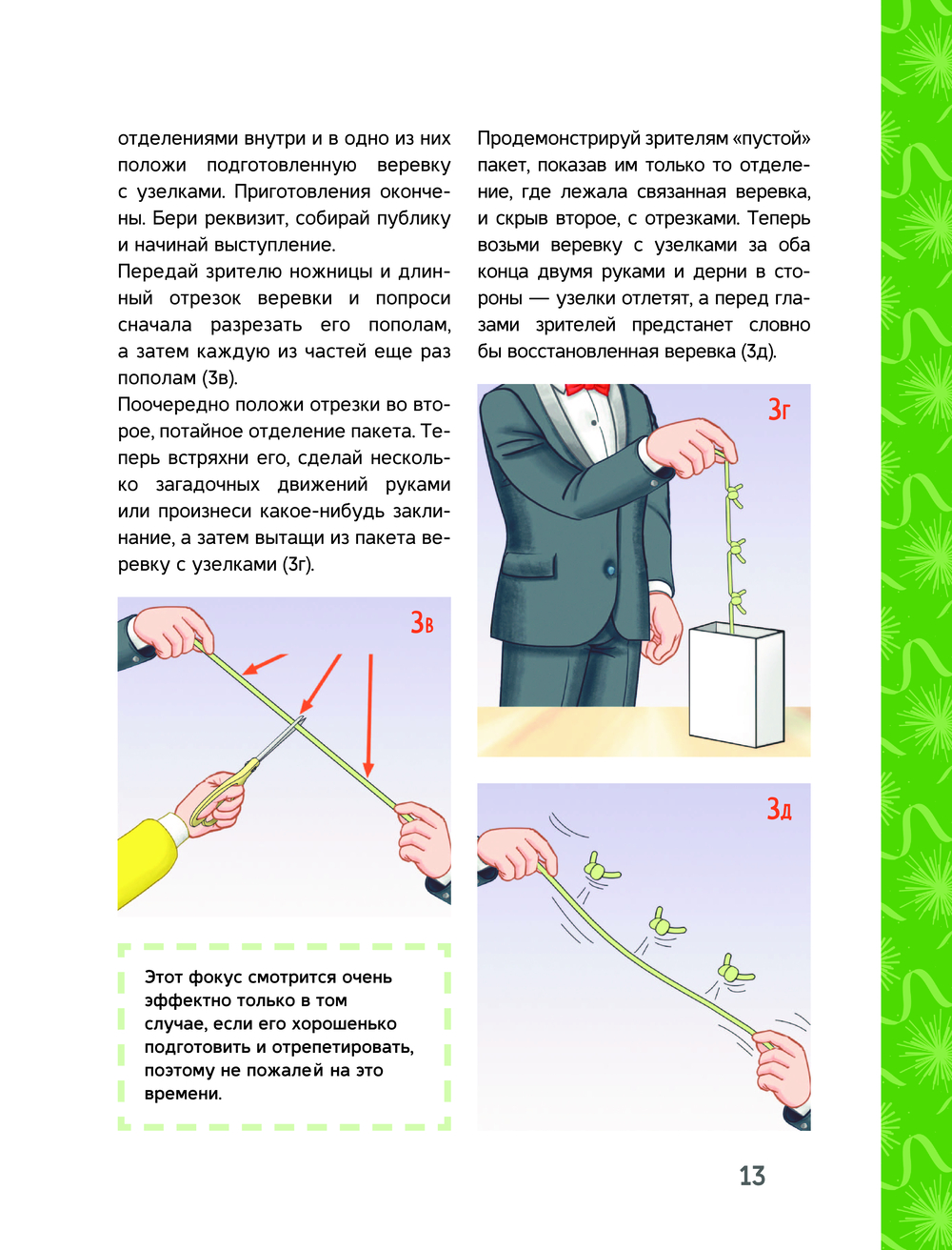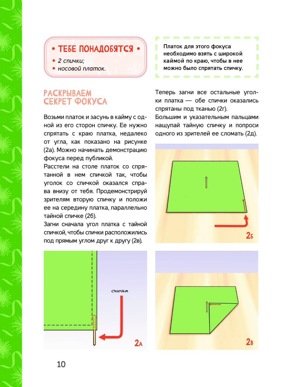 И еще: помимо описания самого фокуса в данном издании присутствует теоретическая часть, гдераскрывается секрет трюка, что позволяет юным фокусникам сделать выводы о том, как важно уметь разгадывать загадки и постигать тайны, скрытые за видимой реальностью. А это, без сомнения, весьма занимательное занятие, которое может стать настоящим увлечением на всю жизнь.