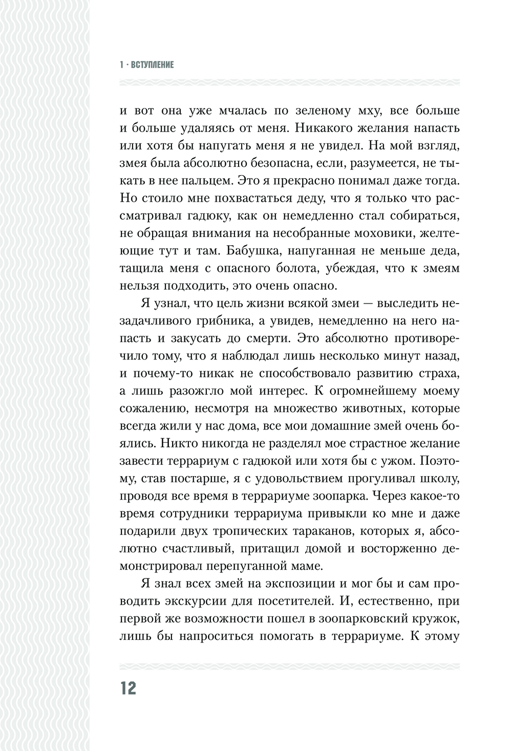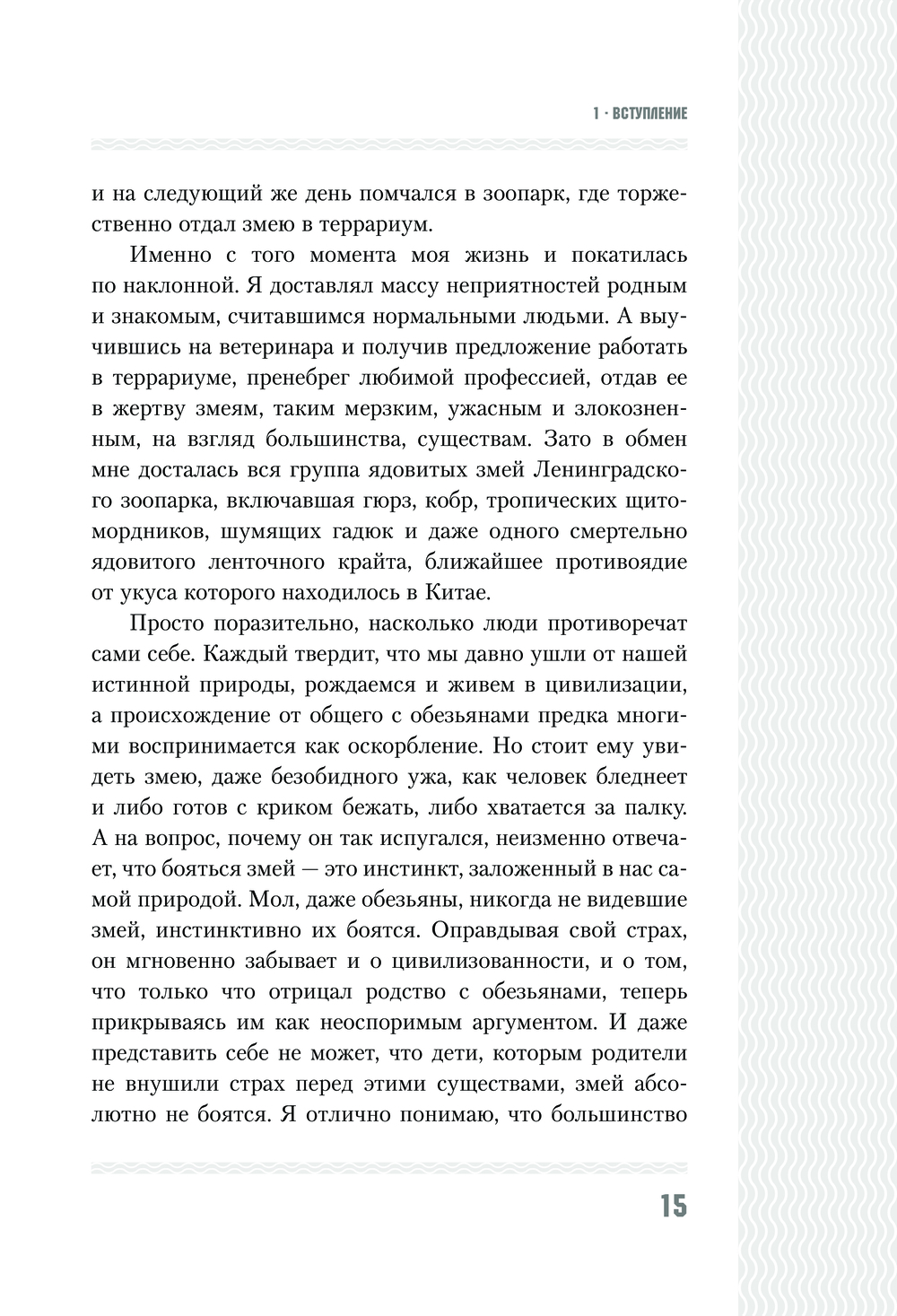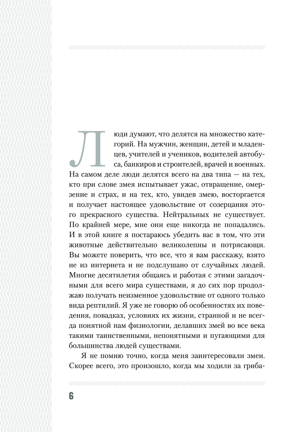 Люди думают, что делятся на множество категорий. На самом деле люди делятся всего на два типа – на тех, кто при слове змея испытывает ужас, отвращение, омерзение и страх, и на тех, кто, увидев змею, восторгается и получает настоящее удовольствие от созерцания этого прекрасного существа.