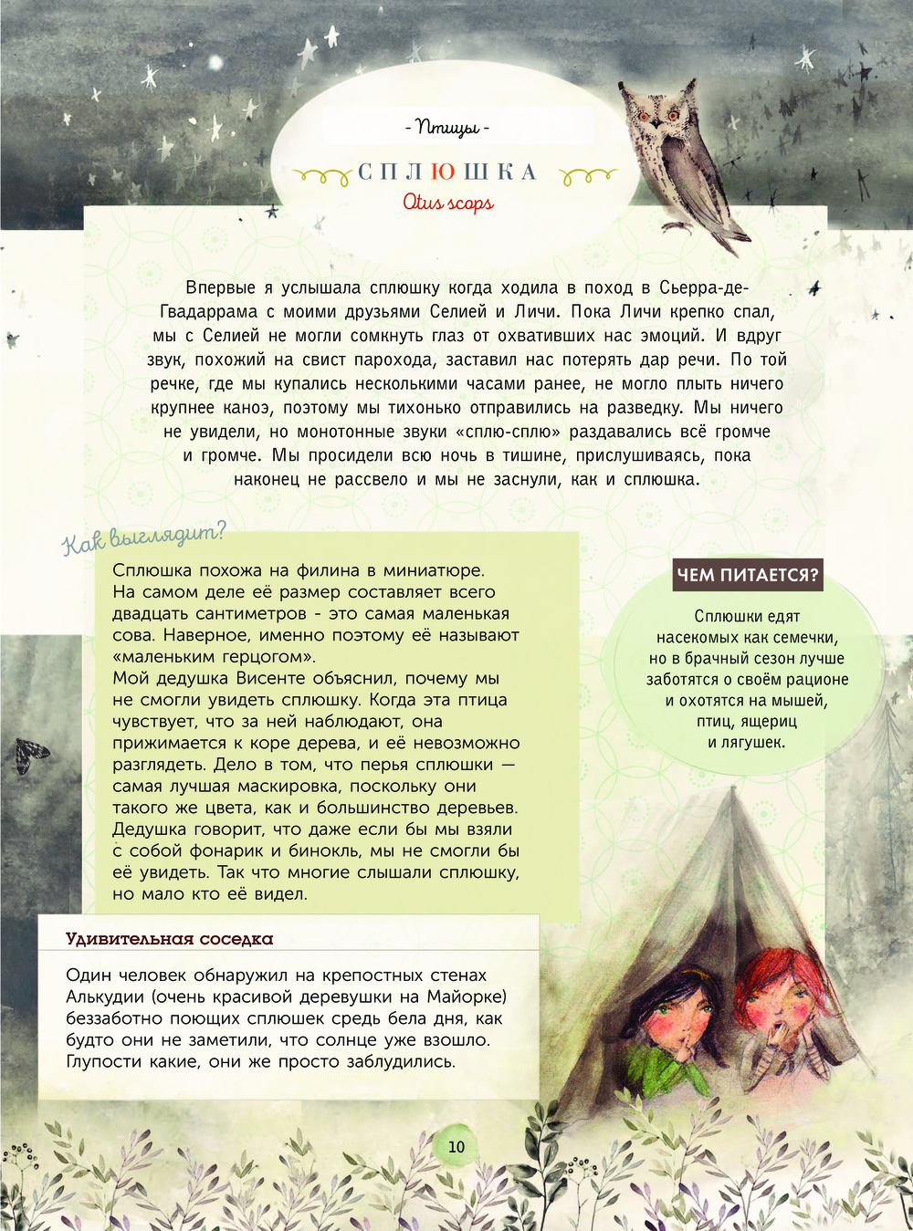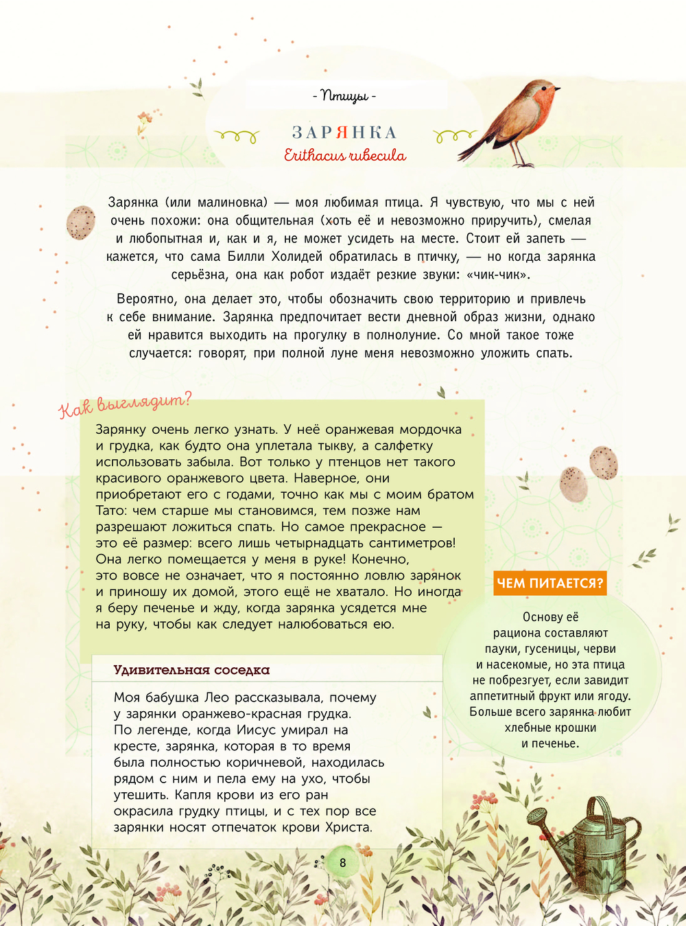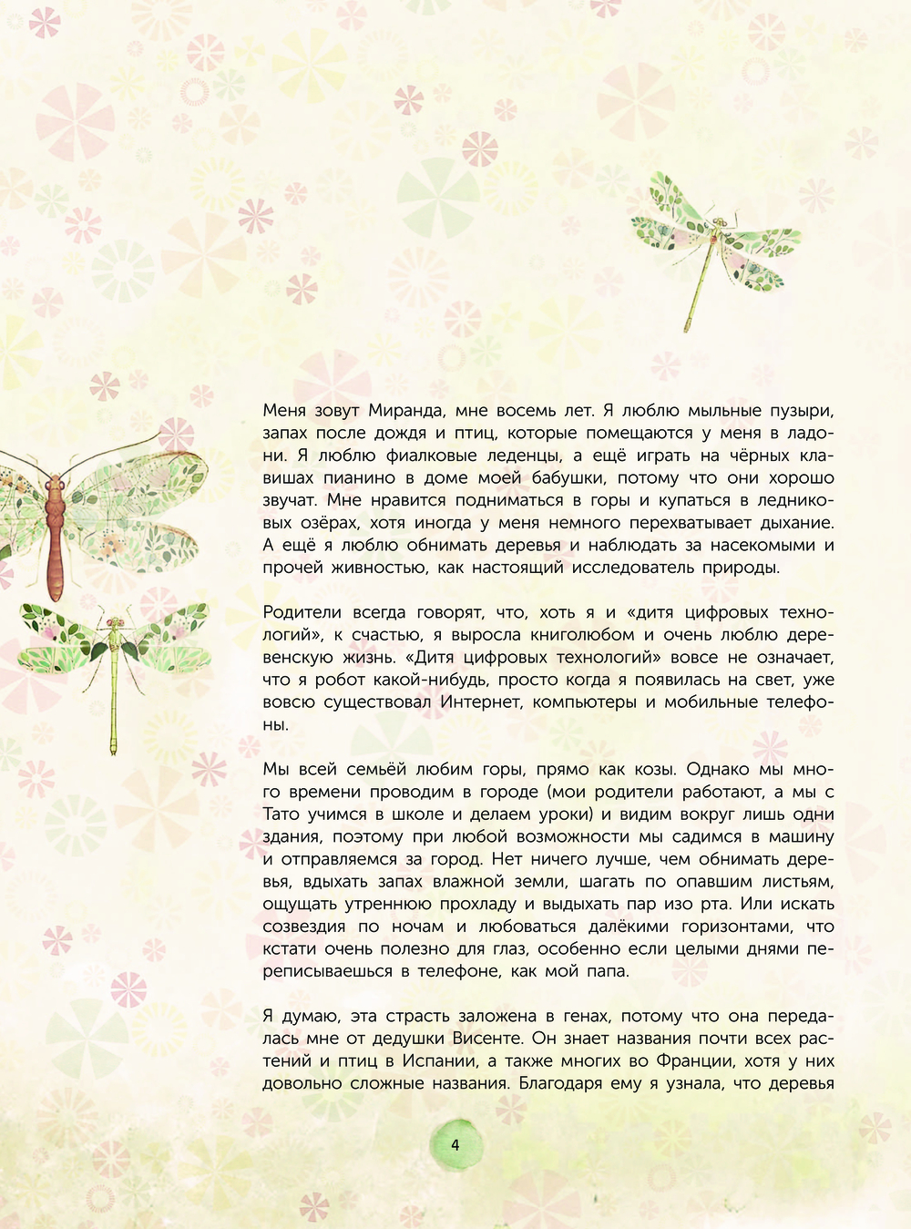 В этой книге Миранда, восьмилетняя девочка из Испании, с юмором и в увлекательной форме познакомит читателя с птицами, насекомыми и деревьями со всего света: от привычных нам светлячков и сороки до оливы и миндаля. Подробные описания сопровождаются вставками, рассказывающими о культуре, быте и языке Испании. Удивительные акварельные иллюстрации понравятся и детям, и взрослым, а также помогут узнать, как выглядят растения и животные, о которых идёт речь в книге.