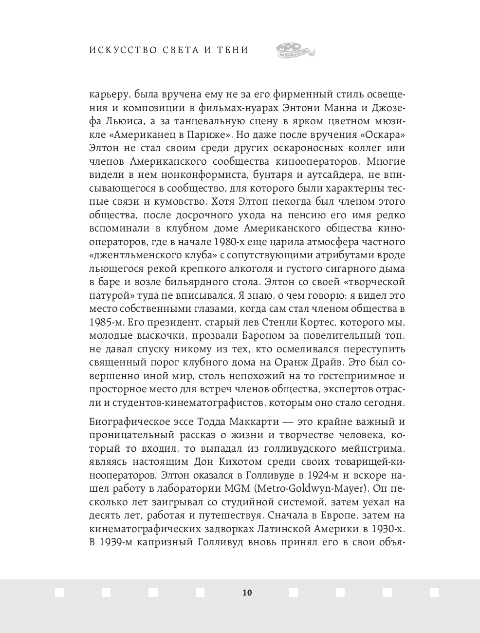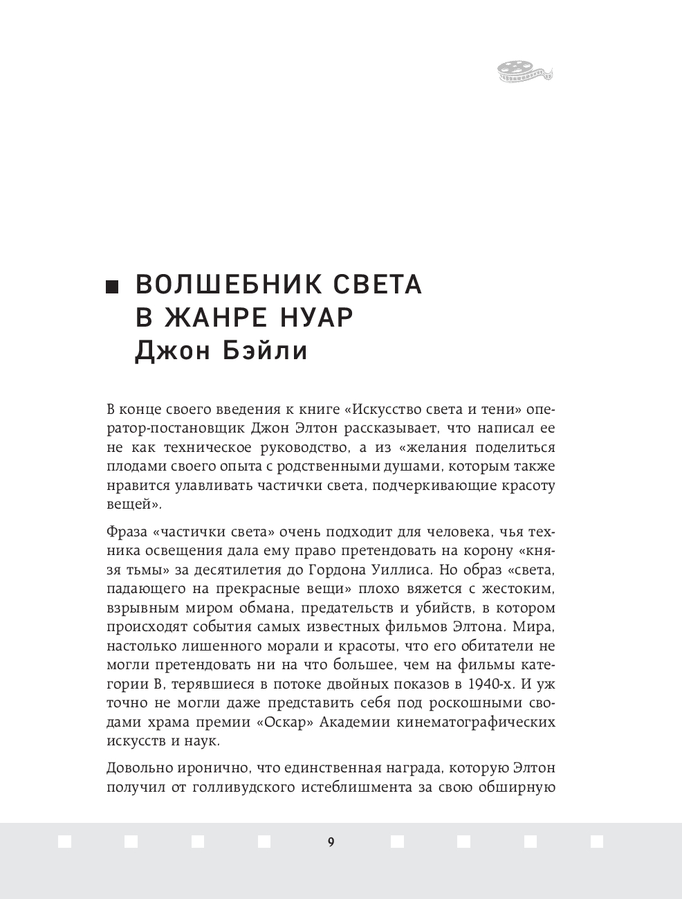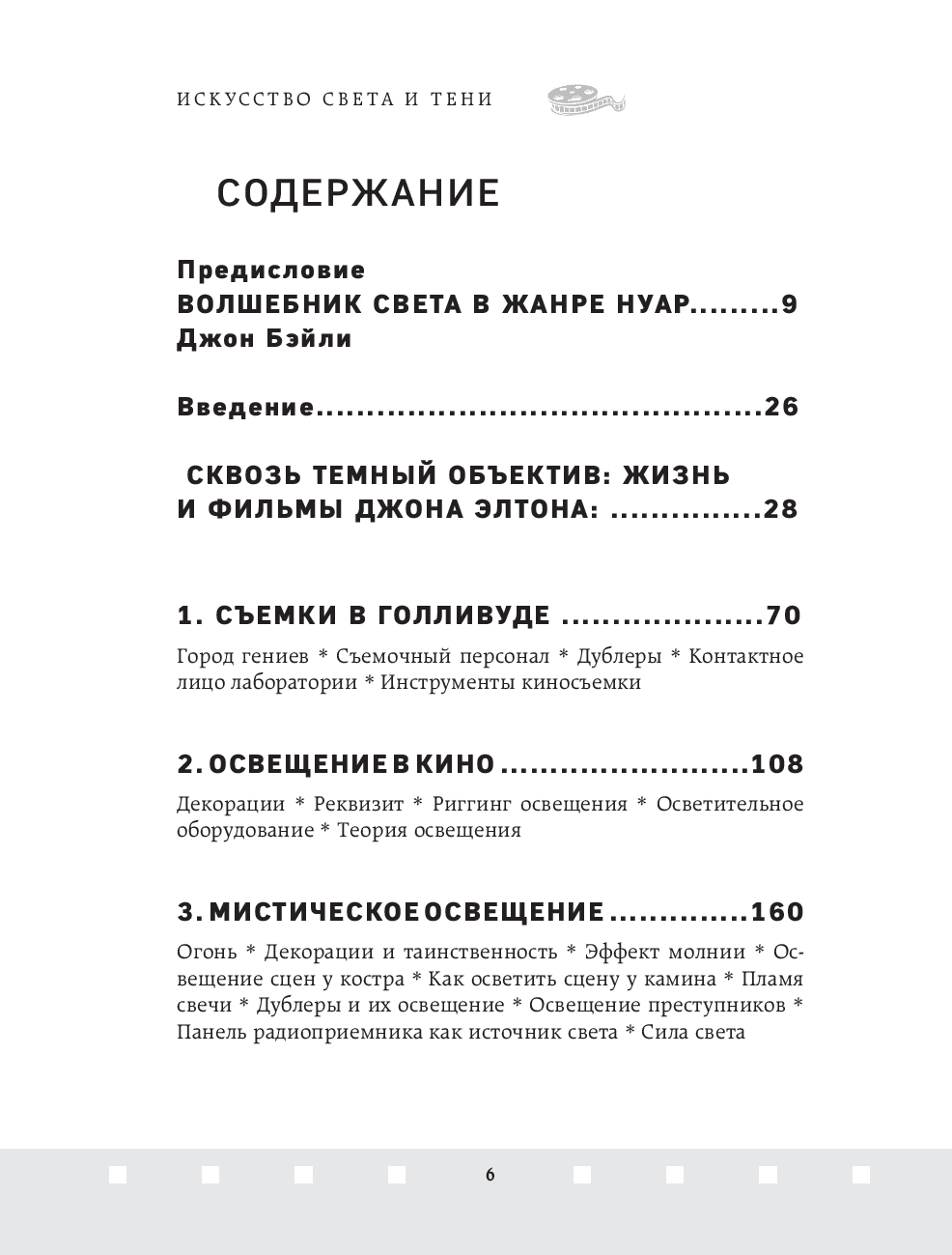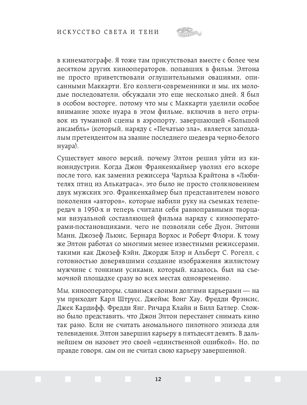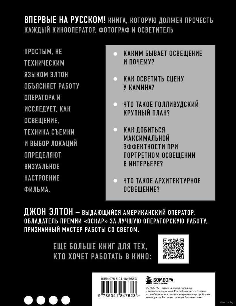 Джон Элтон – один из величайших операторов старого Голливуда, обладатель Оскара 1952 года за лучшую операторскую работу. Элтон оказал неоспоримое влияние на операторское искусство и заработал репутацию одного из непревзойдённых мастеров Голливуда, благодаря своей технике работы со светом и тенью. В этой книге он простым и не понятным языком объясняет работу оператора и объясняет, как с помощью света, выбора локации и техники съемки можно влиять на общее настроение фильма.