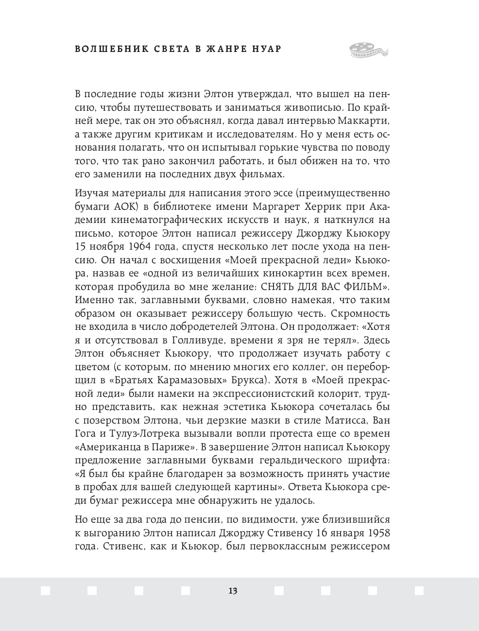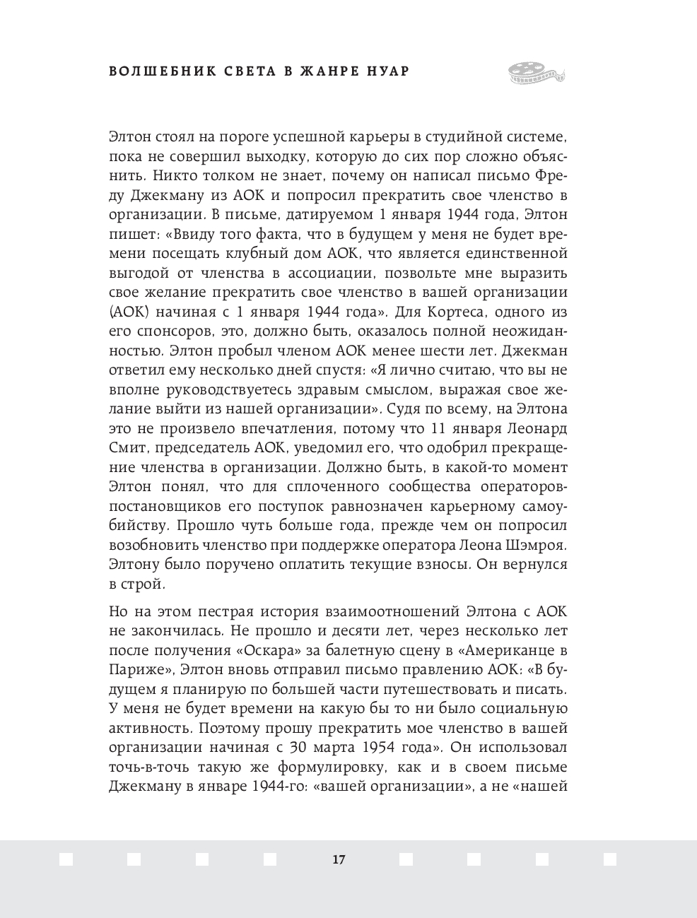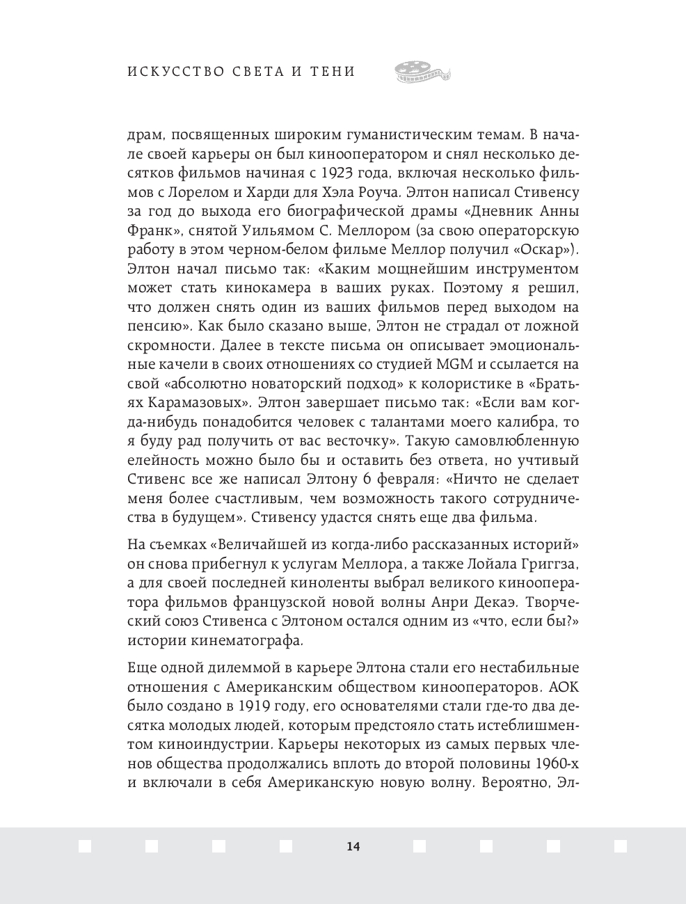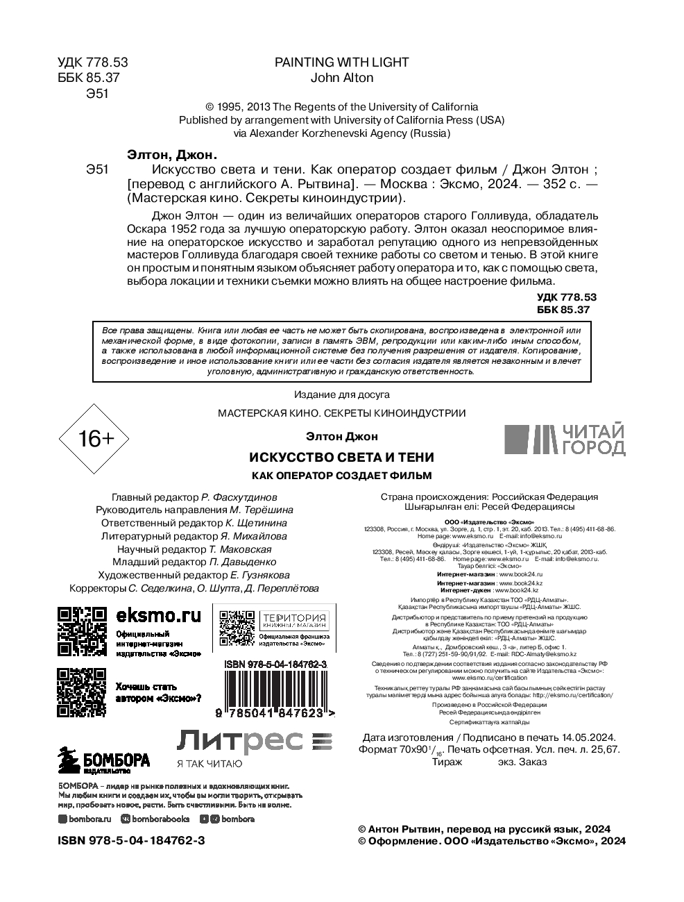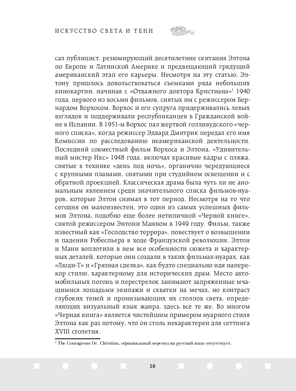 Джон Элтон – один из величайших операторов старого Голливуда, обладатель Оскара 1952 года за лучшую операторскую работу. Элтон оказал неоспоримое влияние на операторское искусство и заработал репутацию одного из непревзойдённых мастеров Голливуда, благодаря своей технике работы со светом и тенью. В этой книге он простым и не понятным языком объясняет работу оператора и объясняет, как с помощью света, выбора локации и техники съемки можно влиять на общее настроение фильма.