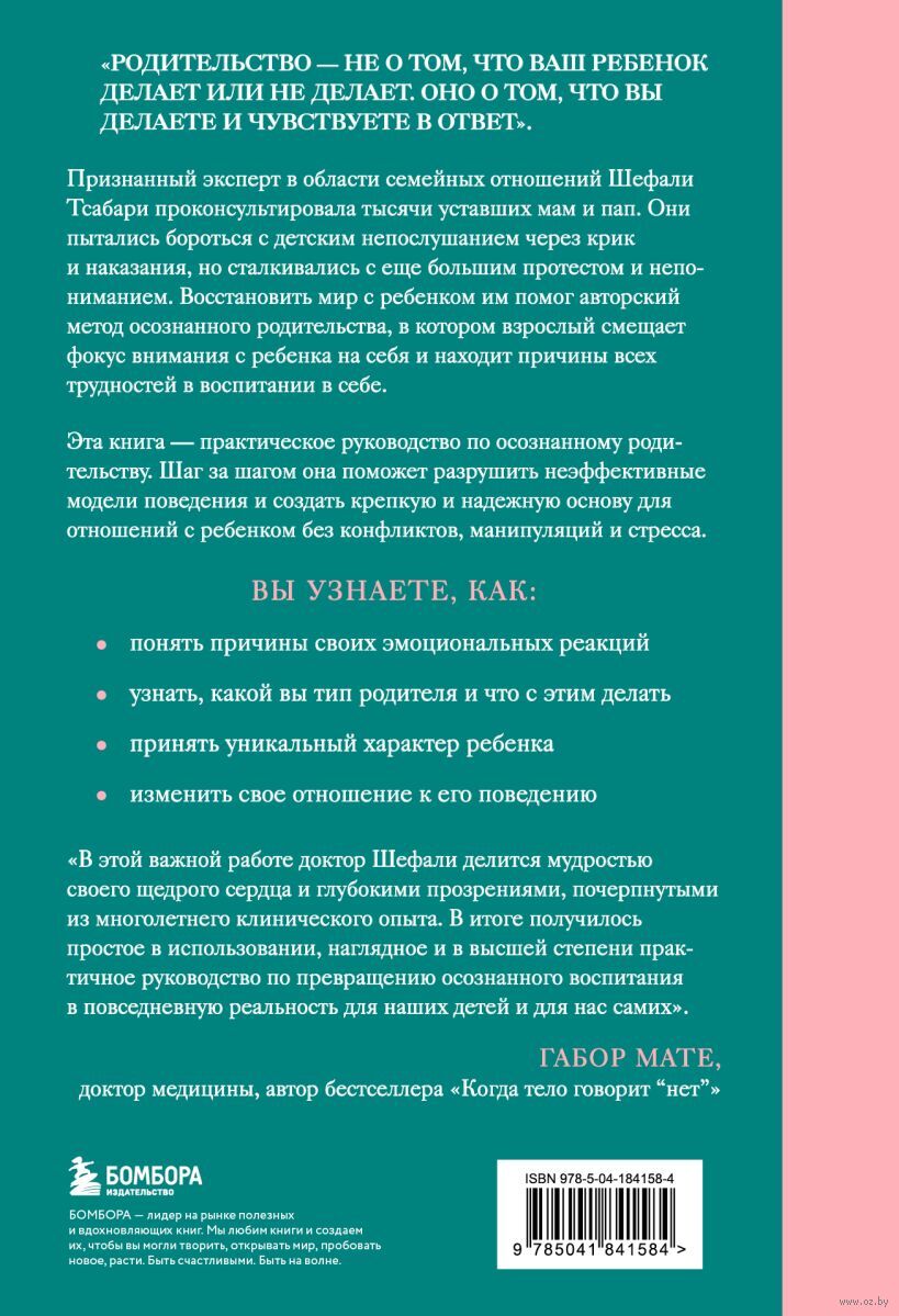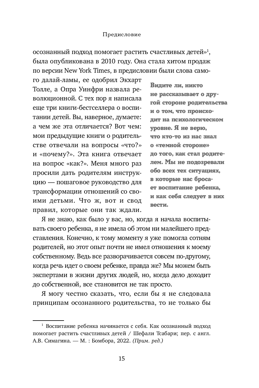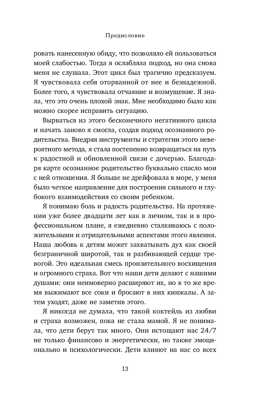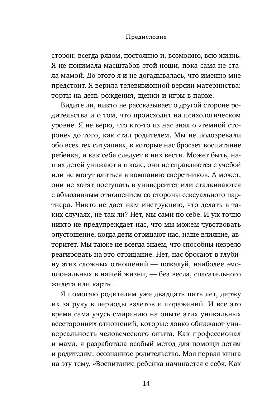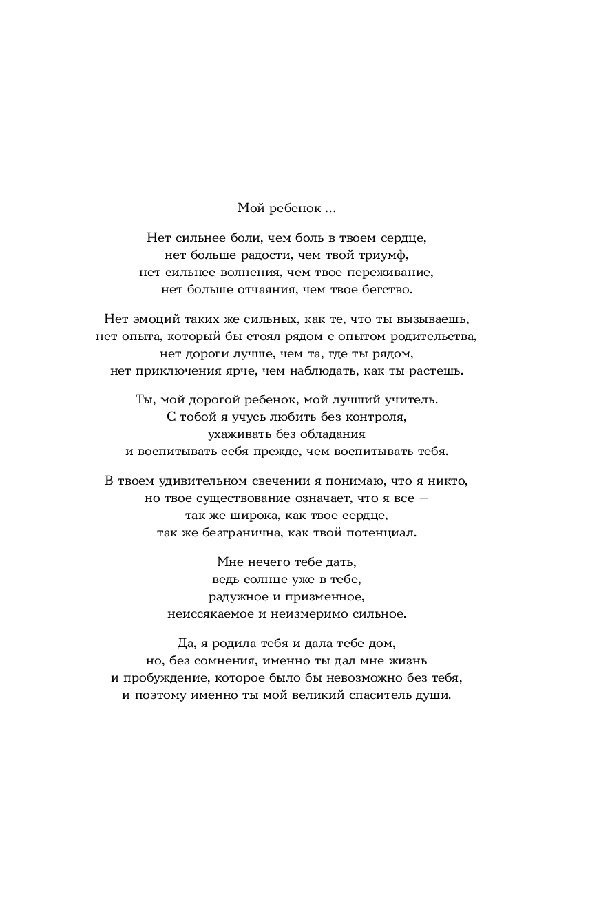 Книга Шефали Тсабари, признанного эксперта в области семейных отношений, – практическое руководство по осознанному родительству. Шаг за шагом она поможет разрушить неэффективные модели поведения и создать крепкую и надежную основу для отношений с ребенком без конфликтов, манипуляций и стресса. На примерах из практики и собственной жизни, психолог объясняет, как наш внутренний мир влияет на выстраивание контакта с ребенком и почему так важно в первую очередь воспитывать самого себя.