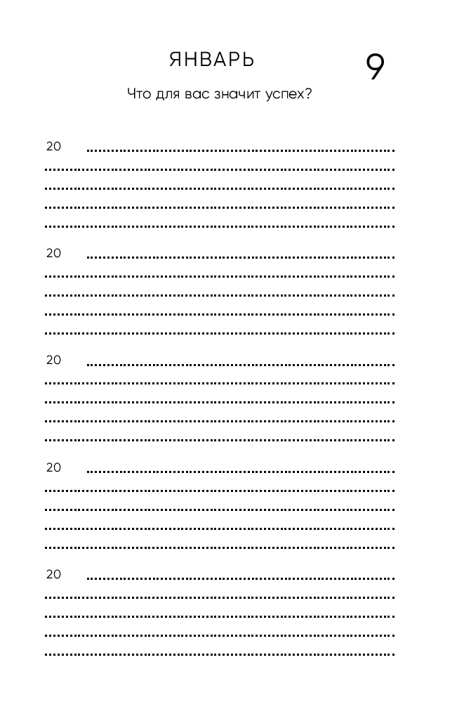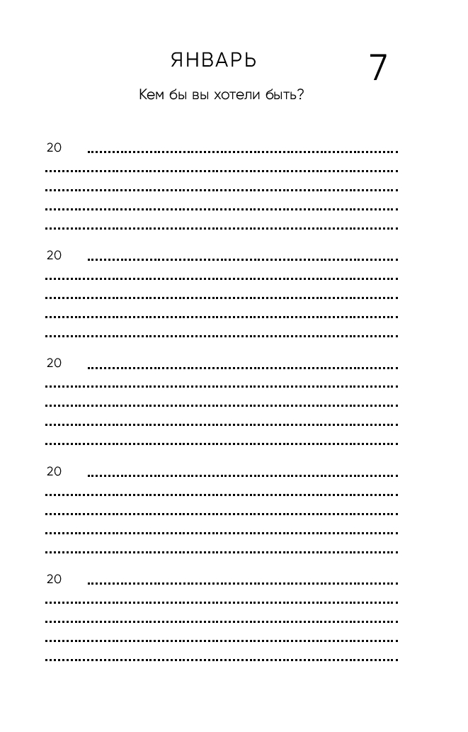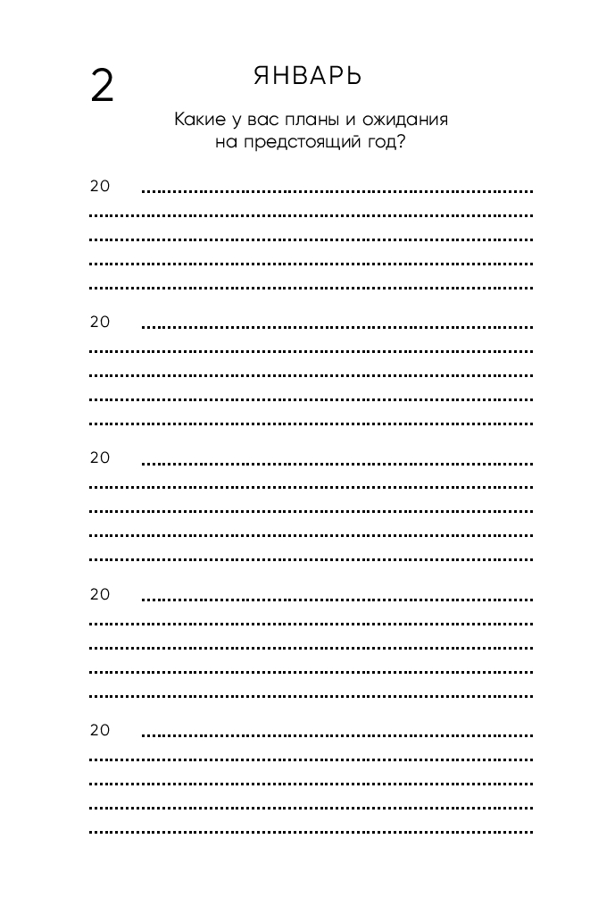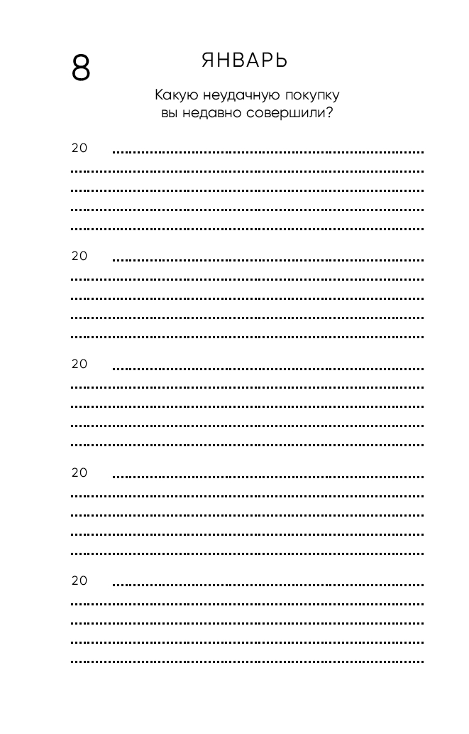 Дневник не привязан к конкретному году и дню недели – начинайте в любой день. Просто найдите сегодняшнее число, укажите год и каждый день заполняйте всего по 3-4 строчки, а когда год закончится, продолжайте вести дневник с первого листа. Таким образом, вы отвечаете на одни и те же вопросы в разные годы и наблюдаете, как меняется ваша жизнь и мысли.