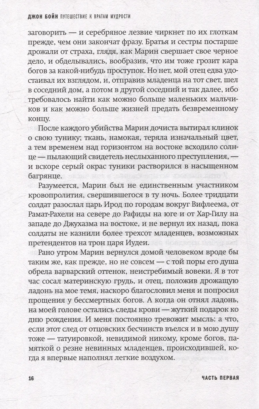 Эта история начинается с семьи. Отец, мать и два сына, у одного в крови жестокость и воинственность отца, у другого – артистизм и мягкость матери. Один сын уйдет. Второй останется. Постепенно к этим четверым начнут присоединяться все новые и новые персонажи, поступки которых будут направлять и определять судьбы двух братьев. Но это лишь начало... Истории двух братьев и всех, кто с ними связан, протянутся через две тысячи лет. В Палестине в год Рождества Христова начинается грандиозное путешествие – через эпохи, страны, культуры и даже звезды. Мир меняется, меняются ландшафты, одежда, манера говорить, не меняются лишь люди, они все так же обуреваемы страстями, теряют голову от любви, одержимы местью, они слабы, сильны, глупы, благородны, жестоки, сострадательны... "Мир, который нас окружает, может меняться, но наши чувства остаются неизменными", – скажет герой Бойна, пытаясь отыскать путь к вратам, за которыми сияет недоступная людям мудрость.