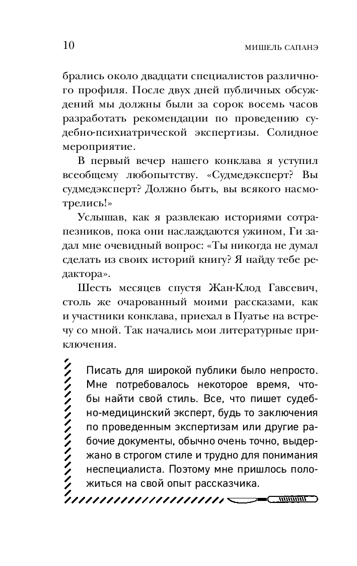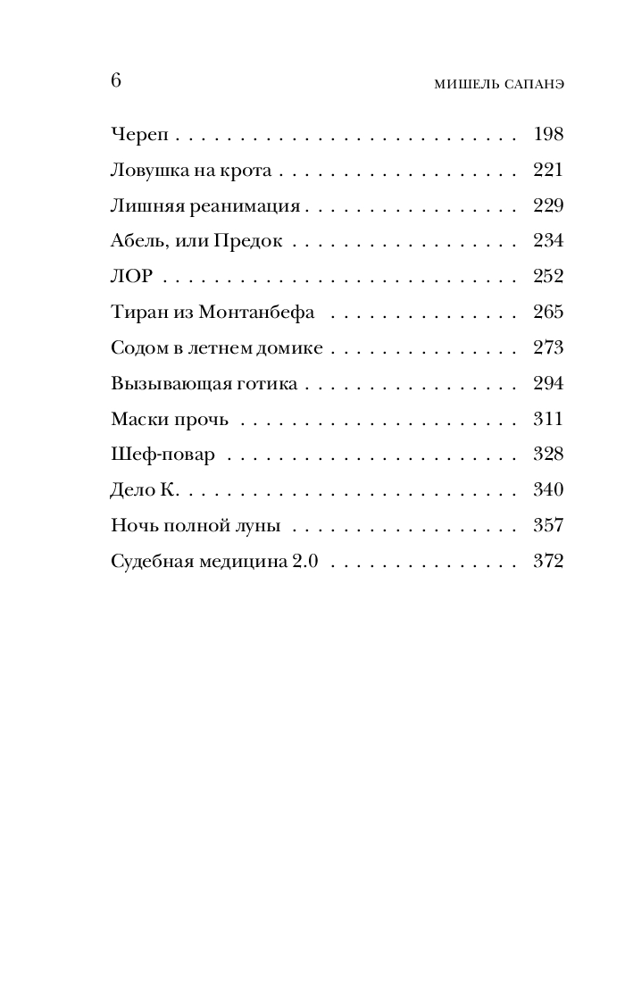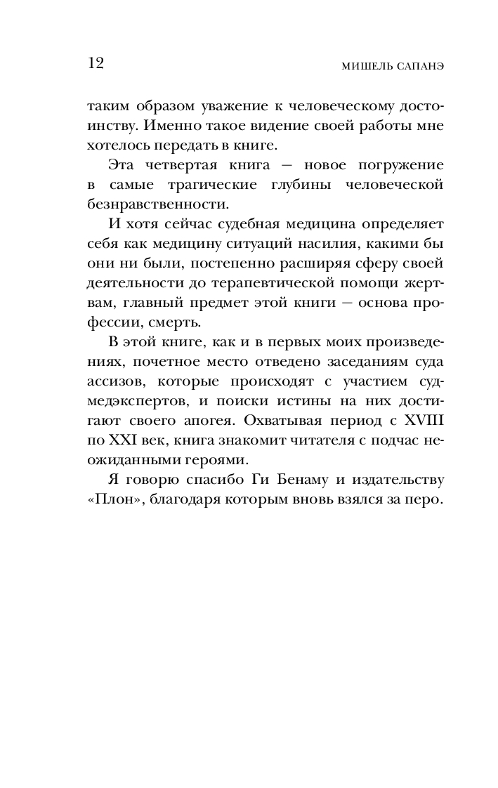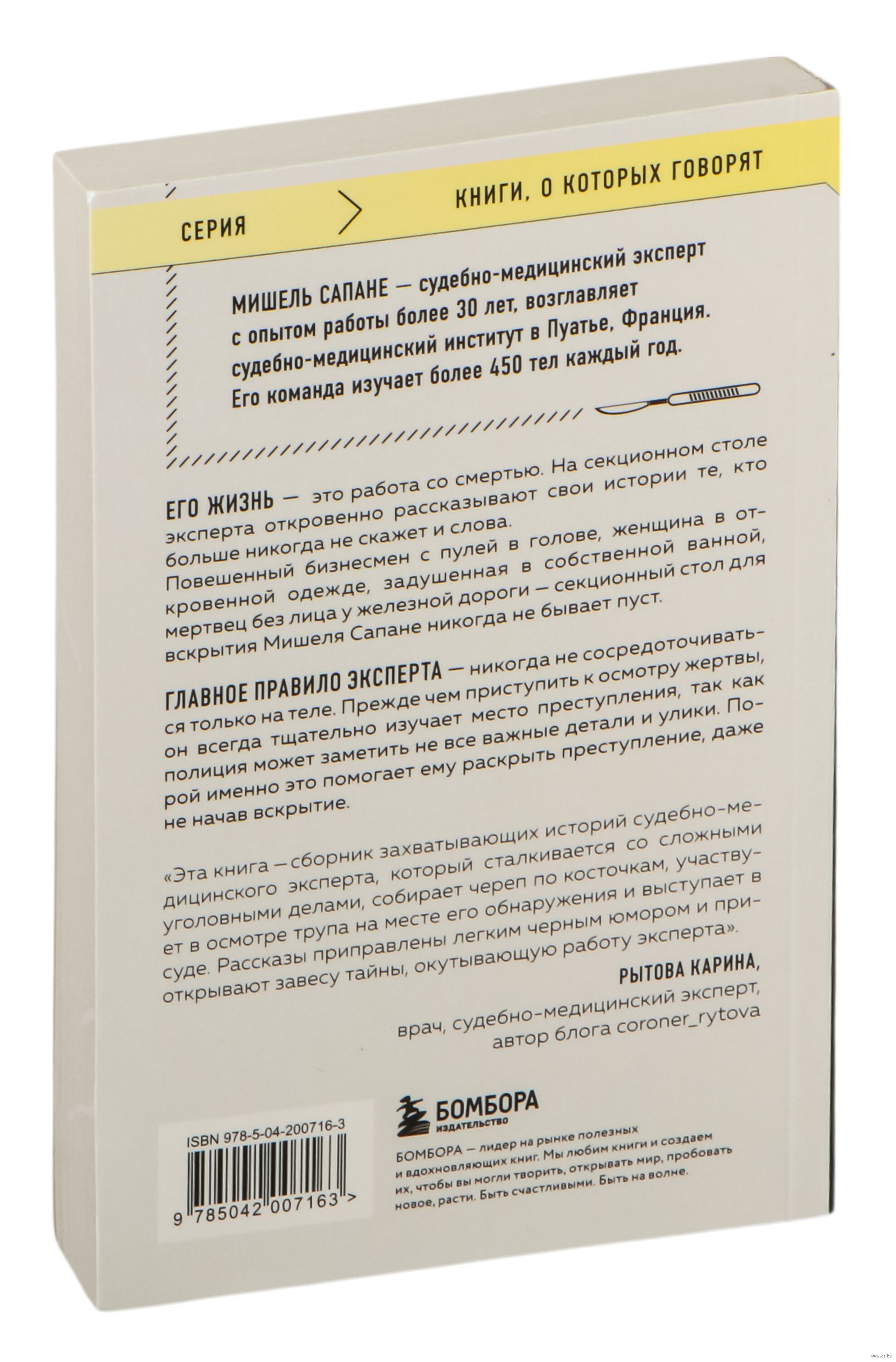 Что общего у повешенного бизнесмена с пулей в голове и обескровленного мужчины со снятым скальпом на железнодорожных путях? И того, и другого будет вскрывать Мишель Сапане в своем секционном зале в Пуатье на западе Франции. Этот неординарный судмедэксперт работает в своей профессии с 1987 года и повидал уже многое. Каждое свое дело он описывает с изящным темным юмором, погружая читателя в рутинные для судмедэксперта приключения.
