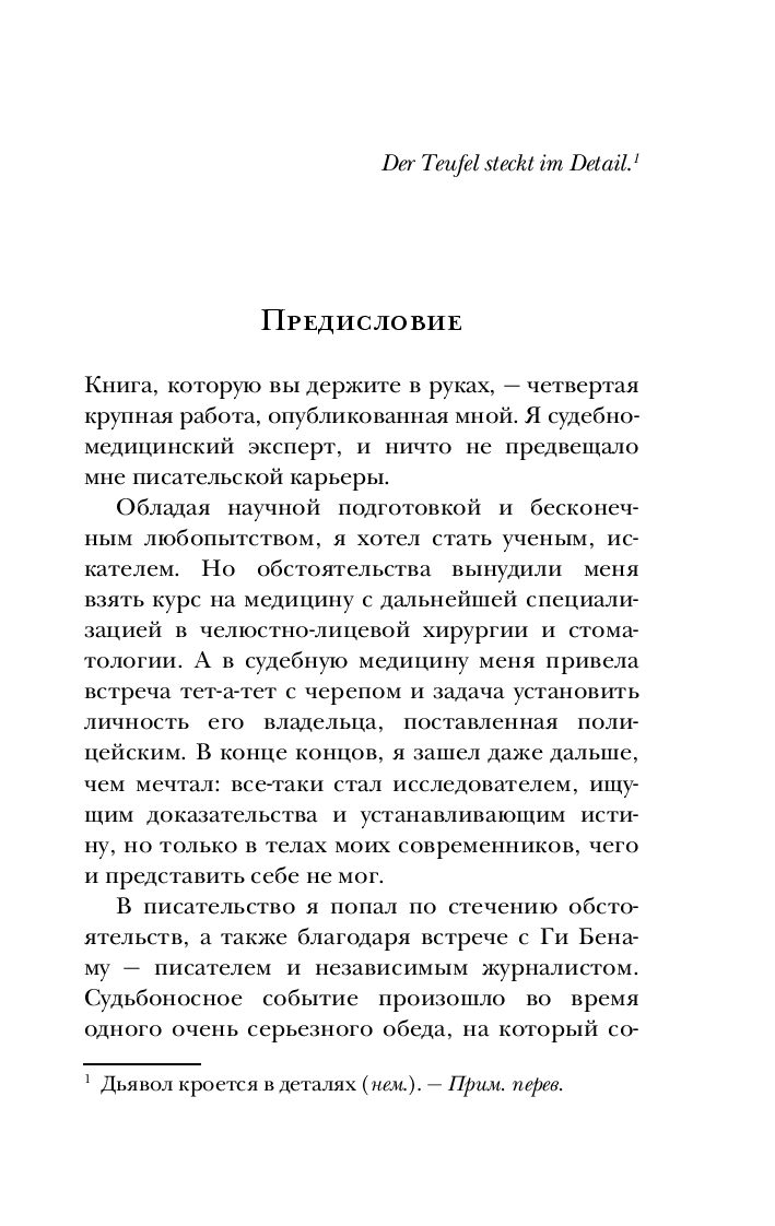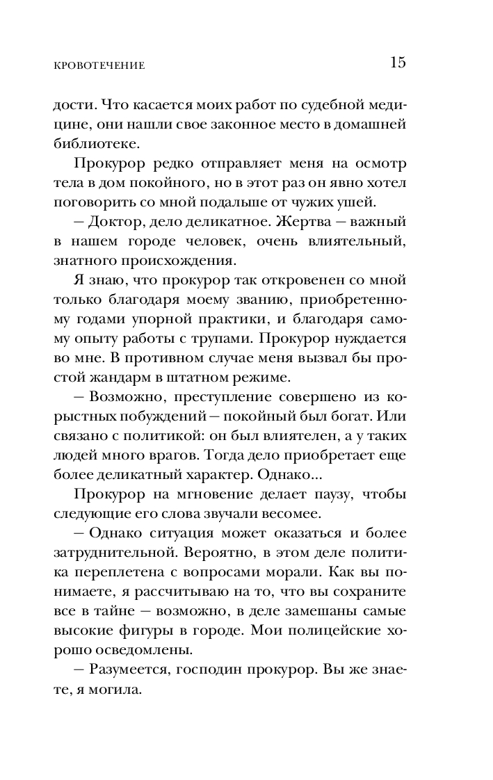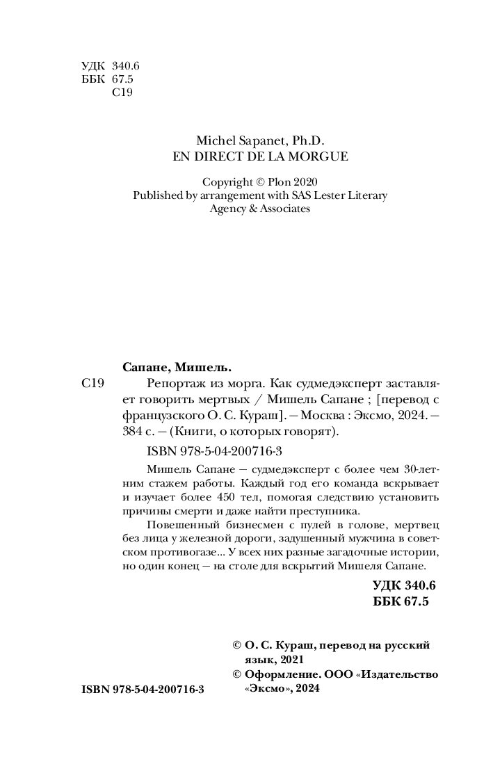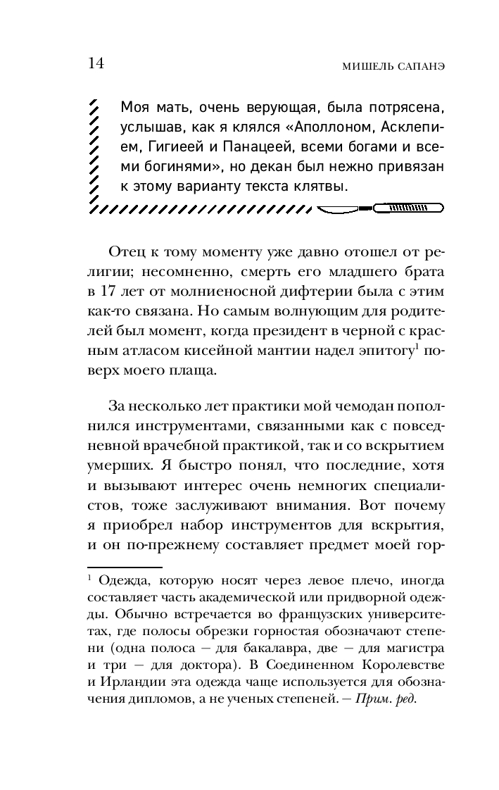 Что общего у повешенного бизнесмена с пулей в голове и обескровленного мужчины со снятым скальпом на железнодорожных путях? И того, и другого будет вскрывать Мишель Сапане в своем секционном зале в Пуатье на западе Франции. Этот неординарный судмедэксперт работает в своей профессии с 1987 года и повидал уже многое. Каждое свое дело он описывает с изящным темным юмором, погружая читателя в рутинные для судмедэксперта приключения.