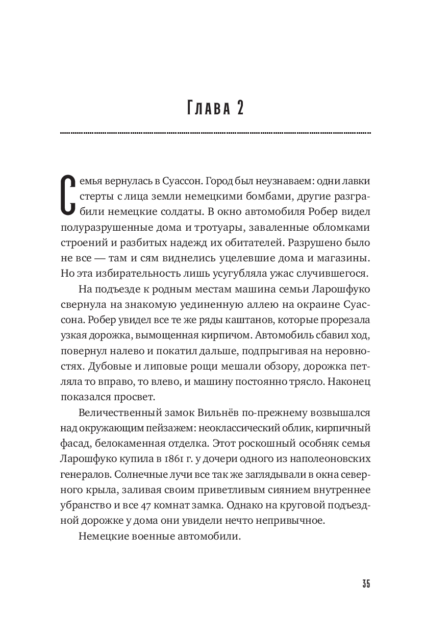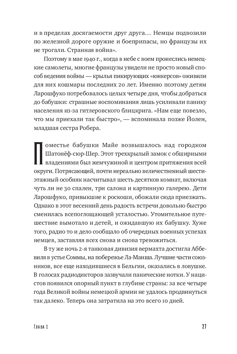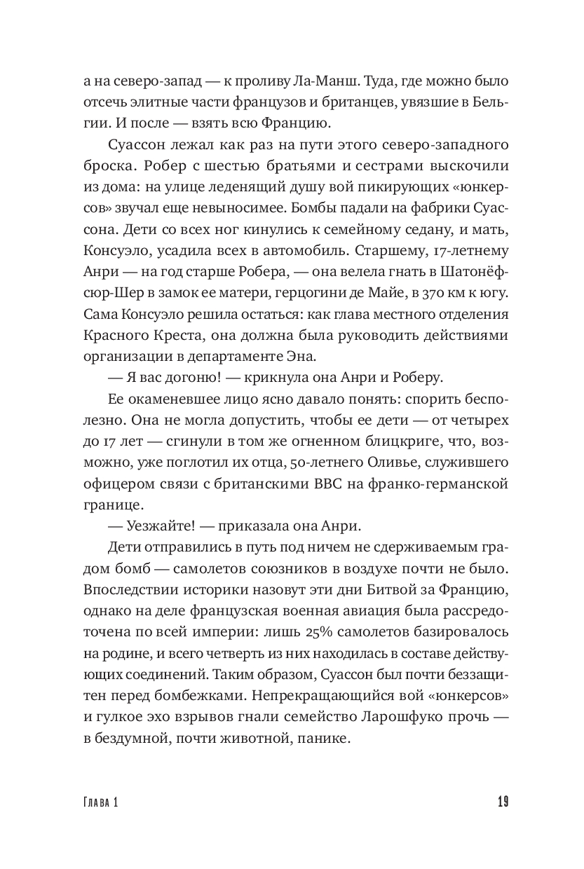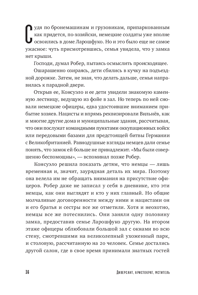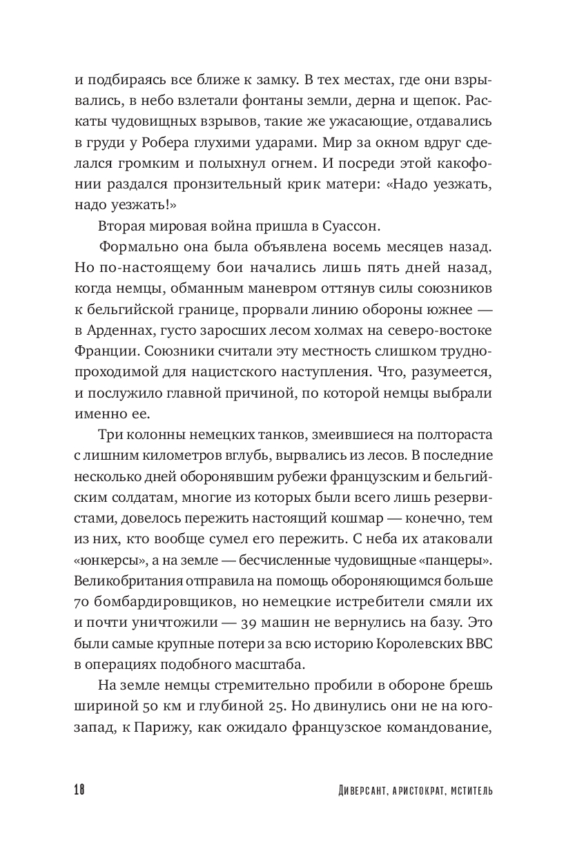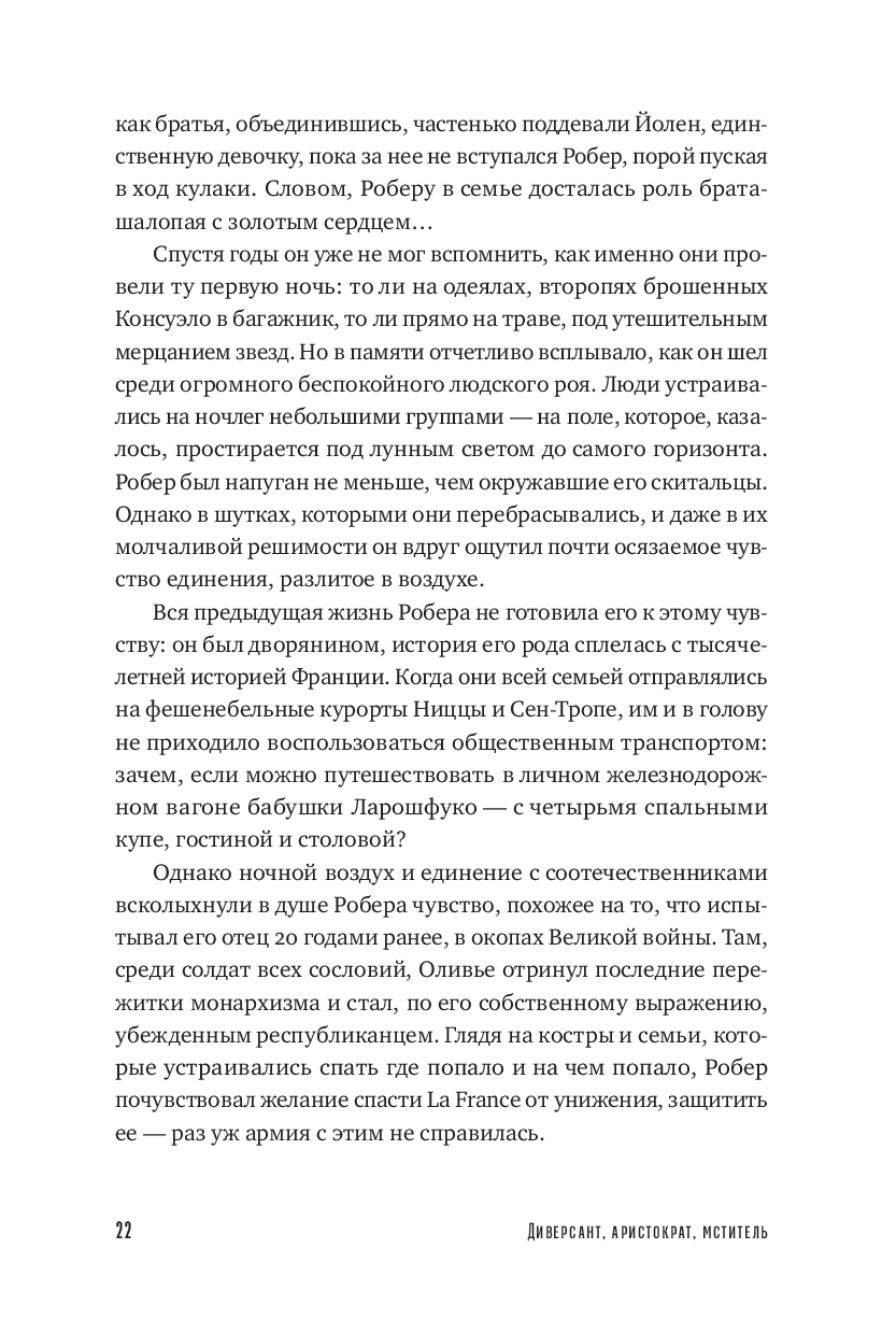 Автор прослеживает трансформацию: подросток, который средненько учился и обожал лазать по стенам фамильного замка, превращается в бесстрашного подпольщика, агента британской разведки, непревзойденного мастера диверсий и маскировки. Ларошфуко взрывал немецкие поезда, дважды спасся от смертной казни, даже наряжался монахиней. Впрочем, эта книга – не легкомысленный экшн-триллер. Она не только о приключениях юного графа-диверсанта, она о трагедии Франции, расколотой и униженной оккупацией. Робер и его товарищи по Сопротивлению показывают, что раздавленная и опозоренная нация способна и на нечто светлое и благородное. Даже если таких, как они, всего два процента.