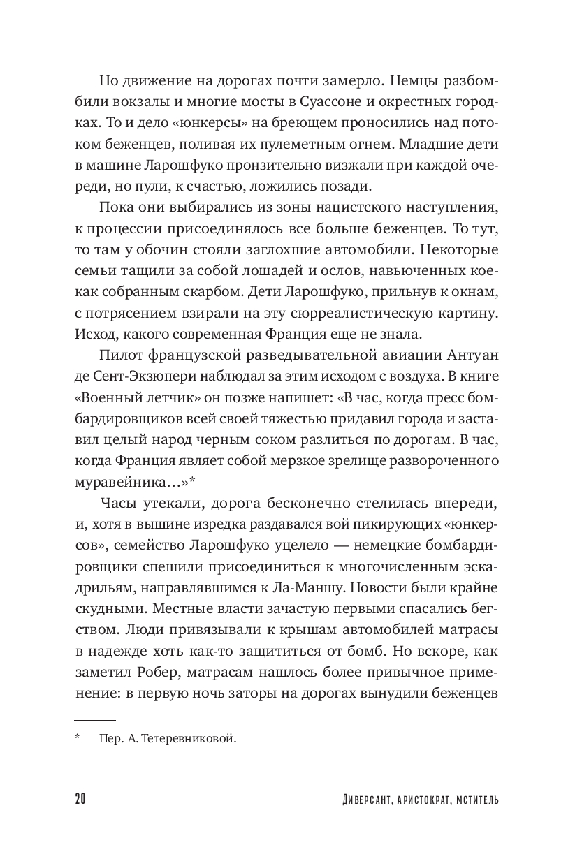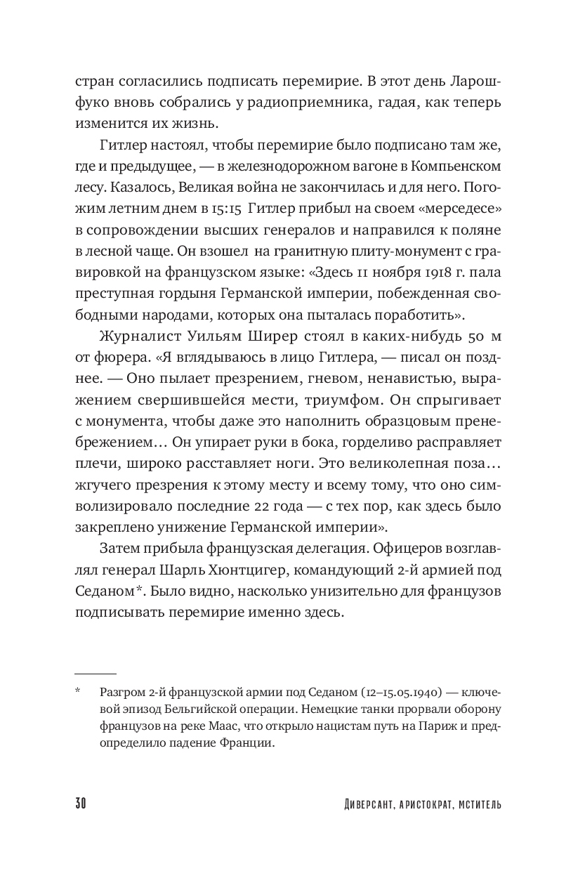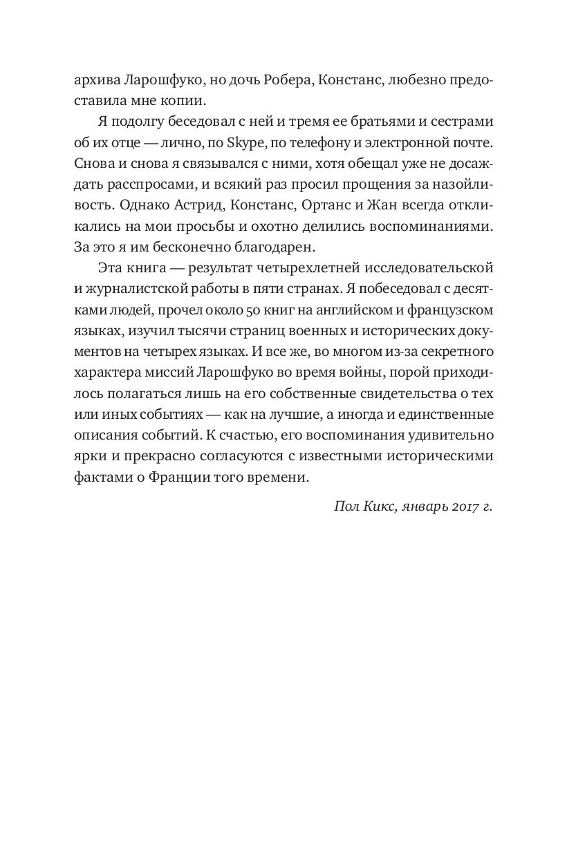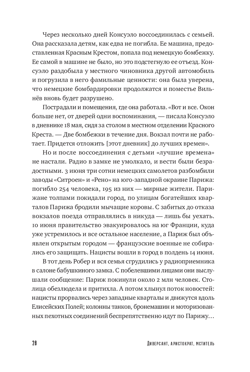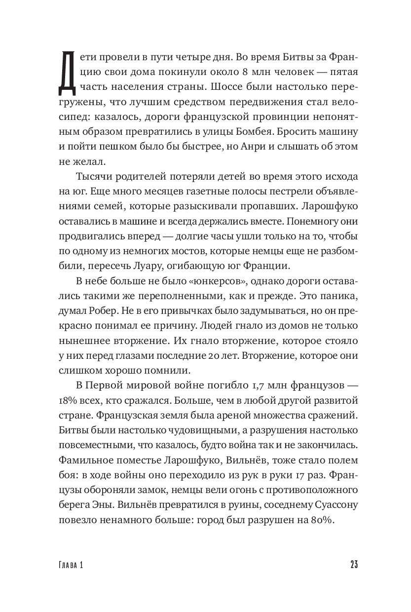 Автор прослеживает трансформацию: подросток, который средненько учился и обожал лазать по стенам фамильного замка, превращается в бесстрашного подпольщика, агента британской разведки, непревзойденного мастера диверсий и маскировки. Ларошфуко взрывал немецкие поезда, дважды спасся от смертной казни, даже наряжался монахиней. Впрочем, эта книга – не легкомысленный экшн-триллер. Она не только о приключениях юного графа-диверсанта, она о трагедии Франции, расколотой и униженной оккупацией. Робер и его товарищи по Сопротивлению показывают, что раздавленная и опозоренная нация способна и на нечто светлое и благородное. Даже если таких, как они, всего два процента.