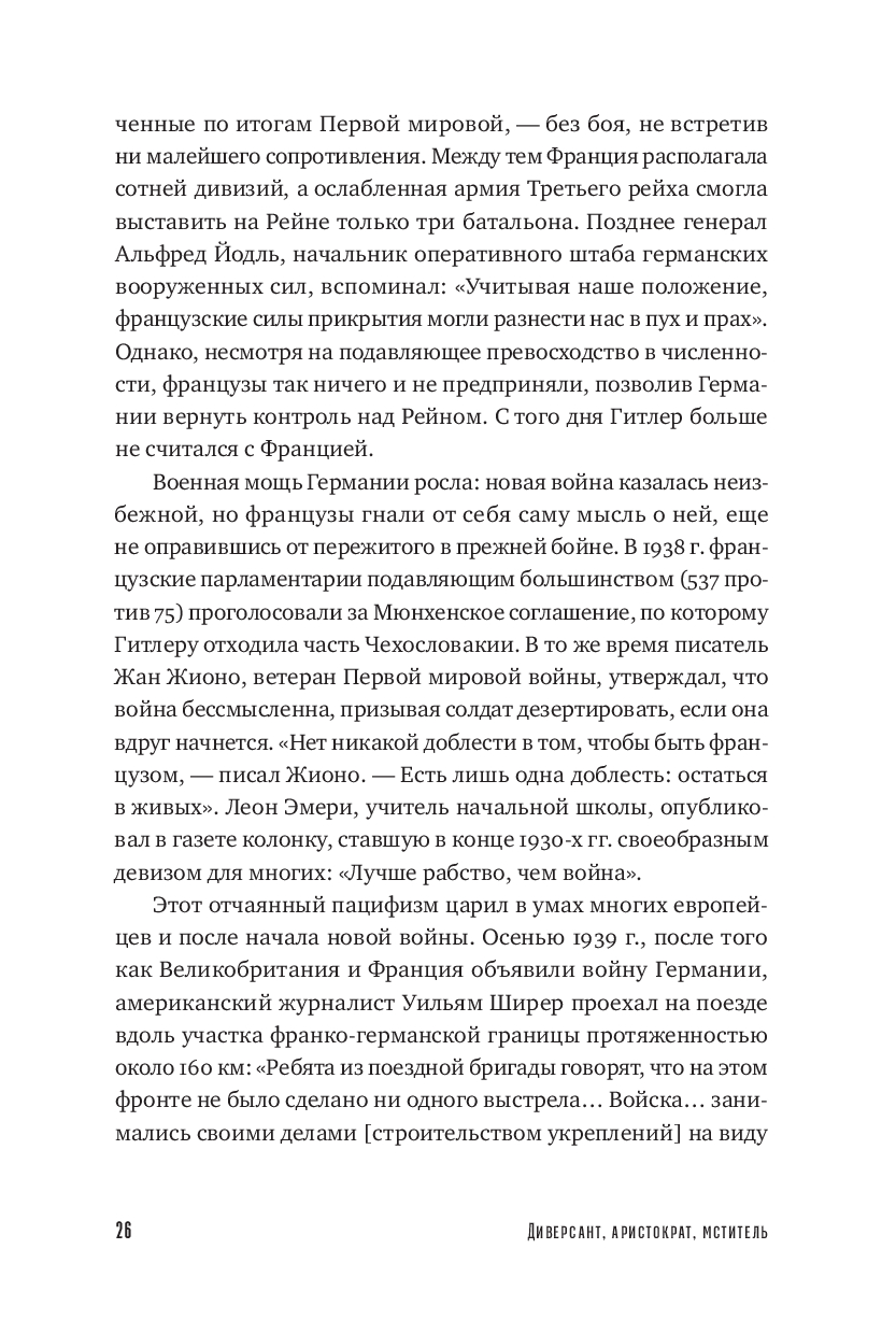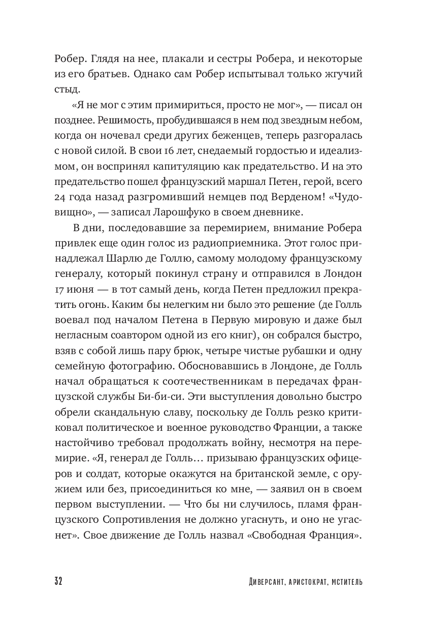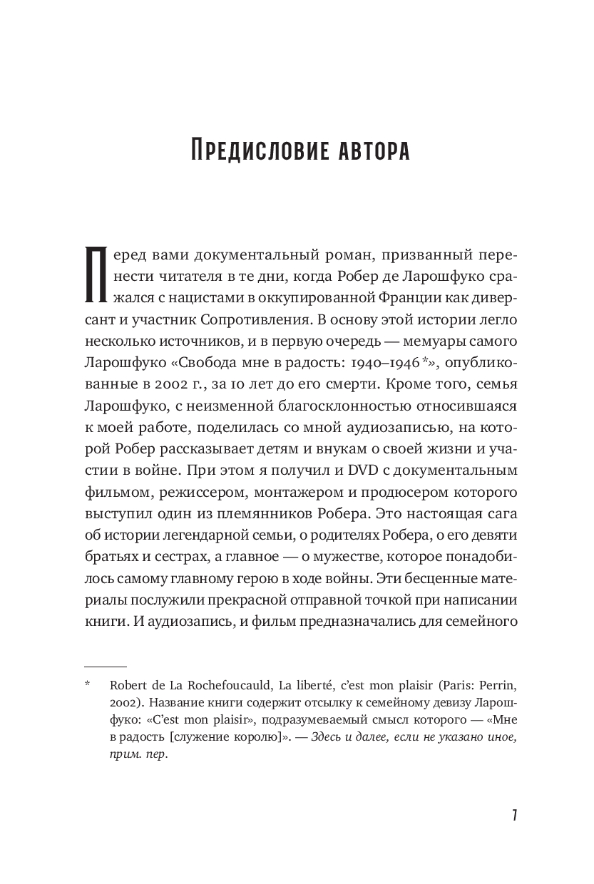 Робер де Ларошфуко, молодой французский аристократ, потомок древнего рода, примкнул к Сопротивлению и стал одним из самых дерзких и результативных агентов-диверсантов. Почему? Любовь к стране и кодекс дворянской чести. Герой этой книги мог бы смириться с поражением и принять власть коллаборационистского режима Виши. Но вместо этого Робер де Ларошфуко выбрал иной, во многом странный для человека его круга путь – путь борьбы.