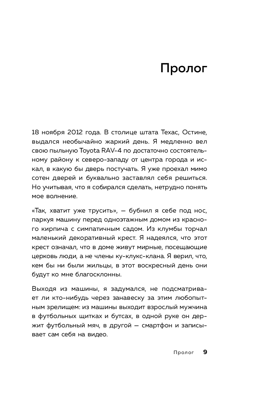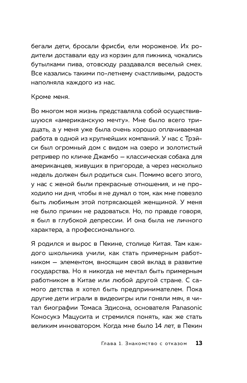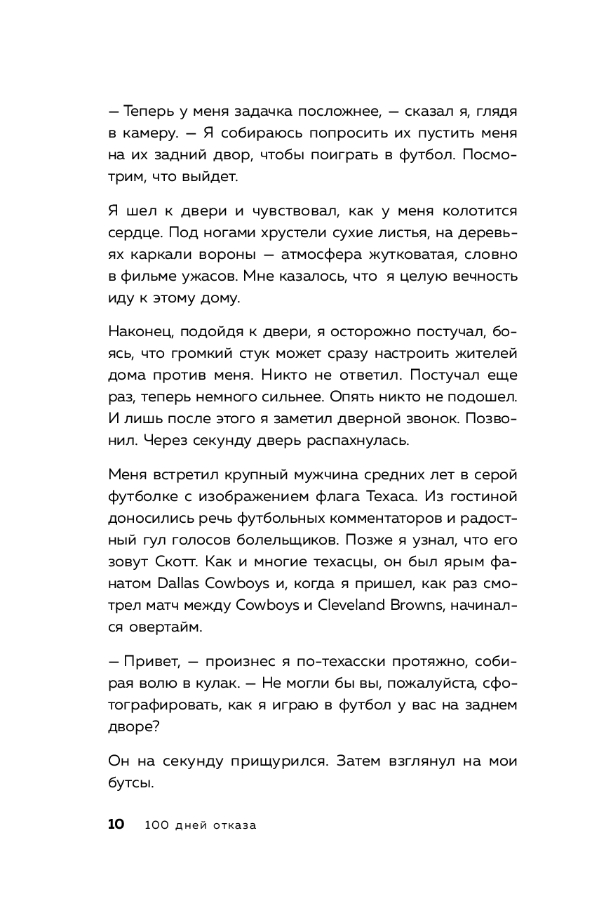 Из-за одного случайного отказа автор этой книги потерял веру в себя. Шли годы, а он буксовал, не решаясь на смелые проекты. Осознав это, Джиа Джианг бросил себе вызов – в течение 100 дней провоцировал окружающих говорить ему "нет". Он просил охранника в бизнес-центре одолжить денег, продавца фастфуда – выдать бесплатный бургер, владельца наугад выбранного дома – посадить розы в его дворе. Все это продолжалось до тех пор, пока мышца смелости окончательно не окрепла и Джиа не обрел внутреннюю свободу.