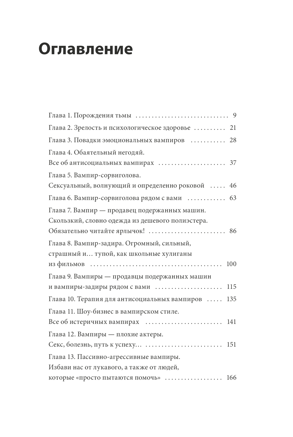 Вы узнаете о сильных и слабых сторонах эмоциональных вампиров и их жертв, изучите типичные манипуляции, которые применяют эмоциональные вампиры, а также эффективные способы защиты от них. Опросники в книге помогут точнее определить, к какому типу относится человек, общение с которым вызывает трудности.