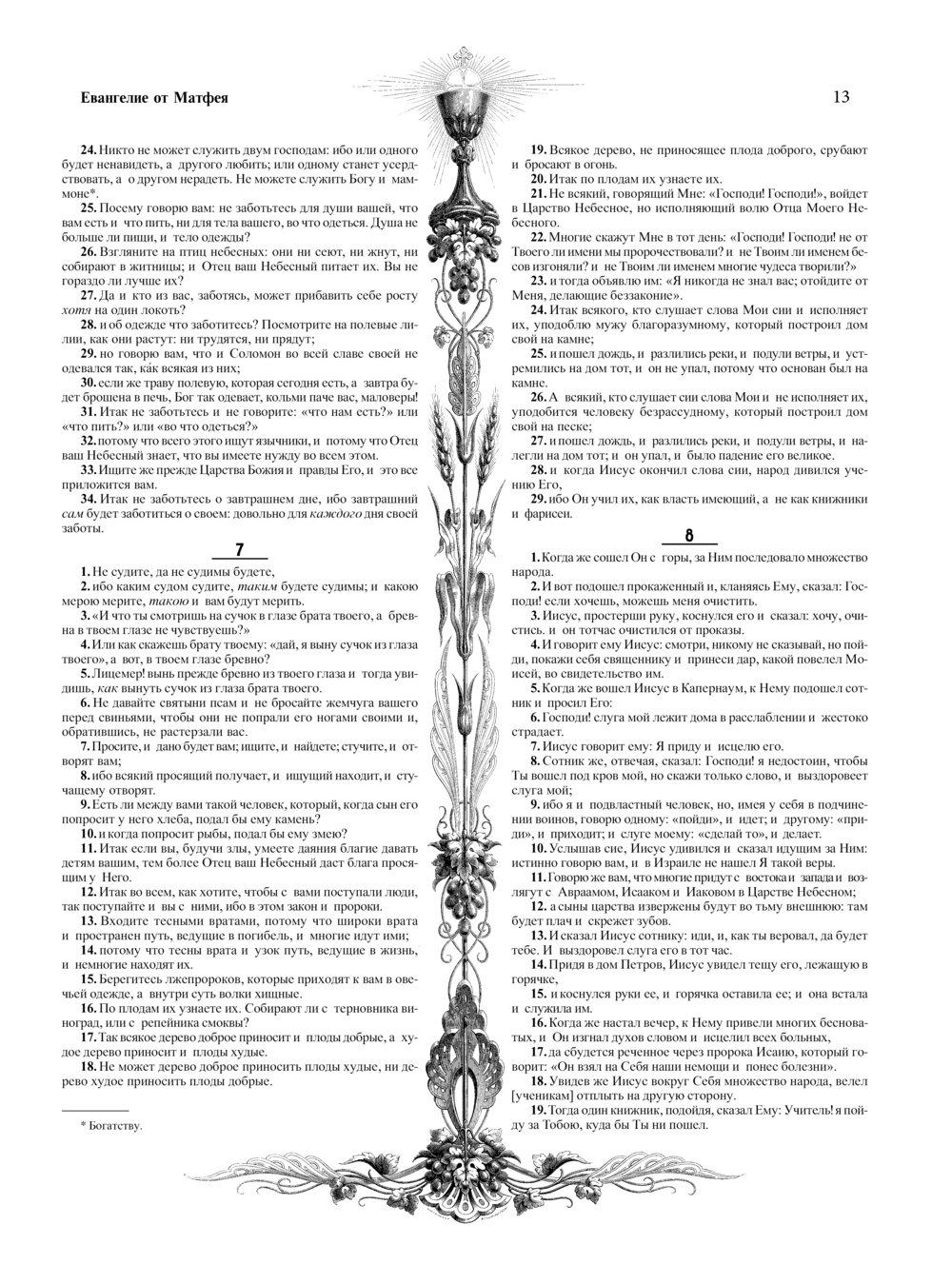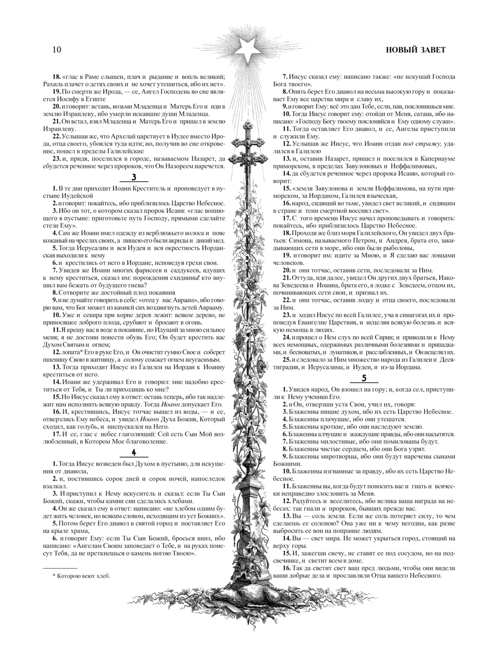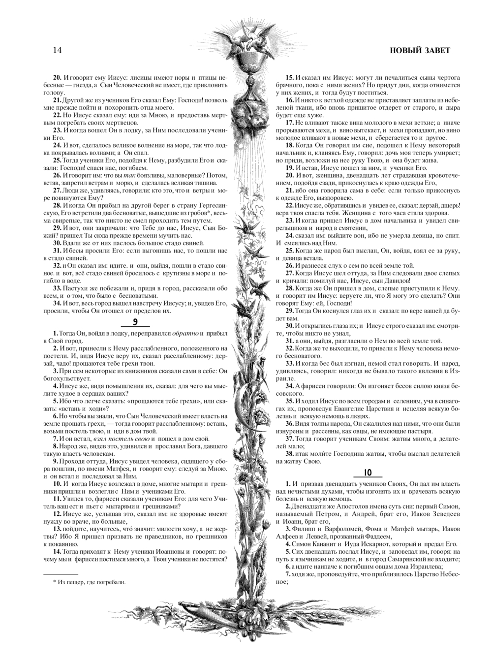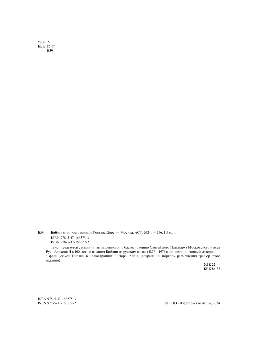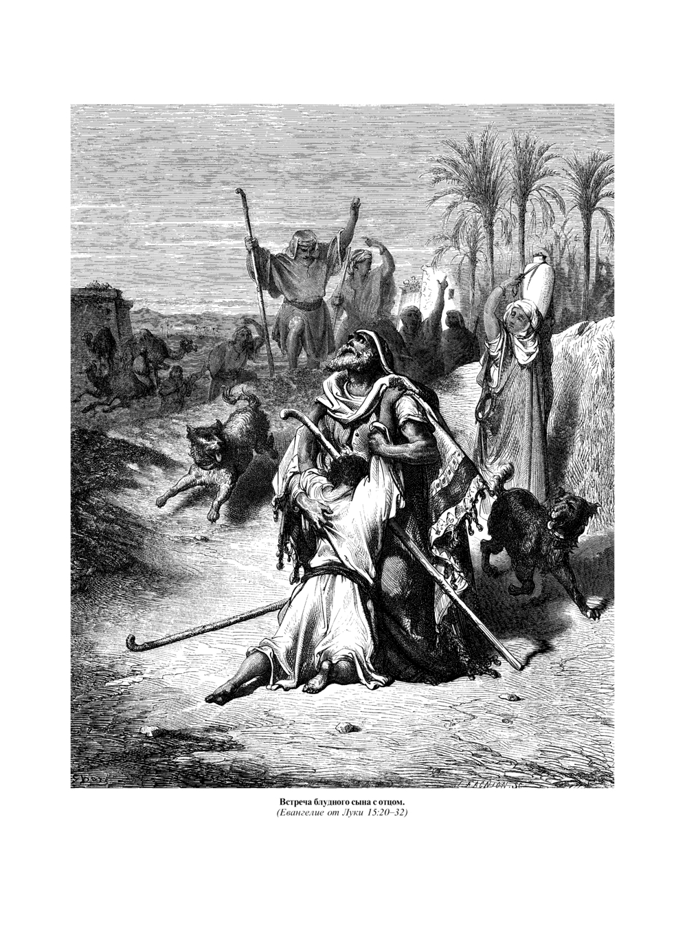 Библия в подарочном оформлении иллюстрирована бессмертными гравюрами Г. Доре, перенесенными из французского издания Библии 1866 г. с сохранением оригинального порядка их размещения. В издание вошли все книги Нового Завета в синодальном переводе, соответствующего тексту Священного Писания, выпущенного по благословению Святейшего Патриарха Московского и всея Руси Алексия II к 100-летию издания Библии на русском языке (1876-1976).