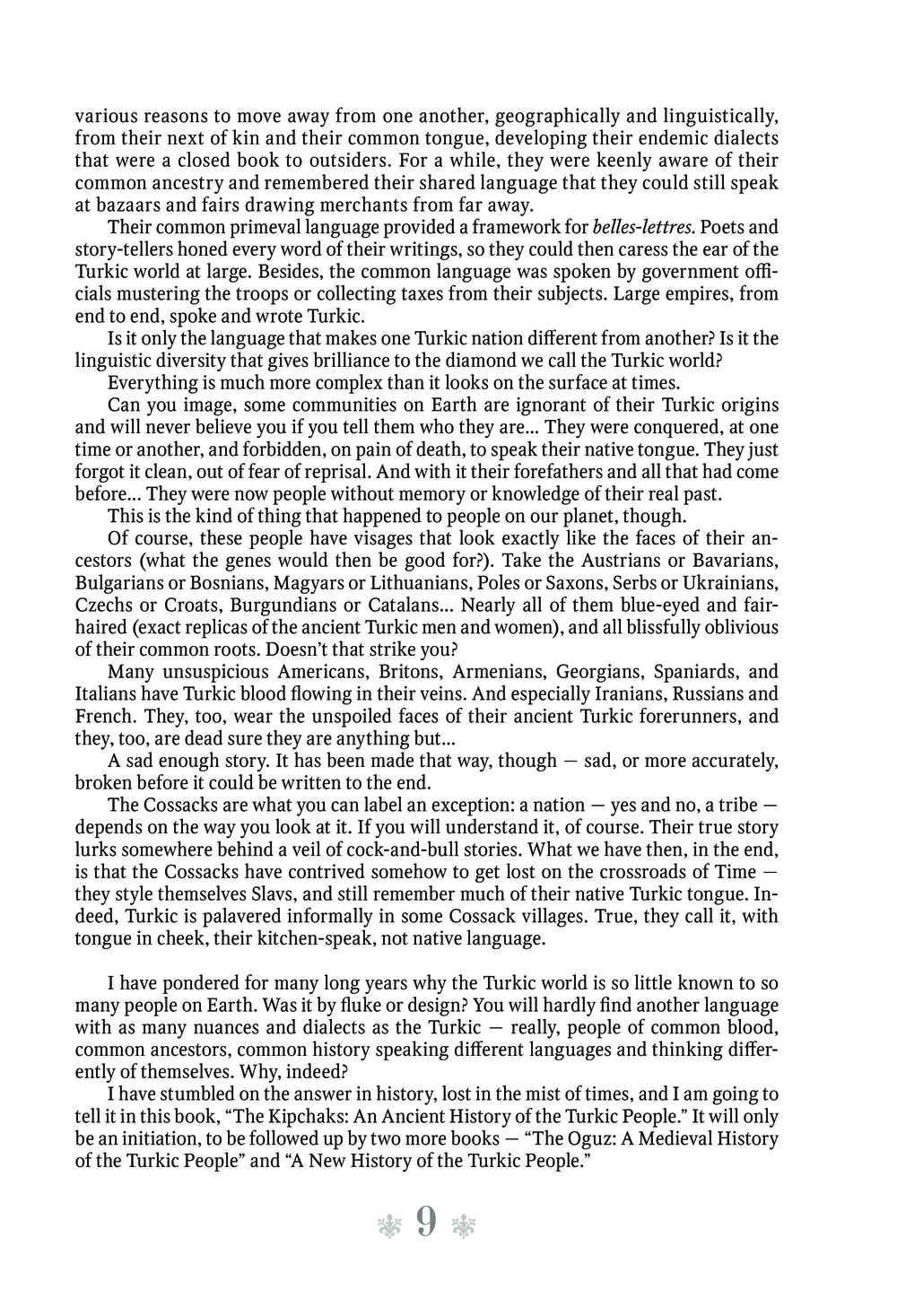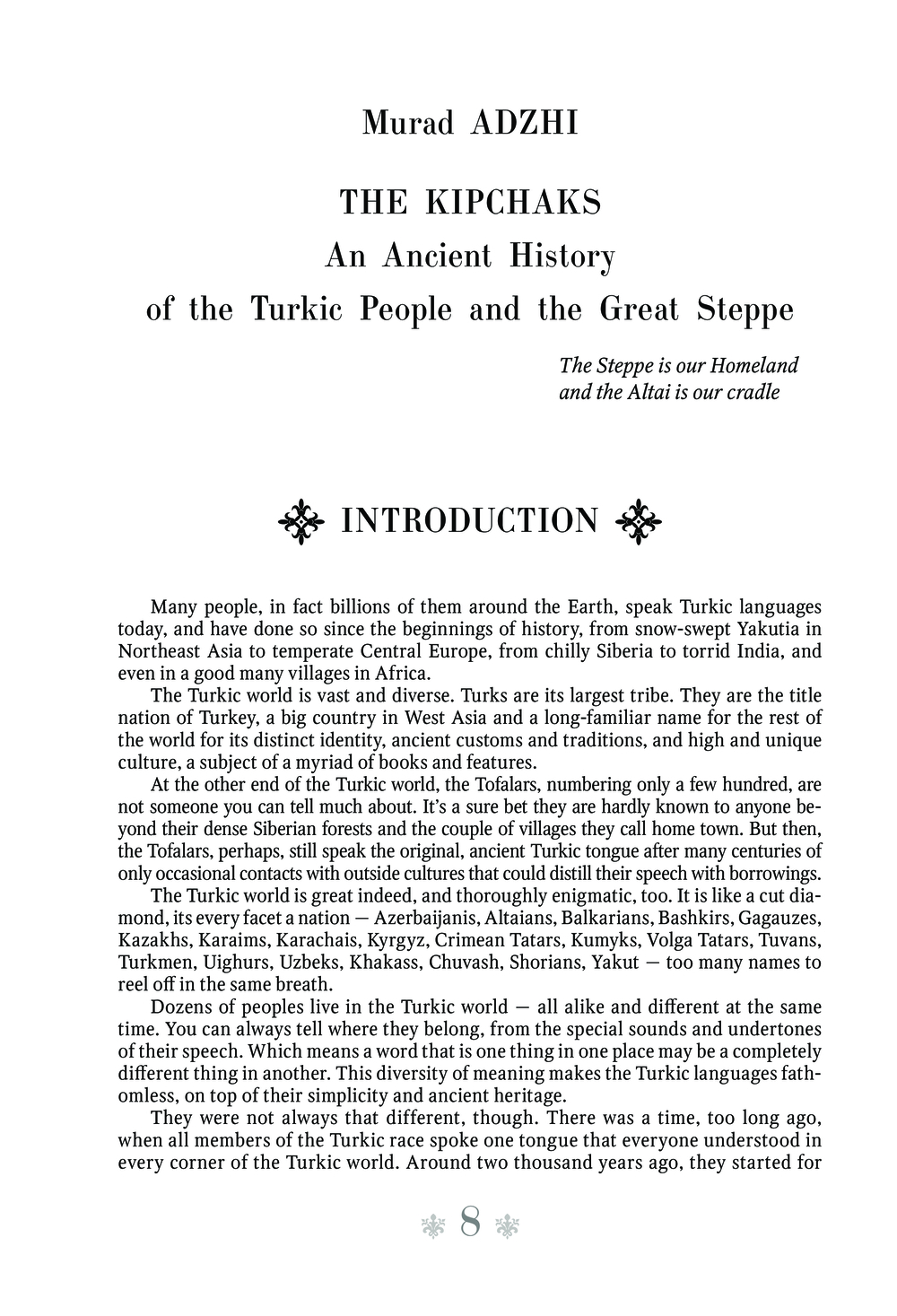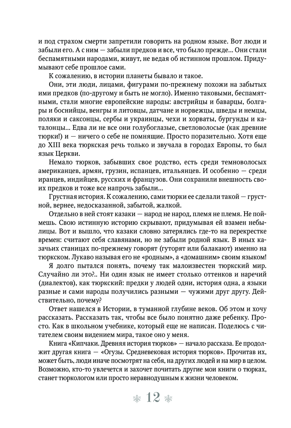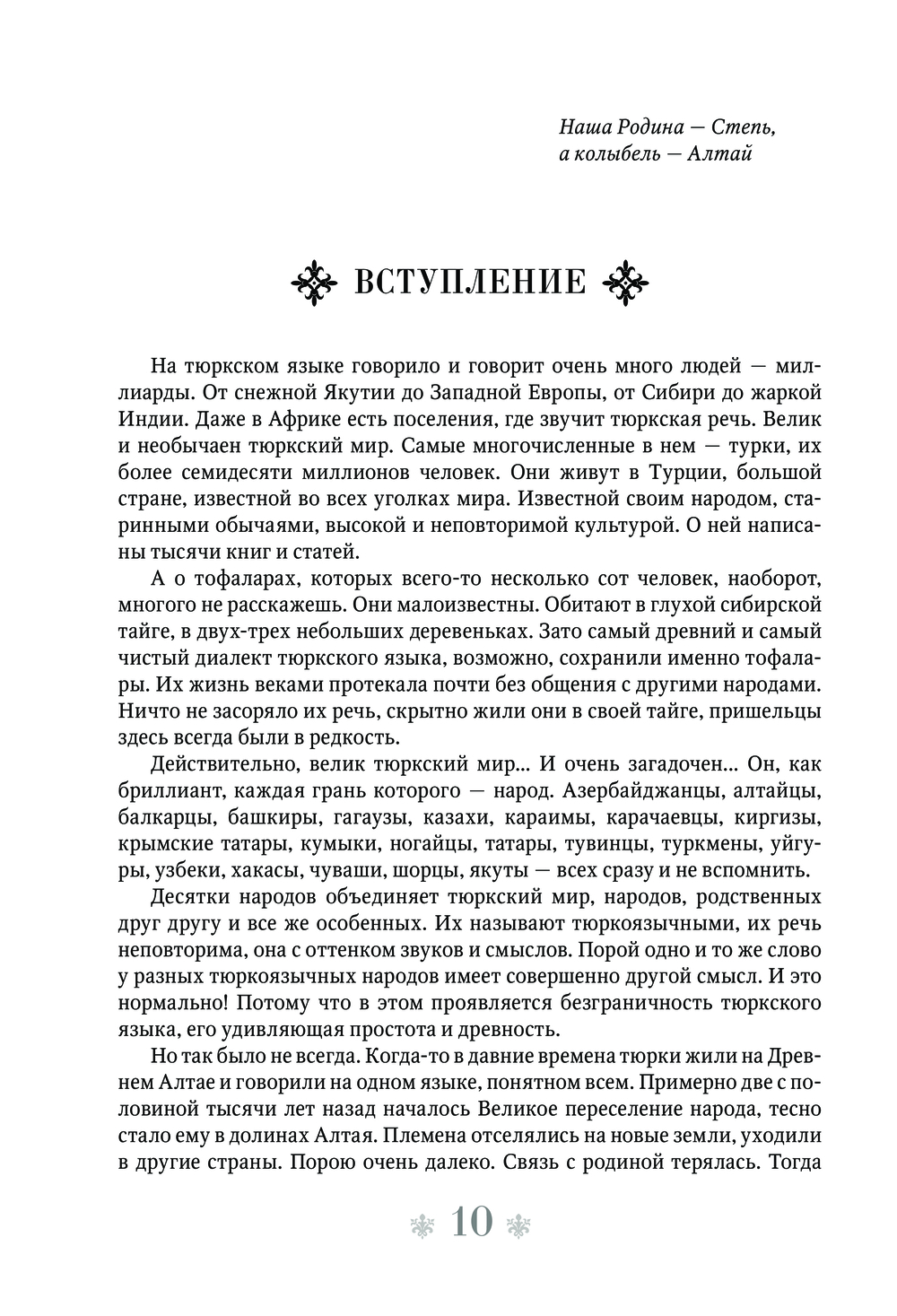 В первой книге речь идет о становлении тюрков как народа, о его расселении по Евразии, о Великом переселении народов. Оно зародилось на древнем Алтае и к IV веку достигло Европы. Первыми узнали о высокой культуре тюрков Индия и Персия. Потом – Кавказ и Урал, Византия и Рим... Автор будто открывает окно в пленительное прошлое России.