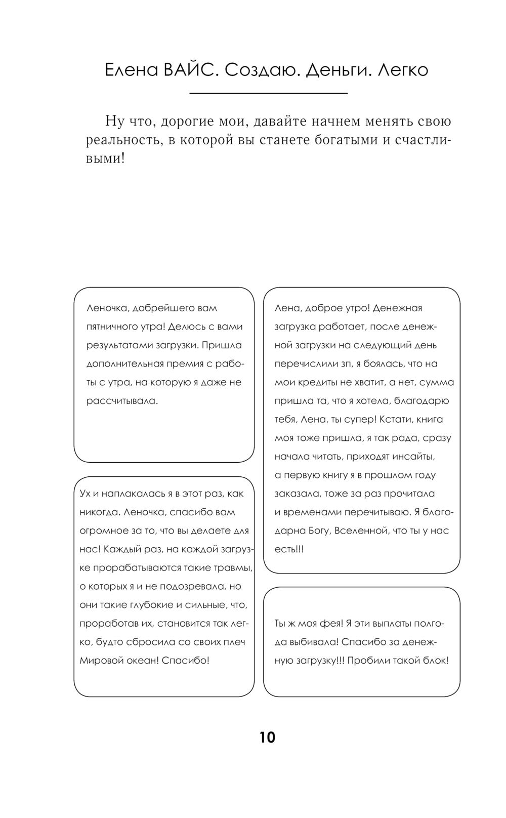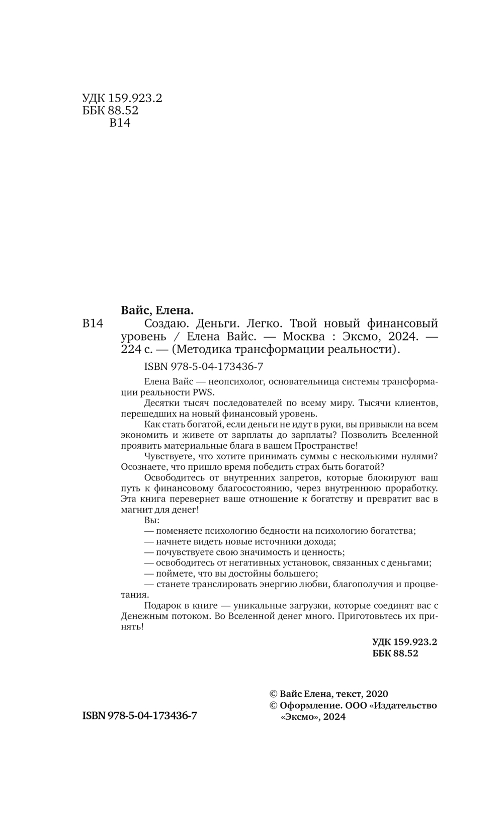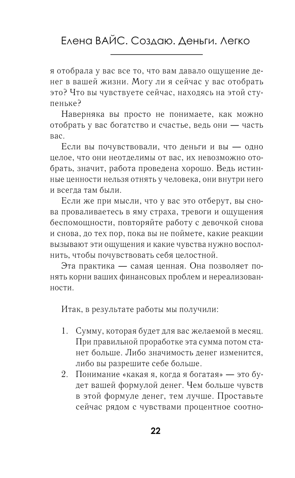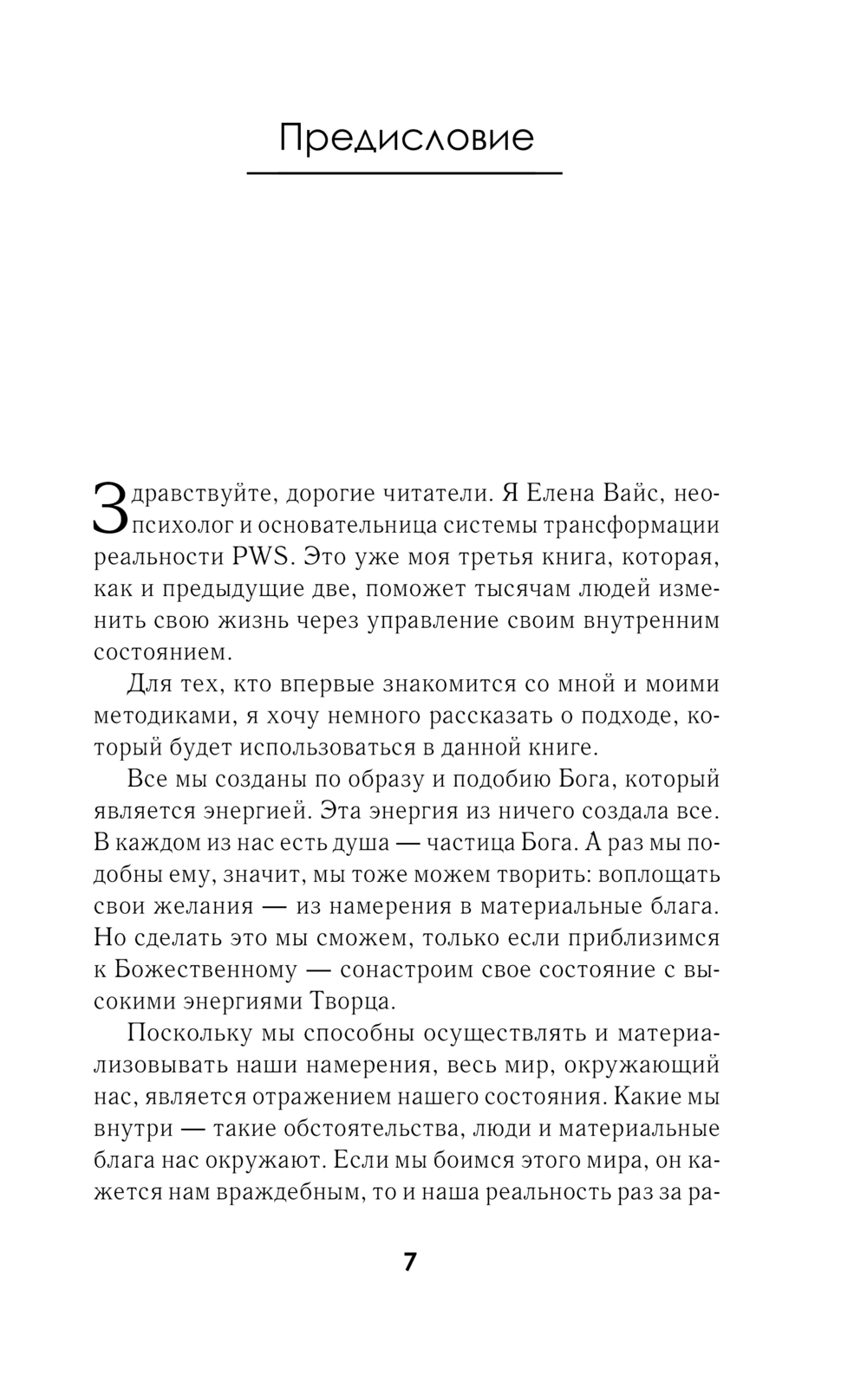 Елена Вайс – неопсихолог, основательница системы трансформации реальности PWS. Десятки тысяч последователей по всему миру. Тысячи клиентов, перешедших на новый финансовый уровень. Как стать богатой, если деньги не идут в руки, вы привыкли на всем экономить и живете от зарплаты до зарплаты? Позволить Вселенной проявить материальные блага в вашем Пространстве! Чувствуете, что хотите принимать суммы с несколькими нулями? Осознаете, что пришло время победить страх быть богатой? Освободитель от внутренних запретов, которые блокируют ваш путь к финансовому благосостоянию, через внутреннюю проработку.