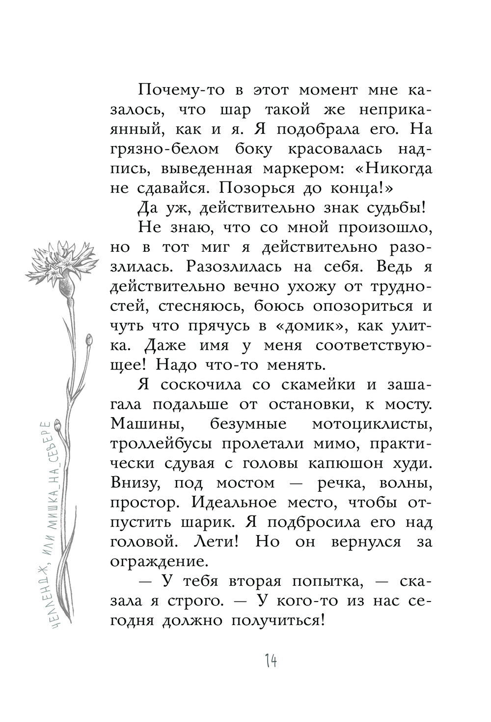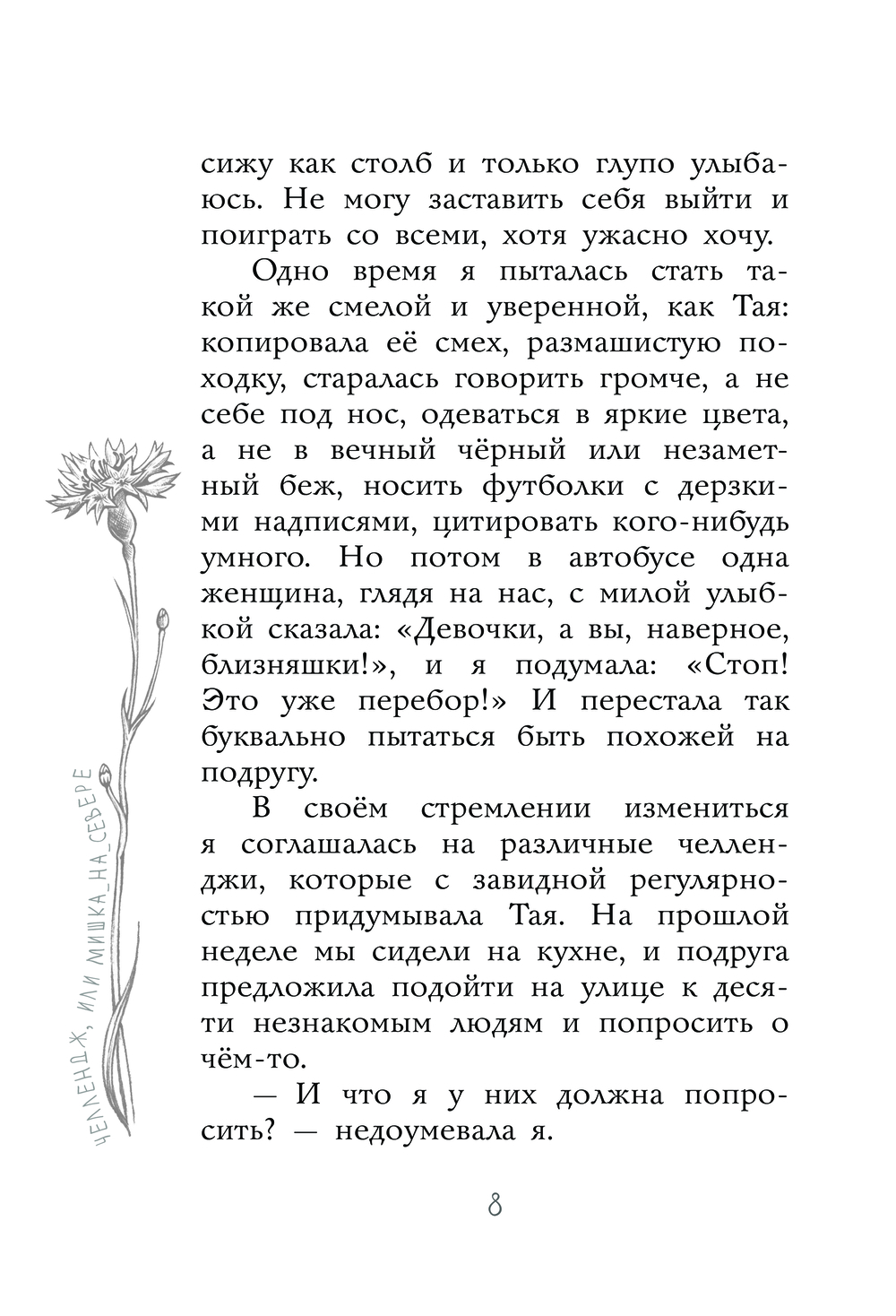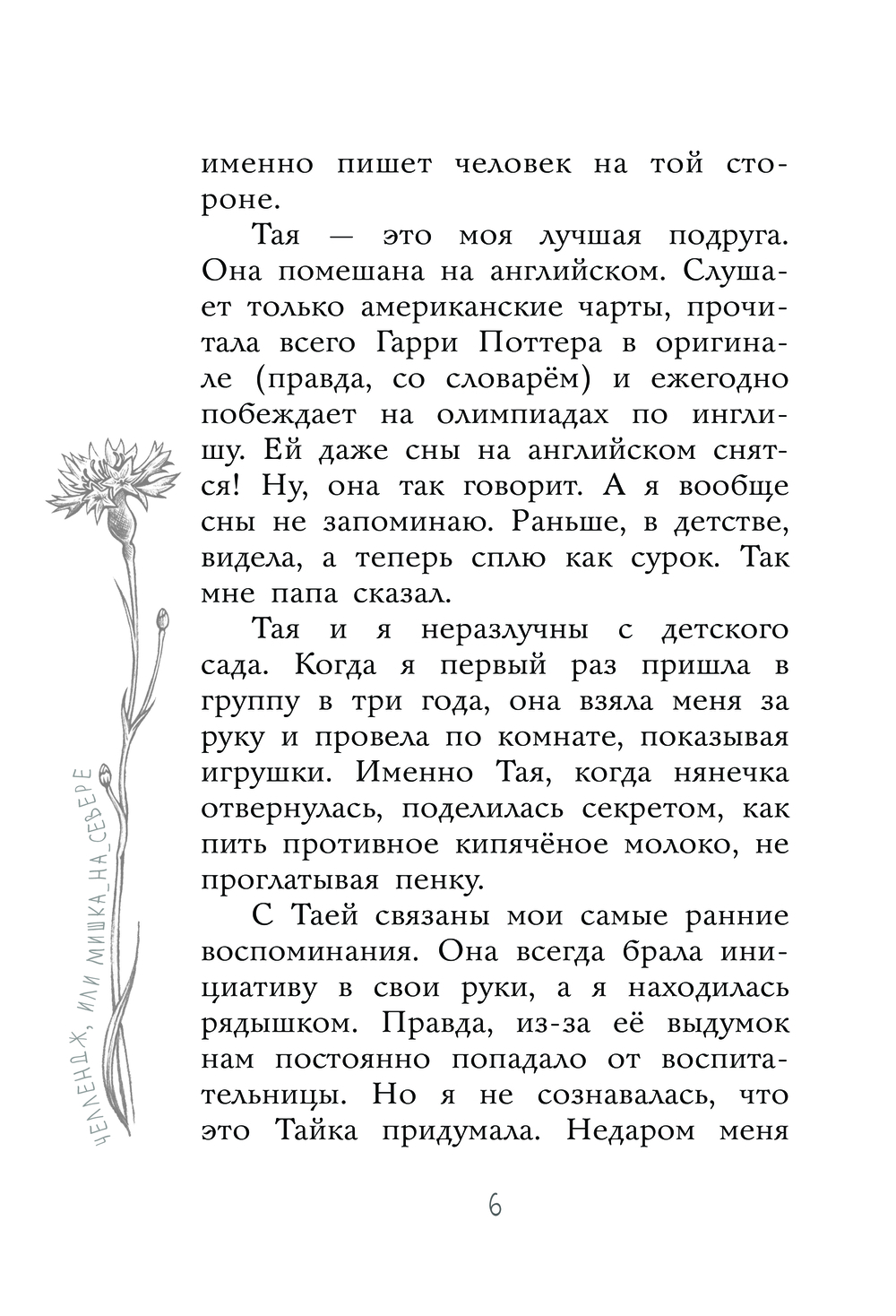 Ульяна, героиня новой книги Елены Бурак "Челлендж, или Мишка_на_Севере" постоянно проходит разные нелепые челленджи, придуманные лучшей подругой. Таким образом Тая пытается развить в Уле уверенность и прочие нужные качества. Ульяне так это всё надоело! Но девочка напоследок придумывает сама себе последний челлендж. Его девиз "I must do it (я должна действовать)". Уля твёрдо решила поступать решительно. И тут внезапно её страницей в соцсети заинтересовался таинственный Мишка_на_Севере...