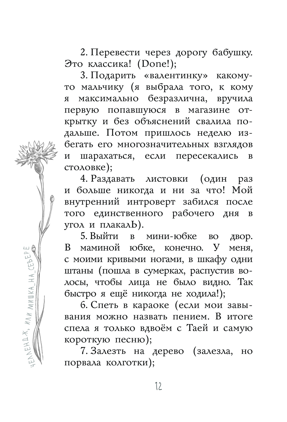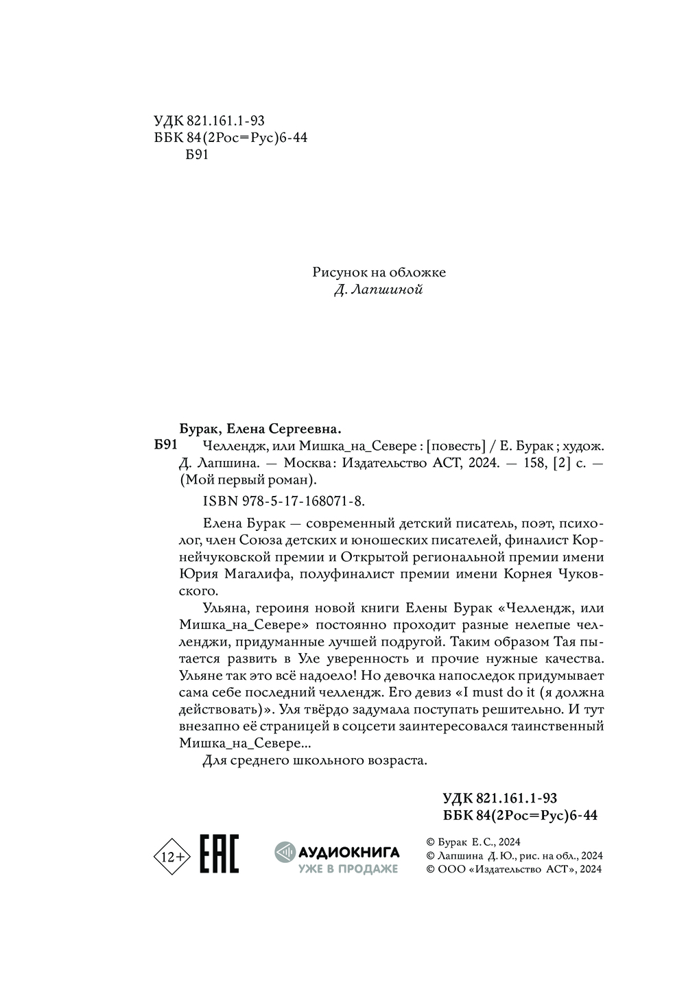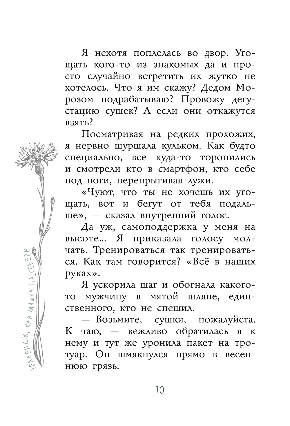 Ульяна, героиня новой книги Елены Бурак "Челлендж, или Мишка_на_Севере" постоянно проходит разные нелепые челленджи, придуманные лучшей подругой. Таким образом Тая пытается развить в Уле уверенность и прочие нужные качества. Ульяне так это всё надоело! Но девочка напоследок придумывает сама себе последний челлендж. Его девиз "I must do it (я должна действовать)". Уля твёрдо решила поступать решительно. И тут внезапно её страницей в соцсети заинтересовался таинственный Мишка_на_Севере...