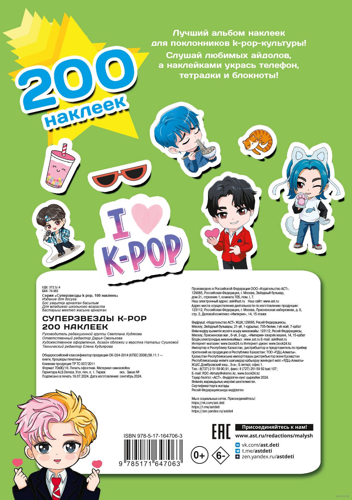 Альбом с наклейками "Суперзвезды k-pop" – это лучший выбор для каждого, кто любит, и кого интересует корейская поп-культура! Внутри находится 200 ярких наклеек, которыми можно украсить, например, ноутбук, телефон, блокнот или тетрадь. Скорее бери альбом и погрузись в мир k-pop культуры с головой!