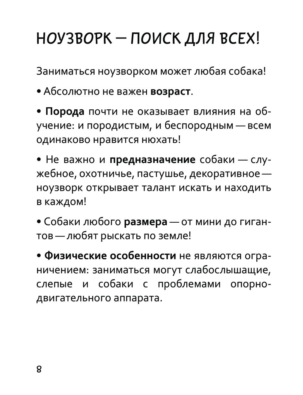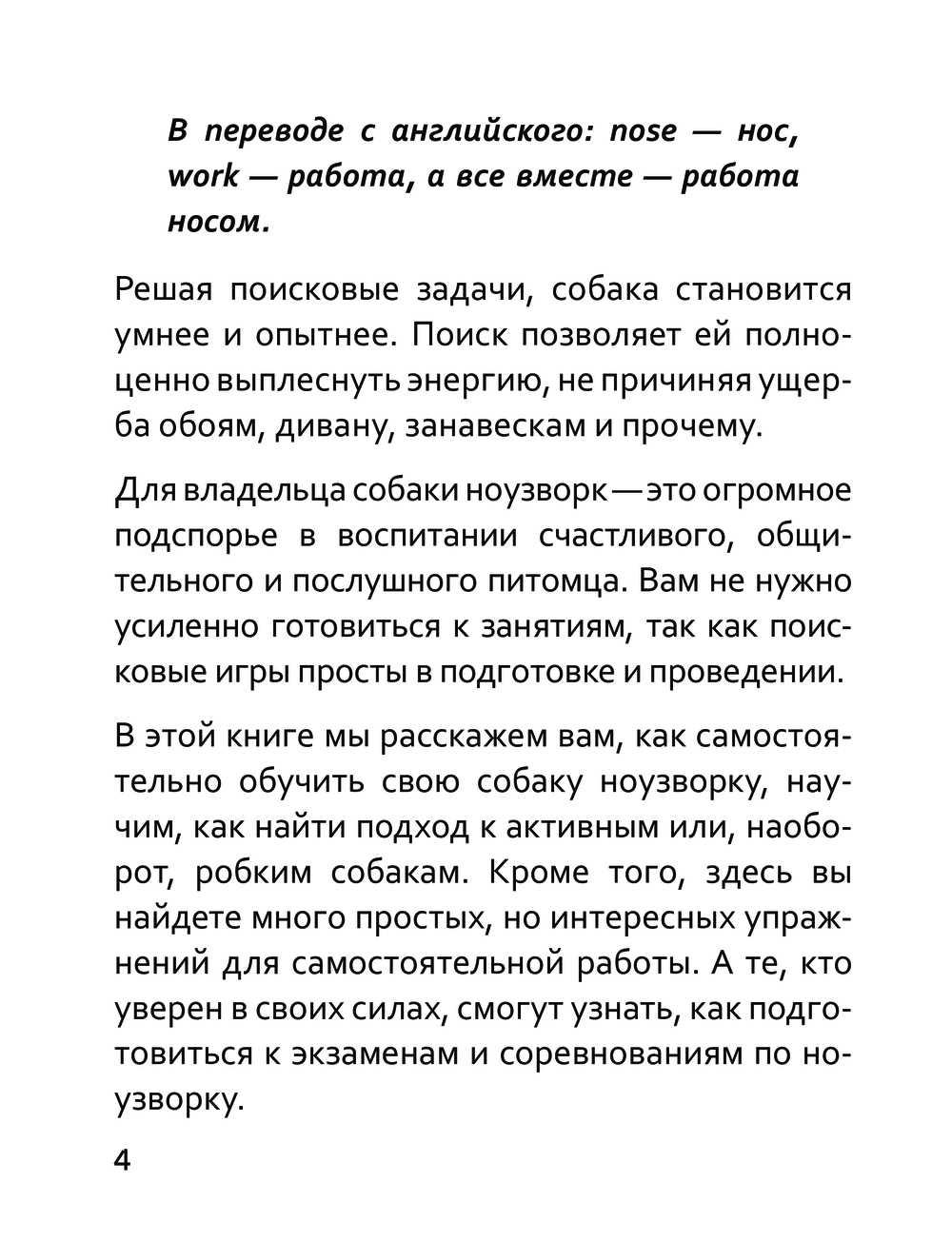 Предложенные в книге упражнения позволяют домашним собакам заниматься любимым делом, да ещё и в компании с хозяином. А это не только делает жизнь питомцев насыщеннее и интереснее, но и "подтягивает" их послушание, улучшая отношения в тандеме владелец-собака. Выполнять упражнения могут все собаки без исключения, никаких ограничений по возрасту, здоровью, породе или темпераменту.