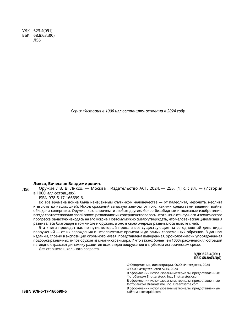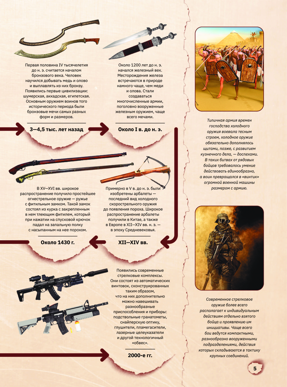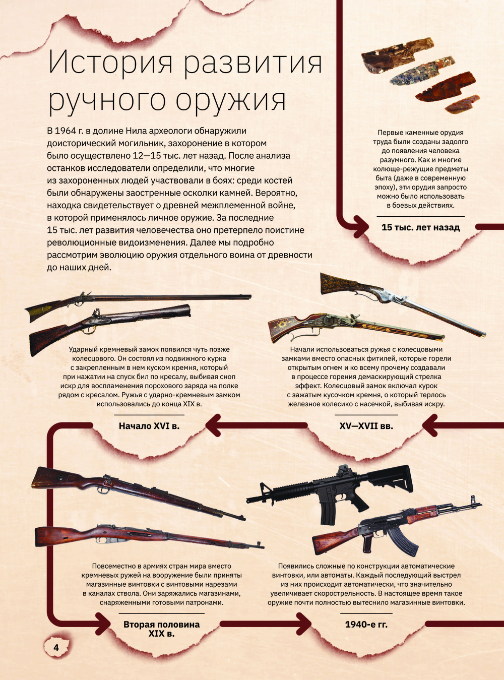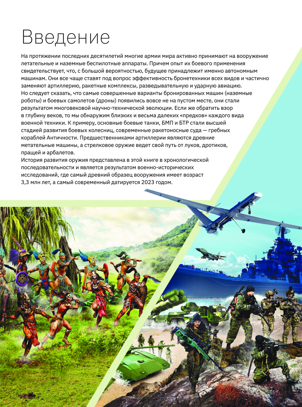 Эта книга проведет вас по пути, который прошли все существующие на сегодняшний день виды вооружений- от их зарождения в незапамятные времена и до самых современных образцов. В данном издании, словно в экспозиции огромного музея, представлена выверенная, хронологически упорядоченная подборка различных типов оружия из многих стран мира. И что важно: более чем 1000 красочных иллюстраций наглядно отражают динамику развития всех видов вооружения в глубоком историческом срезе.