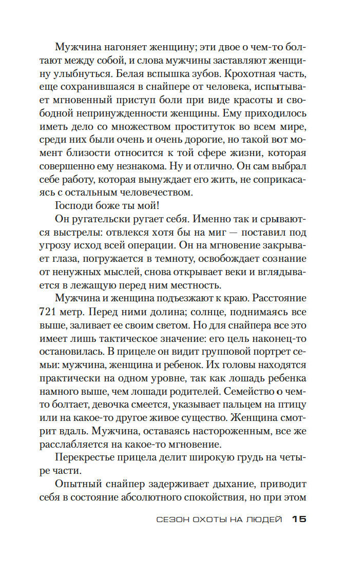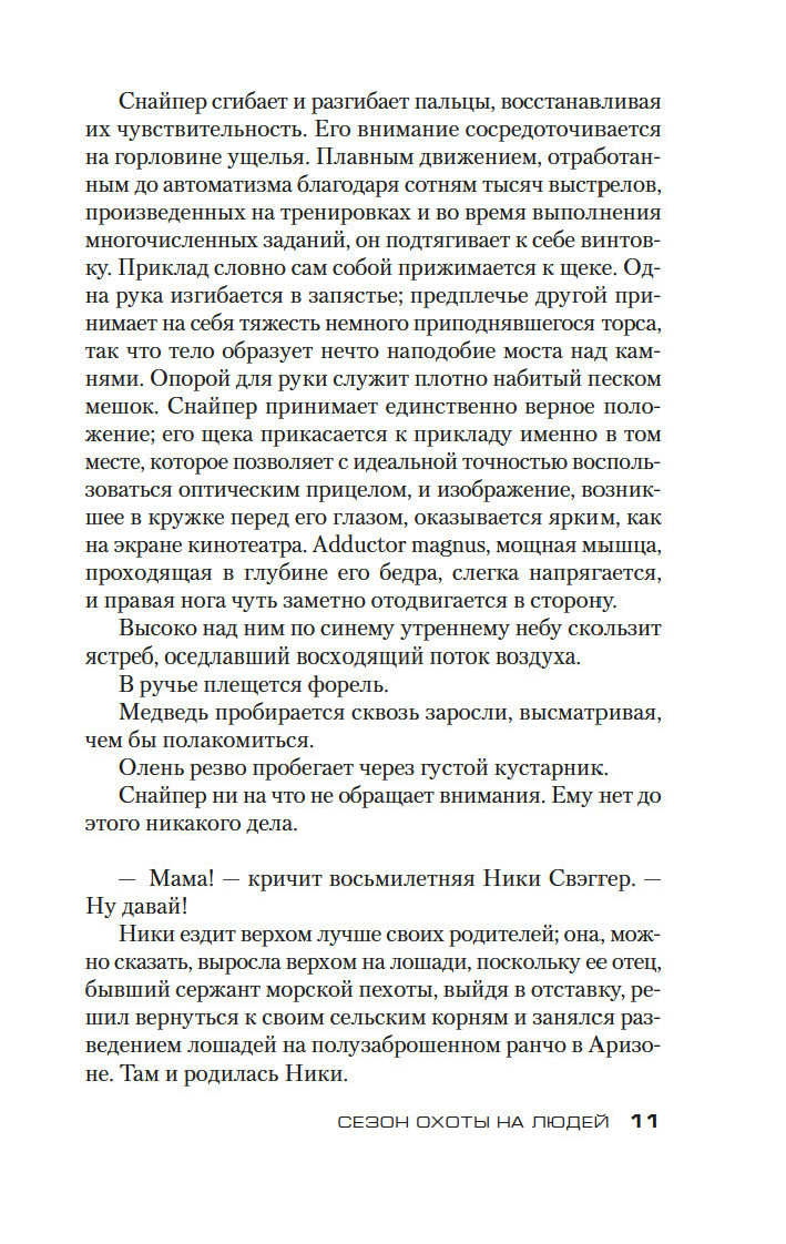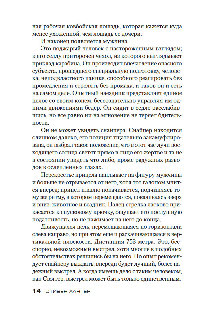 Трагедия разыгралась в последние дни Вьетнамской войны. Донни Фенн, морпех армии США, гибнет от пули снайпера, а его напарник, Боб Свэггер, получает тяжелое ранение. Прошли годы, Боб женится на Джулии, вдове погибшего друга, они воспитывают дочь Никки, живут на ранчо в горах Айдахо, в глухой провинции. Самая большая мечта Свэггера – избавиться от мучительного наследия, забыть о прошлом и тихо жить вместе с семьей, – похоже, сбывается. Но в один ничем не примечательный день Боб вместе с женой и дочерью выезжают на лошадях из ранчо. А на скале над горным перевалом на расстоянии в тысячу ярдов от них зоркий хладнокровный стрелок, один из лучших снайперов в мире, смотрит через телескопический прицел на три приближающиеся фигурки. Из горького, почти забытого прошлого возвратился смертельный враг Свэггера, не добивший его когда-то...