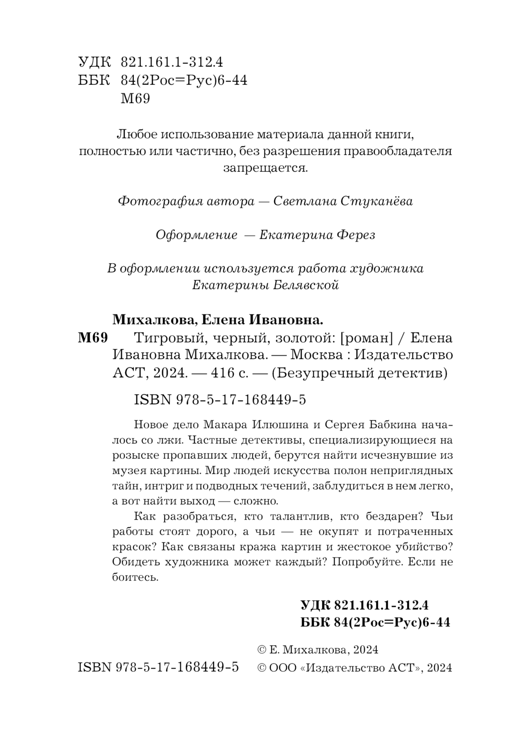 Как разобраться, кто талантлив, кто бездарен? Чьи работы стоят дорого, а чьи – не окупят и потраченных красок? Как связаны кража картин и жестокое убийство? Об этом – в детективе Елены Михалковой "Тигровый, черный, золотой".