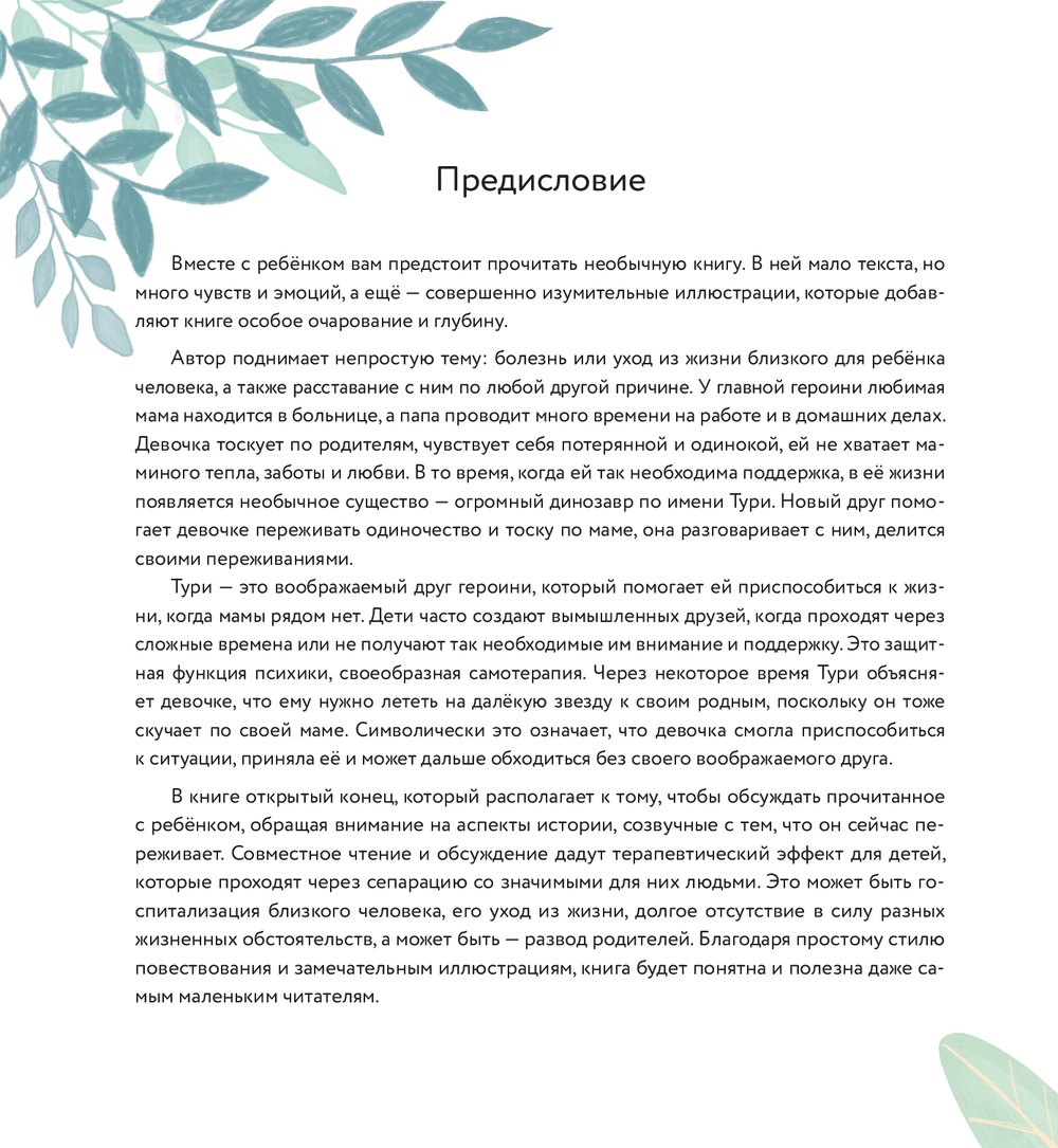 Как быть, если мама болеет и всё, что ты можешь для неё сделать, – читать любимую книгу о динозаврах? Главной героине сказки тяжело в одиночку справляться с переживаниями, но однажды в её жизни появляется Тури – большой говорящий динозавр. С ним весело играть и можно поговорить о самом важном и сокровенном. Но что, если Тури придётся покинуть свою подругу?