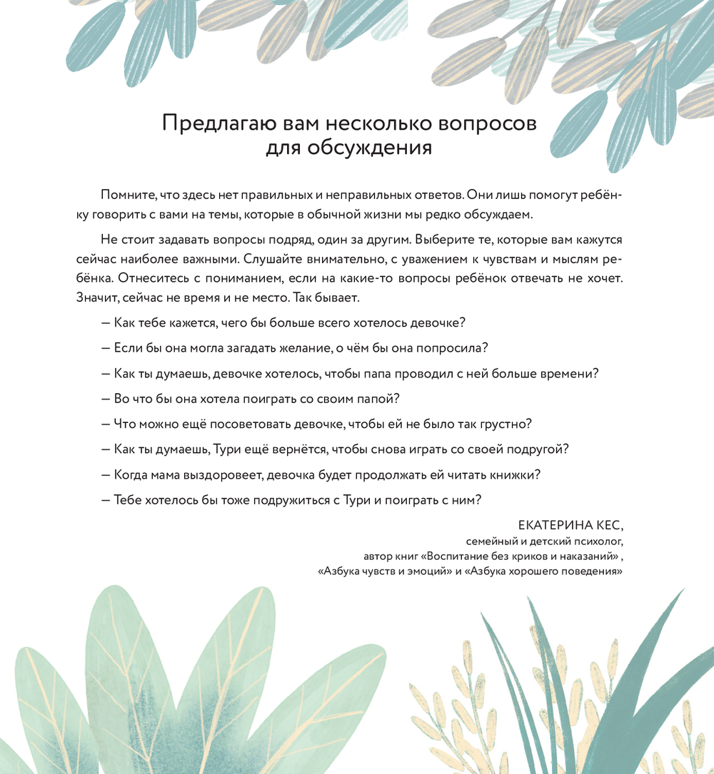 Совместное чтение терапевтической сказки об исцеляющей силе дружбы поможет родителям научить своих детей справляться с грустными эмоциями. Предисловие и вопросы для обсуждения от детского психолога и автора бестселлеров по воспитанию, подскажут, как вовлеченно слушать, на что обращать внимание и как грамотно направлять ребёнка в его сложных переживаниях.