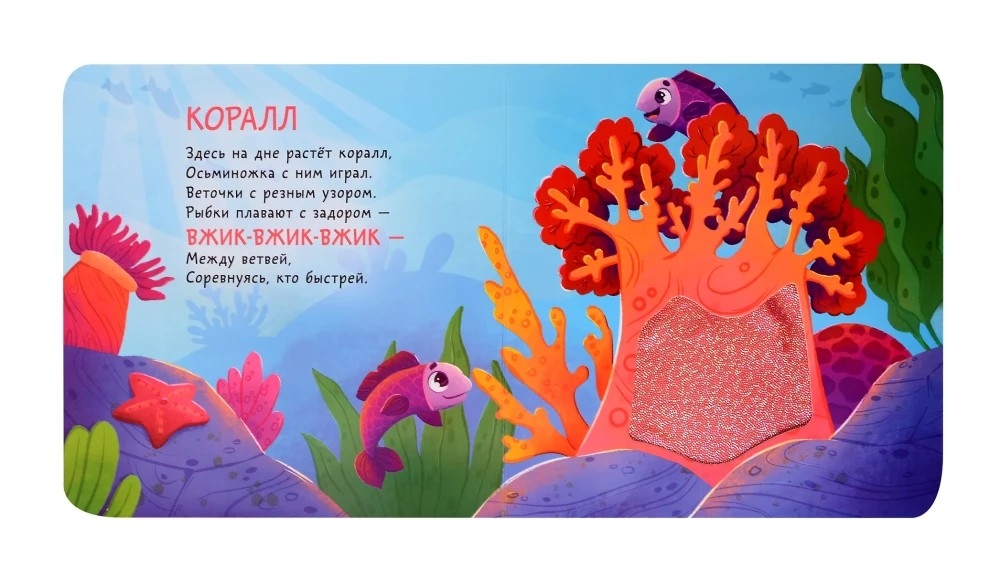 В каждой книге 7 тактильных вставок разной формы и из разных материалов: силикон, мех, ткань, кожа, фетр, гофрокартон, пайетки, фольга. Они стимулируют мелкую моторику, массируют детские пальчики и ладошки, учат малыша различать разные текстуры и способствуют развитию речи, памяти, воображения, пространственного мышления.