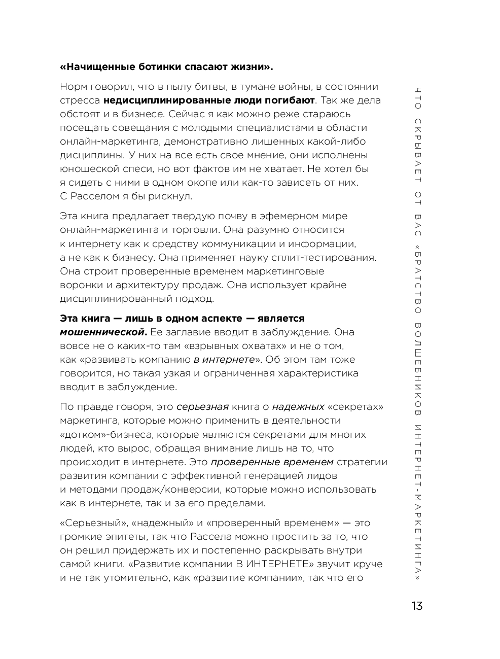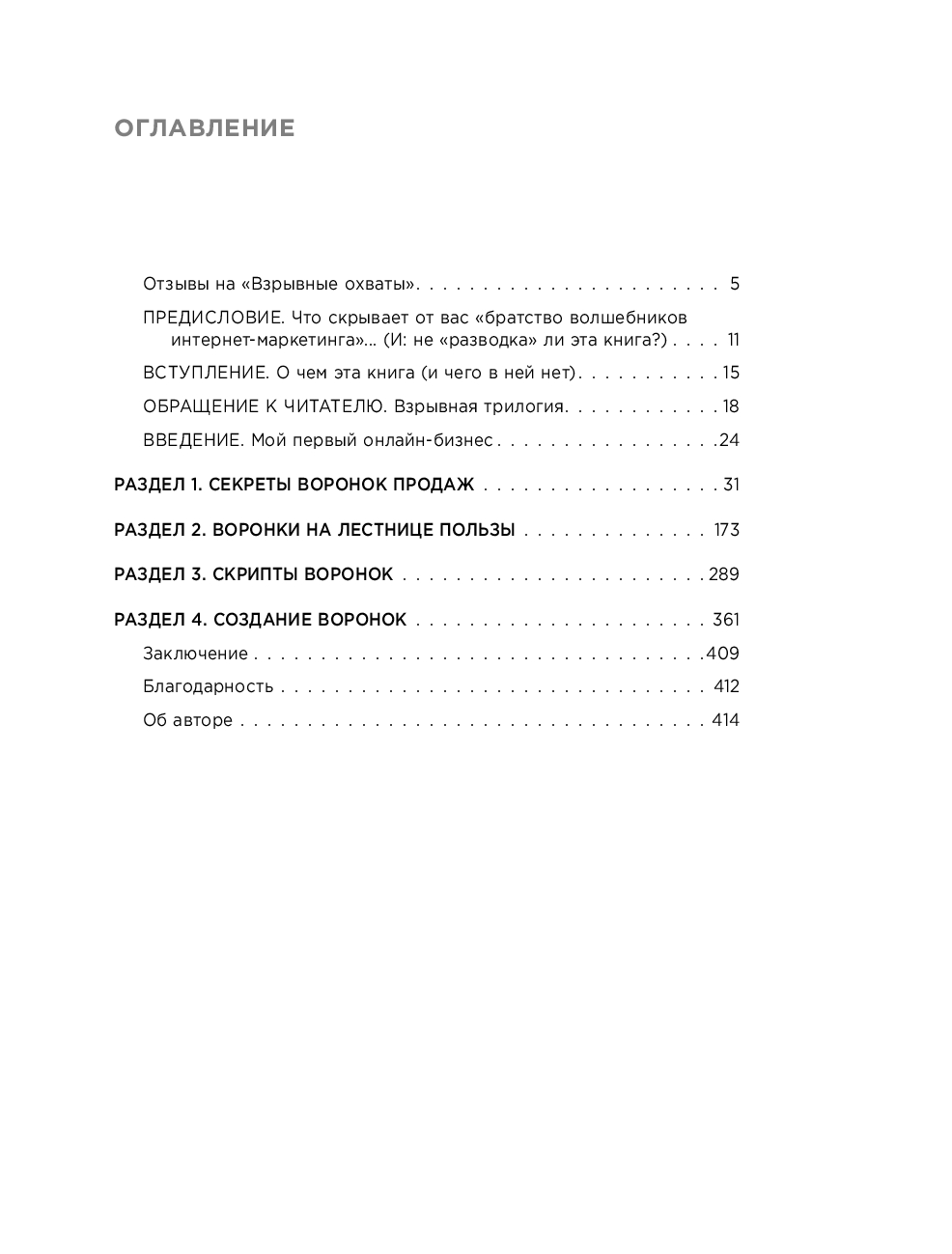 На эти и другие вопросы автор дает ответы, а также рассказывает о десятке универсальных воронок продаж, которые помогли более 10 000 компаний увеличить конверсию и превратить клиентов в фанатов бренда. Используя авторскую методику, вы научитесь обслуживать покупателей на высшем уровне, выстраивать правильную структуру воронок, а главное – обеспечите своему продукту взрывные продажи!