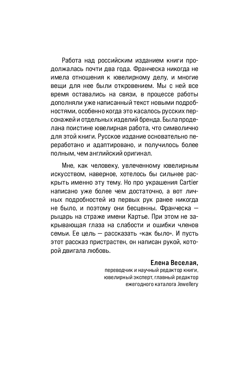 История легендарного бренда описана в десятках книг. Но ни одна из них, как бы великолепно она ни была изложена, не способна сравниться с трудом самого члена семьи. Франческа Картье Брикелл, прадед которой был самым младшим из братьев-основателей ювелирного Дома, провела более десяти лет, путешествуя по миру в поисках подлинной и неизвестной до сегодняшних дней истории Cartier.