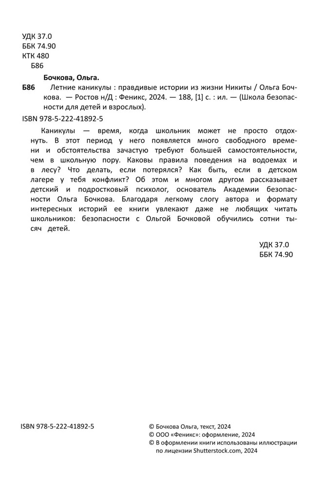 Каникулы – время, когда школьник может не просто отдохнуть. В этот период у него появляется много свободного времени и обстоятельства зачастую требуют большей самостоятельности, чем в школьную пору. Каковы правила поведения на водоемах и в лесу? Что делать, если потерялся? Как быть, если в детском лагере у тебя конфликт? Об этом и многом другом рассказывает детский и подростковый психолог, основатель Академии безопасности Ольга Бочкова. Благодаря легкому слогу автора и формату интересных историй ее книги увлекают даже не любящих читать школьников: безопасности с Ольгой Бочковой обучились сотни тысяч детей.