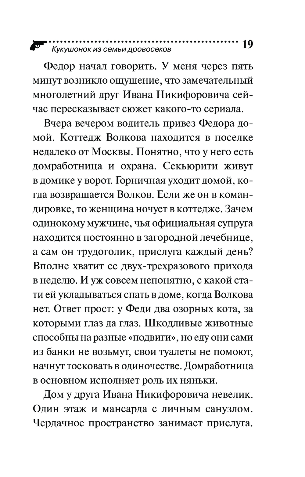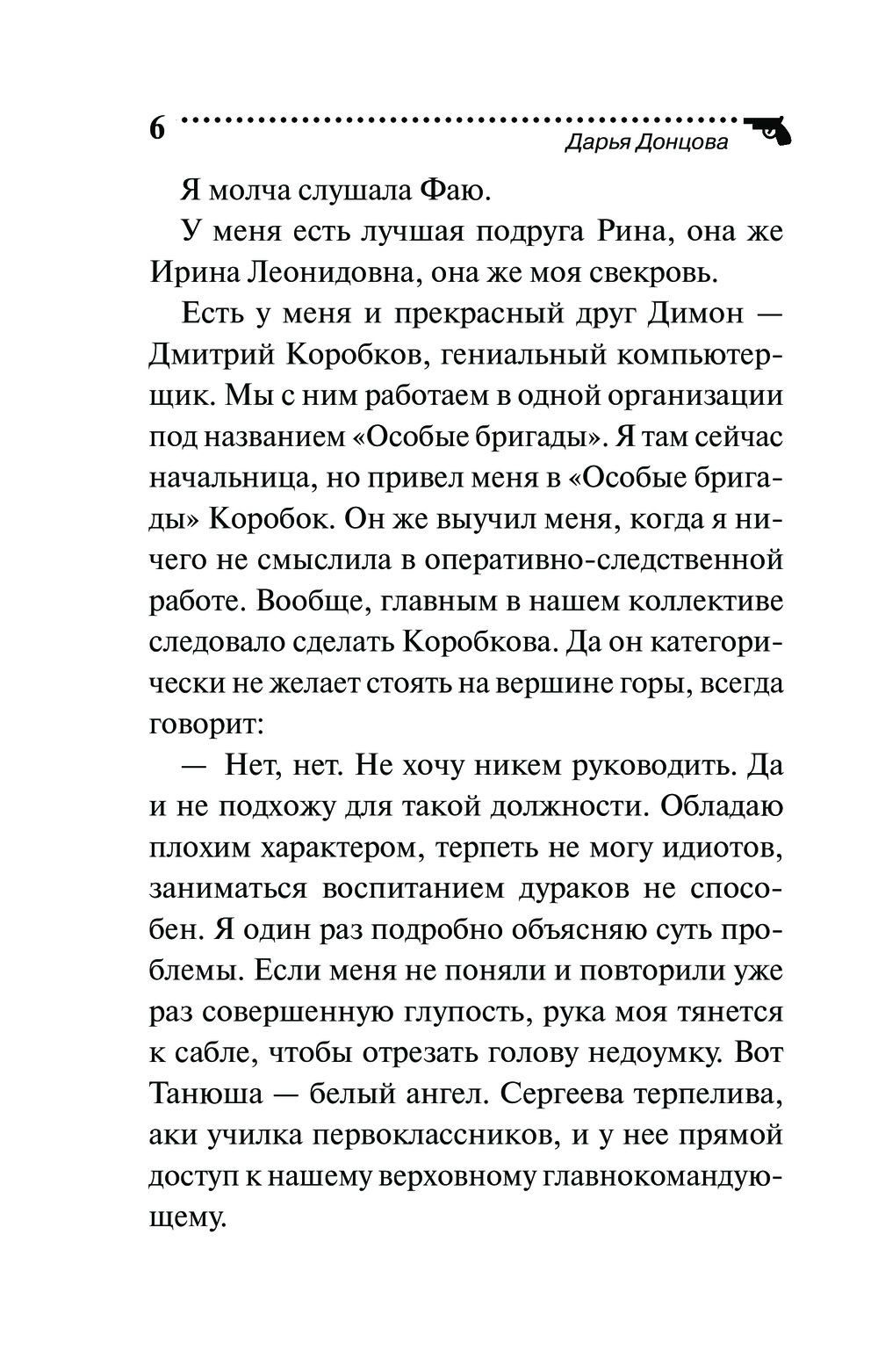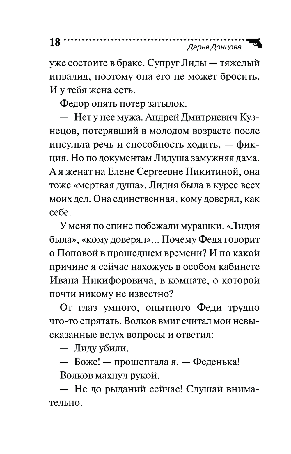 Простая фраза: "Не нервничай, все будет хорошо" – может вмиг привести человека в бешенство. Но старинному товарищу Ивана Никифоровича и Тани Сергеевой впору искать пятый угол. В особую бригаду обратился Федор Волков, большой начальник конторы, которую лучше не упоминать всуе. У него была тайная супруга Лида Попова. Они скрывали отношения, чтобы никто не мог использовать Попову в качестве рычага давления на Волкова. Но однажды Лида позвонила мужу и попросила срочно приехать в деревню Косюхино. Федор примчался на зов, но нашел Лиду мертвой на полу в заброшенной избе. В этот момент с улицы донесся шум, который вынудил Волкова на некоторое время затаиться в чулане. Когда же он вышел, то с ужасом увидел, что тело бесследно исчезло. Чтобы информации о жутком происшествии попала в "контору", Волков и обратился за помощью к частным сыщикам. Таня и ее коллеги с энтузиазмом принялись за расследование. Сергеева нашла всех: и Лиду, и тех, кто ее вычеркнул из жизни. Но все ее идеалы просто рухнули, когда она узнала их имена...