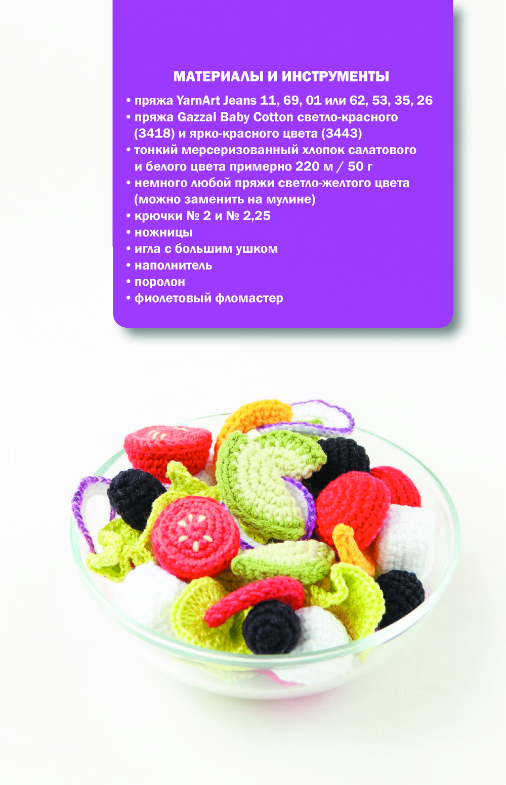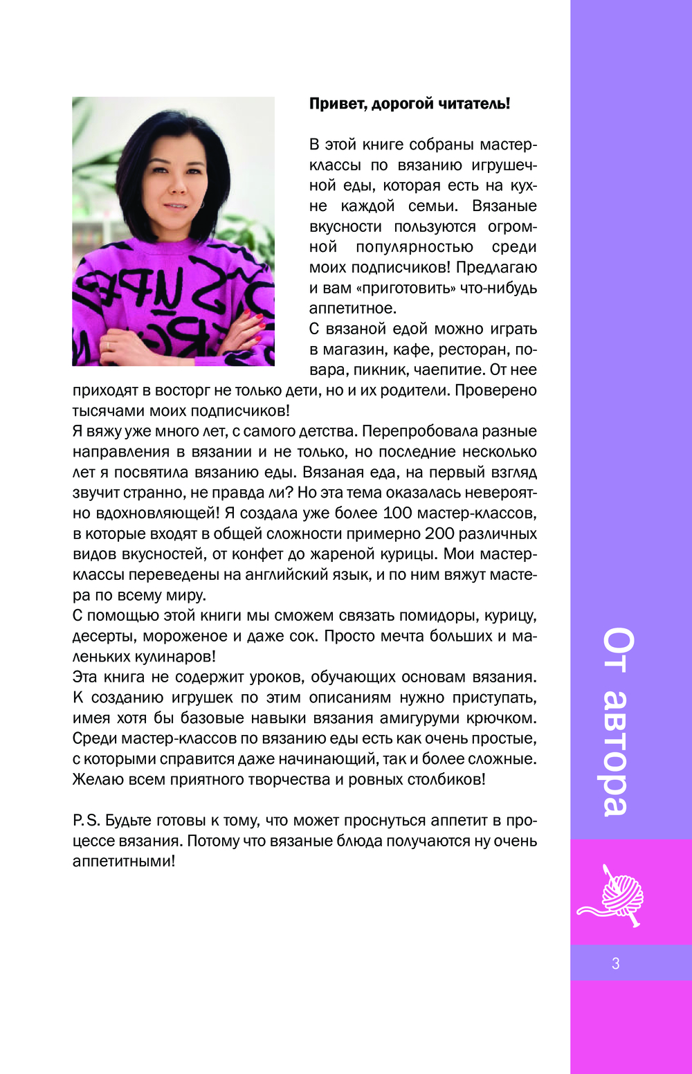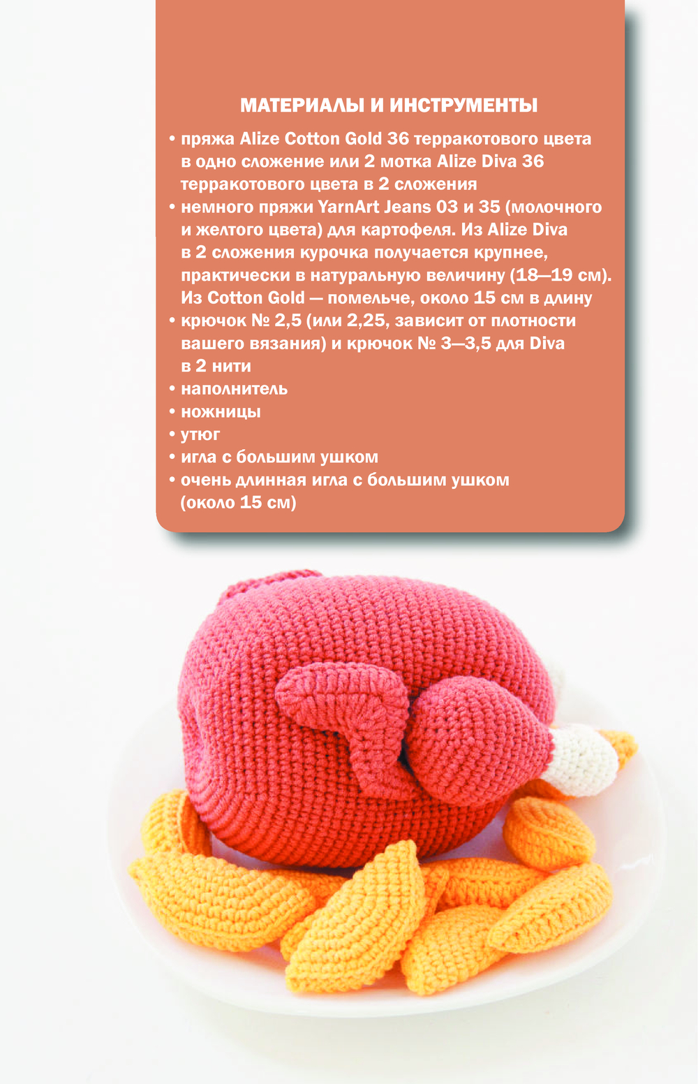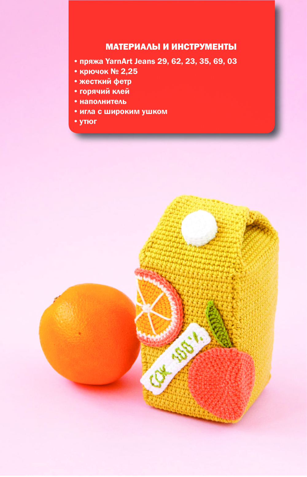 В этой книге представлено 13 мастер-классов по вязанию игрушечной еды в стиле амигуруми. Вы сможете связать: помидоры, огурцы, зеленый лучок, курицу-гриль с картофелем, греческий салат, яблоко, банан, сладкие мини-рулеты, 3 вида мороженого, апельсиново-мятный смузи, сок. В этом вам помогут подробные описания этапов вязания и пошаговые фотографии.
