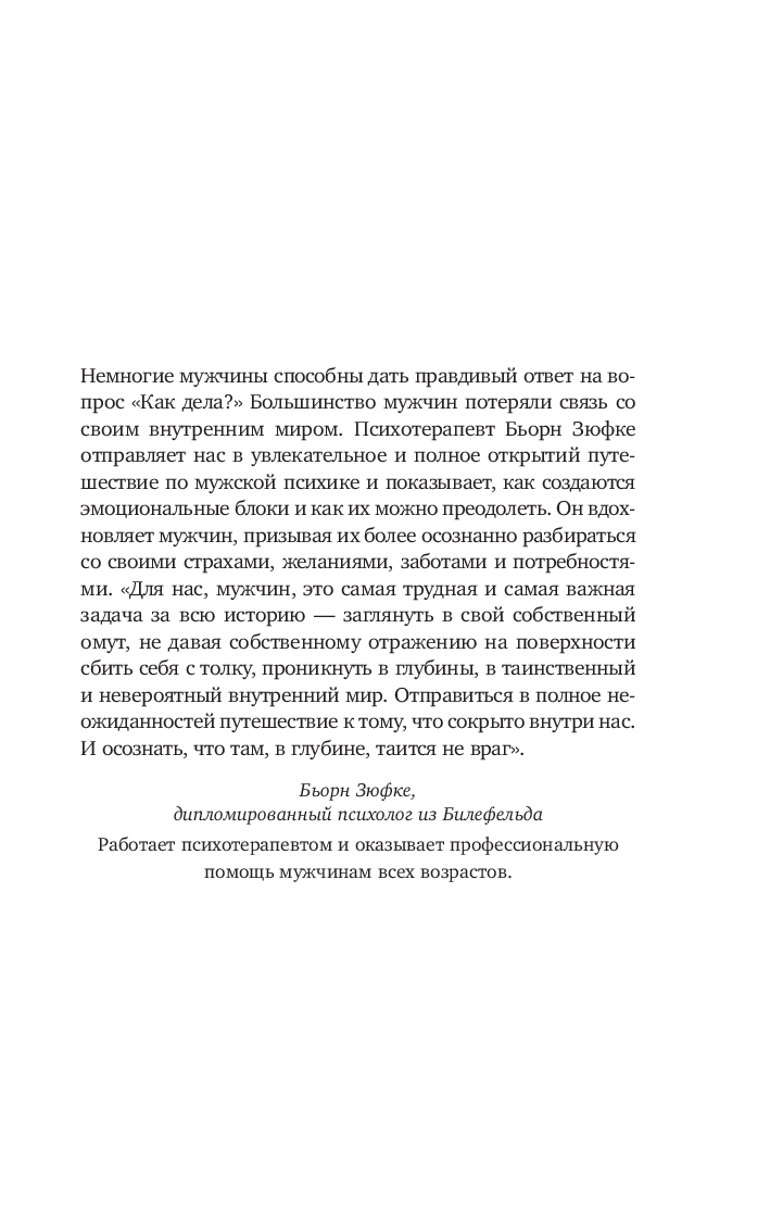 Психотерапевт Бьорн Зюфке аккуратно и с юмором исследует эмоциональный мир мужчин. В многочисленных примерах из практики доктора мы увидим, что представителям сильного пола с детства навязывают стереотипы, из-за которых они не могут проявлять слабость и почти во всем чувствуют конкуренцию.