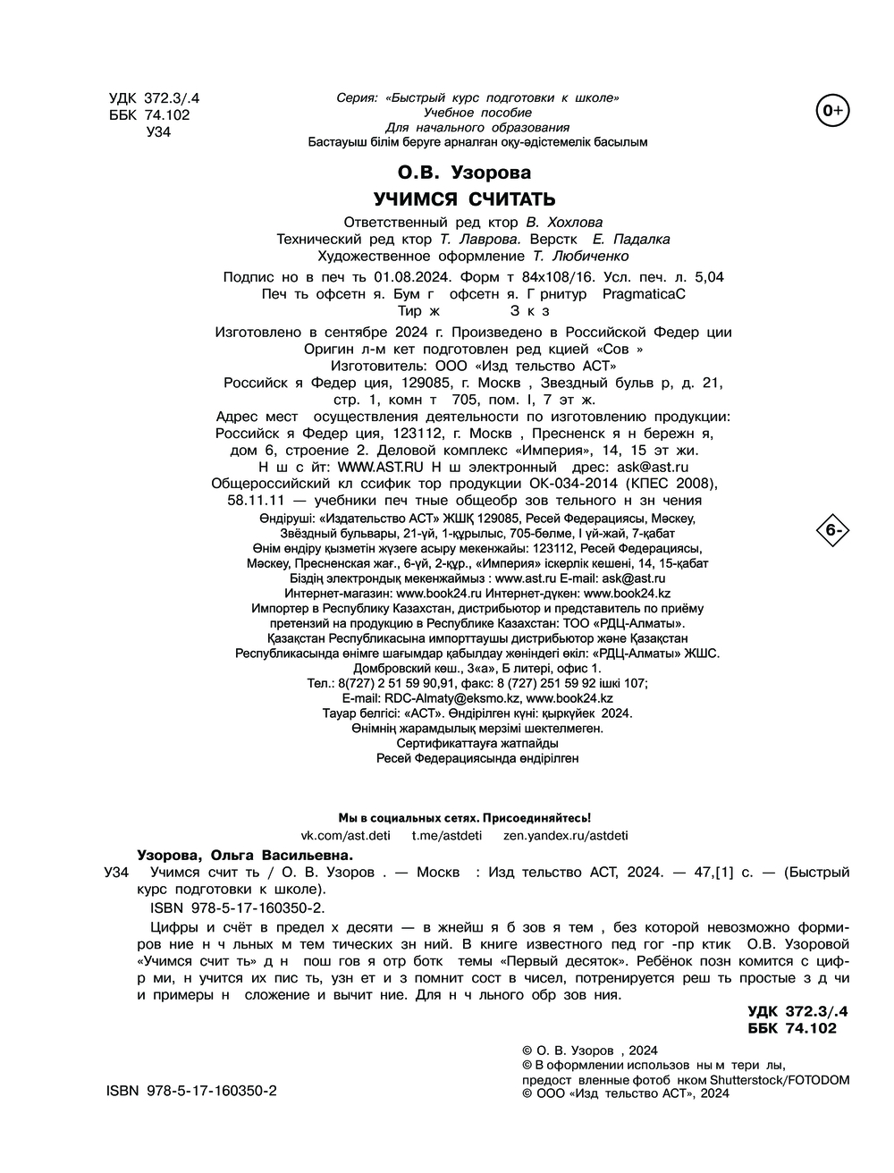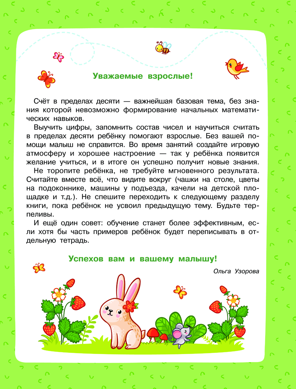 Цифры и счёт в пределах десяти – важнейшая базовая тема, без которой невозможно формирование начальных математических знаний. В книге известного педагога-практика О.В. Узоровой "Учимся считать" дана пошаговая отработка темы "Первый десяток". Ребёнок познакомится с цифрами, научится их писать, узнает и запомнит состав чисел, потренируется решать простые задачи и примеры на сложение и вычитание.