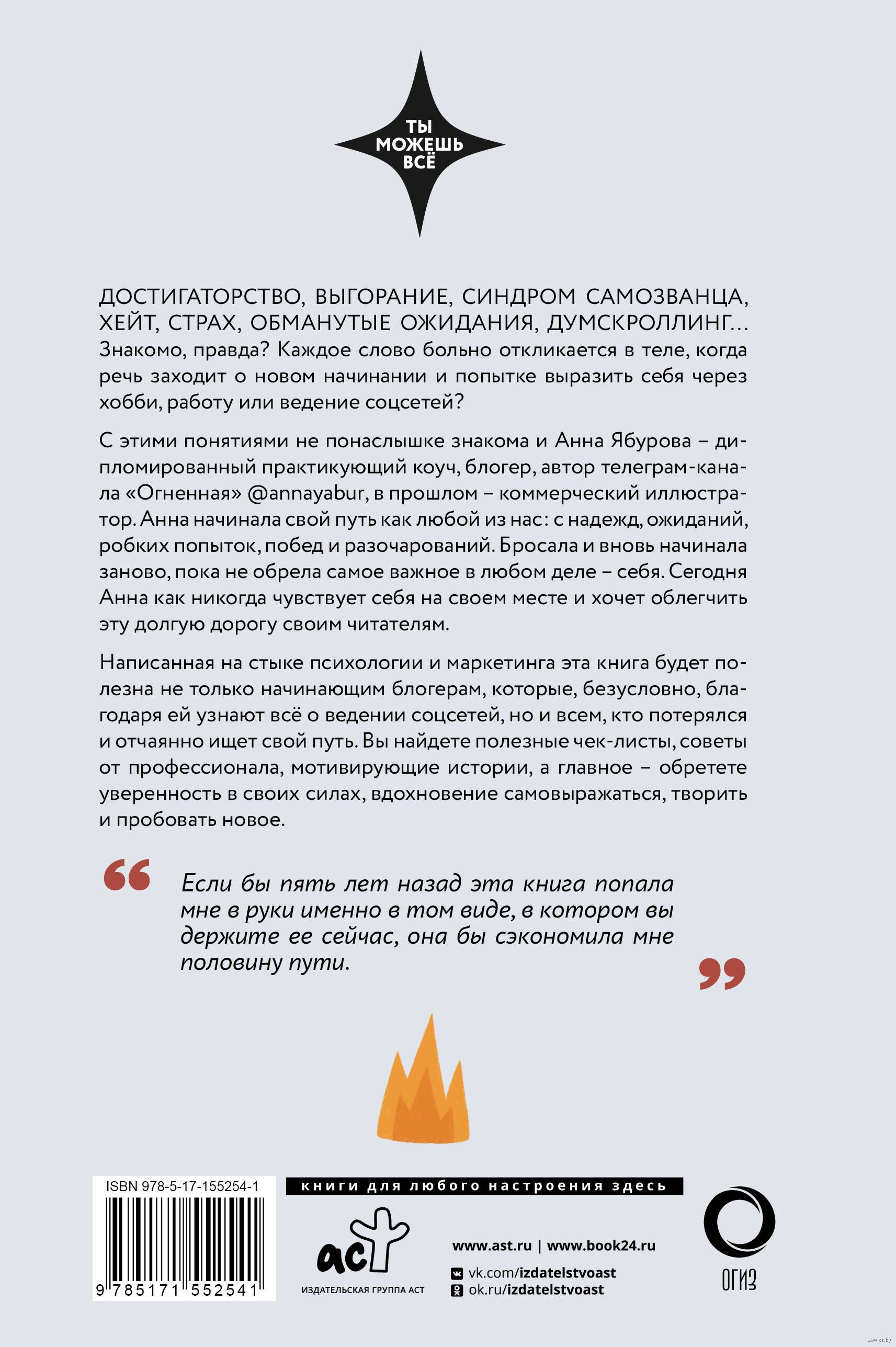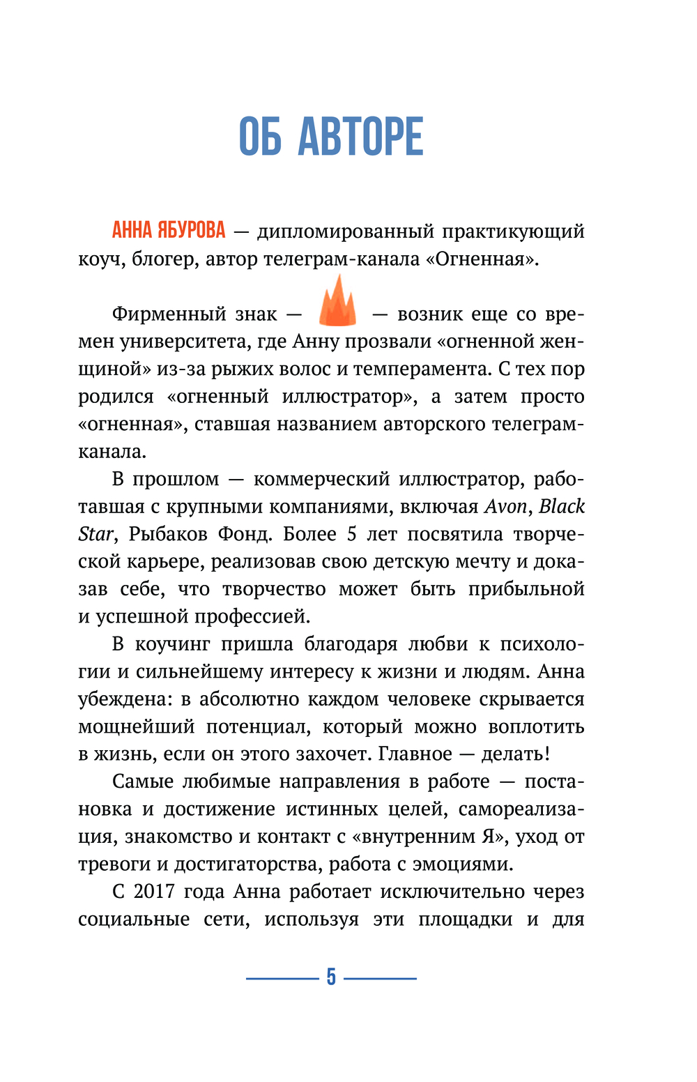 С этими понятиями не понаслышке знакома и Анна Ябурова – дипломированный практикующий коуч, блогер, автор телеграм-канала "Огненная" @annayabur, в прошлом – коммерческий иллюстратор. Анна начинала свой путь как любой из нас: с надежд, ожиданий, робких попыток, побед и разочарований. Бросала и вновь начинала заново, пока не обрела самое важное в любом деле – себя. Сегодня Анна как никогда чувствует себя на своем месте и хочет облегчить эту долгую дорогу своим читателям.