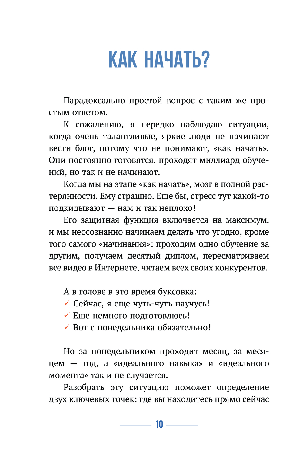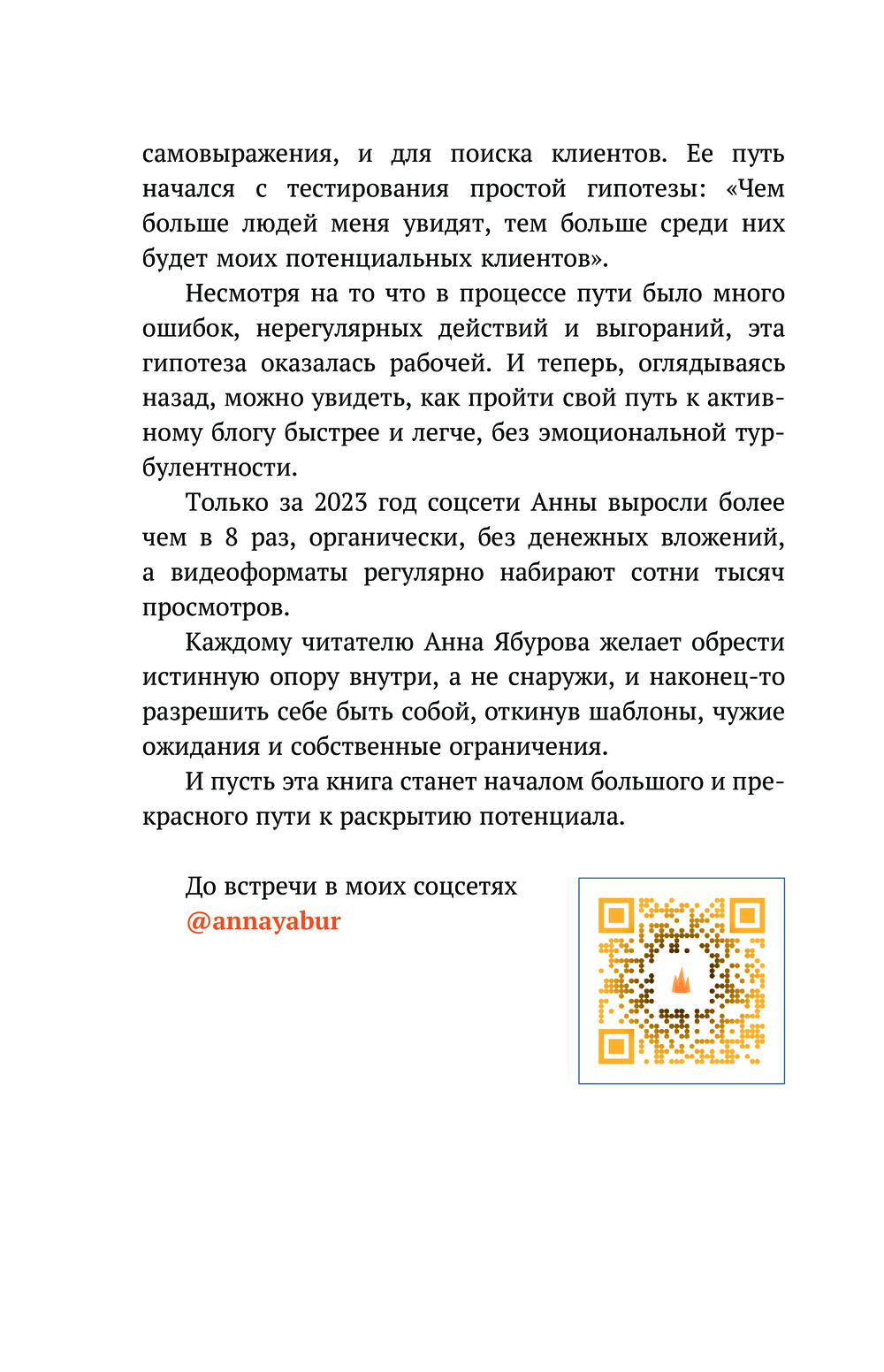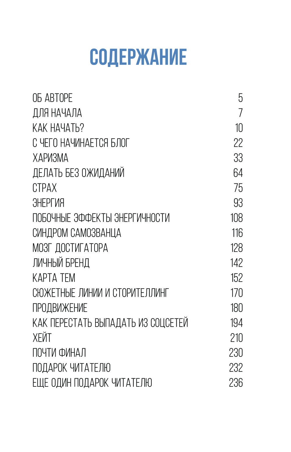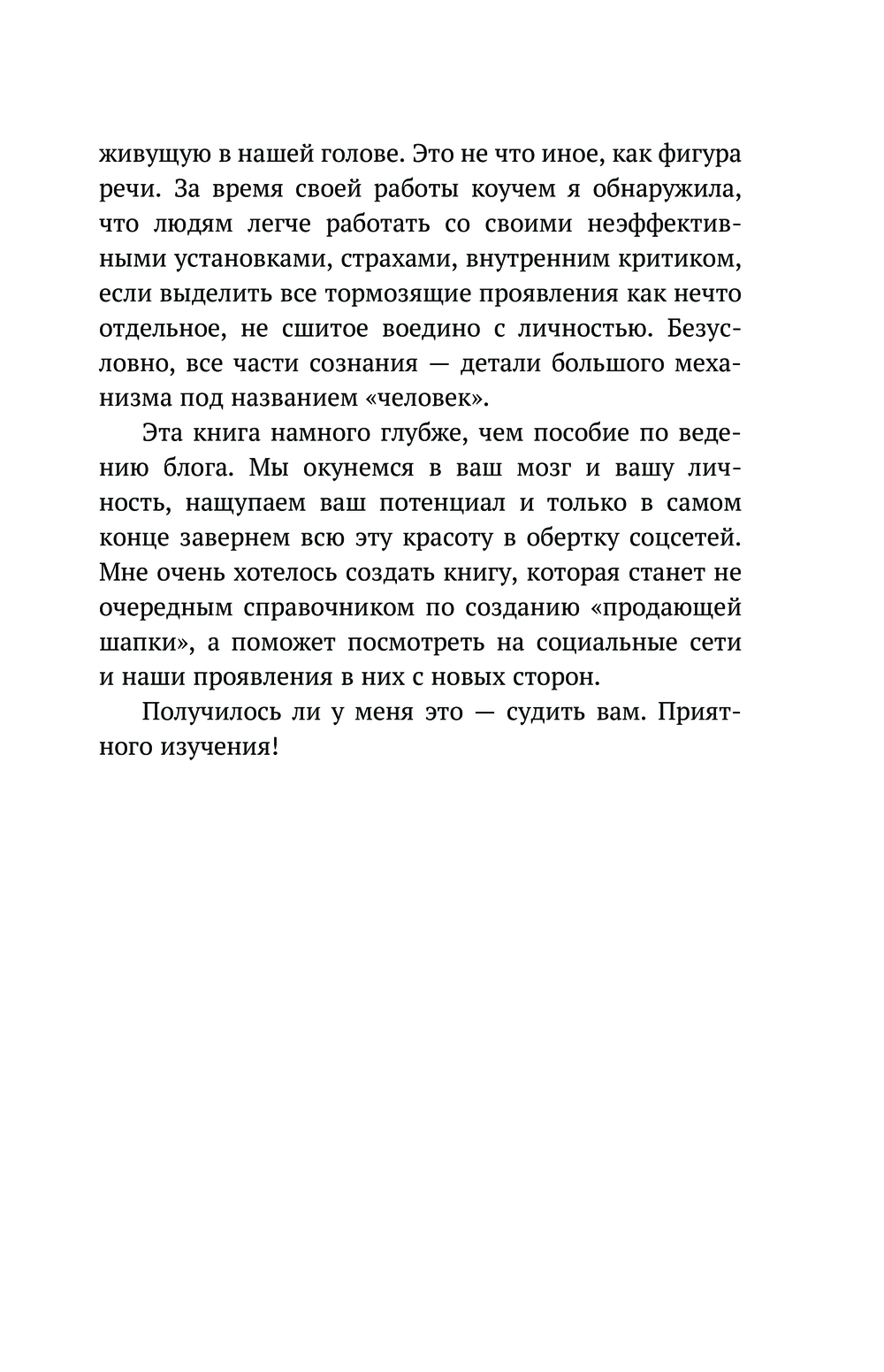 Написанная на стыке психологии и маркетинга эта книга будет полезна не только начинающим блогерам, которые, безусловно, благодаря ей узнают всё о ведении соцсетей, но и всем, кто потерялся и отчаянно ищет свой путь. Вы найдете полезные чек-листы, советы от профессионала, мотивирующие истории, а главное – обретете уверенность в своих силах, вдохновение самовыражаться, творить и пробовать новое.