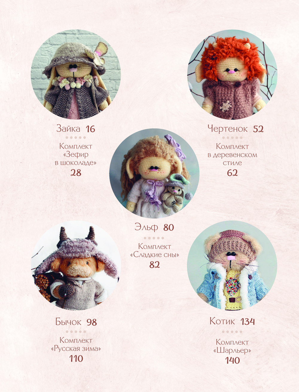 Благодаря подробным мастер-классам вы сможете создать 10 уникальных персонажей: застенчивую зайку в нежном комплекте "Зефир в шоколаде", очаровательного бычка в костюме в русском стиле, забавного эльфа в комплекте для сна, симпатичного чертенка в наряде в деревенском стиле и чудесного котика в элегантном комплекте. Среди этих уютных персонажей обязательно найдется кто-то, кто придется вам по душе!