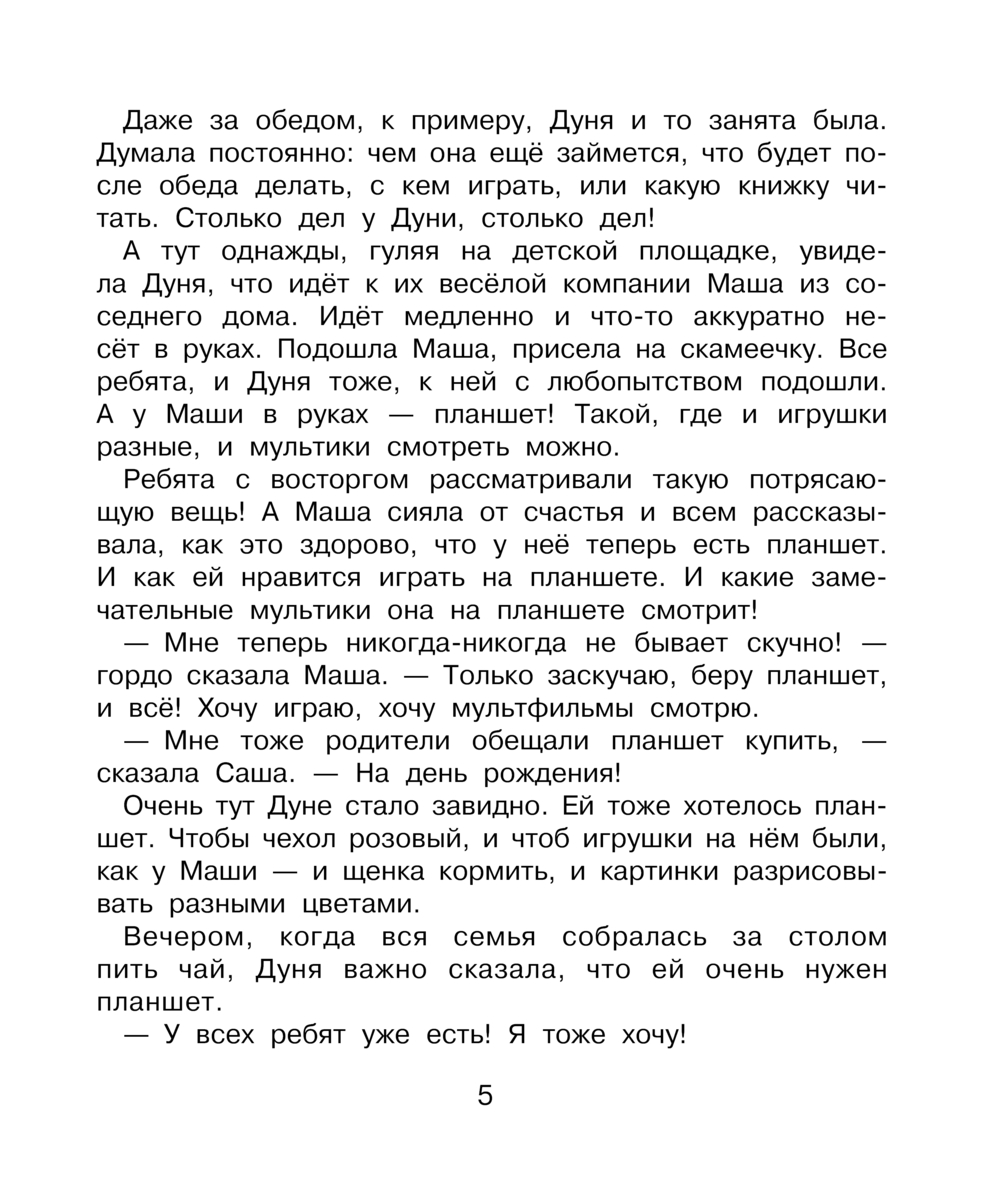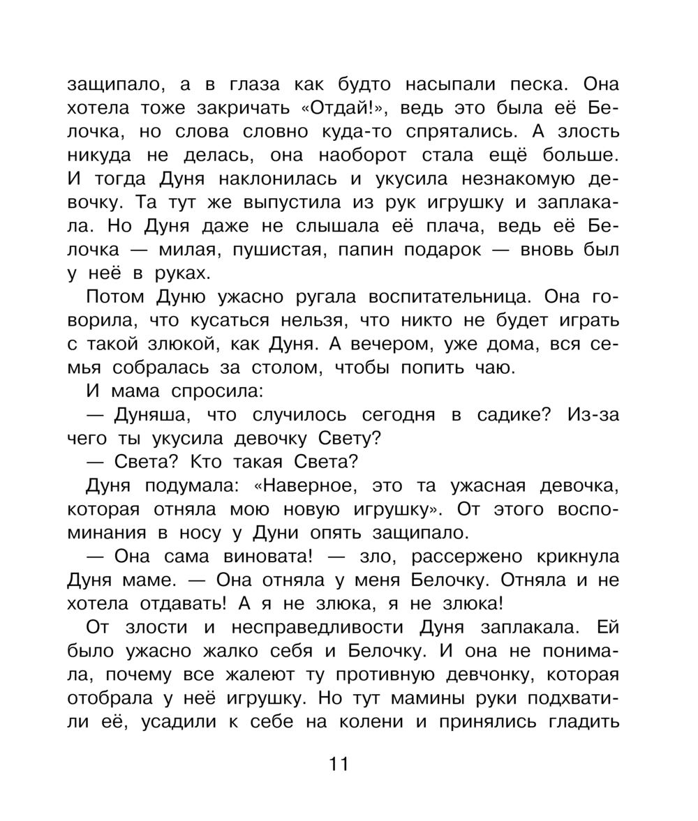 Познавательная книга приглашает юного читателей отправиться в захватывающее путешествие вместе с маленькой героиней по имени Дуня. В каждой главе девочка сталкивается с различными вызовами и испытаниями, которые помогают ей учиться преодолевать свои страхи, развивать доброту и внимательность к окружающим, а также обдумывать свои поступки. Её истории помогут ребёнку задуматься над важными вопросами: Как преодолевать страхи? Нужно ли всегда отвечать злом на зло? И многими другими.