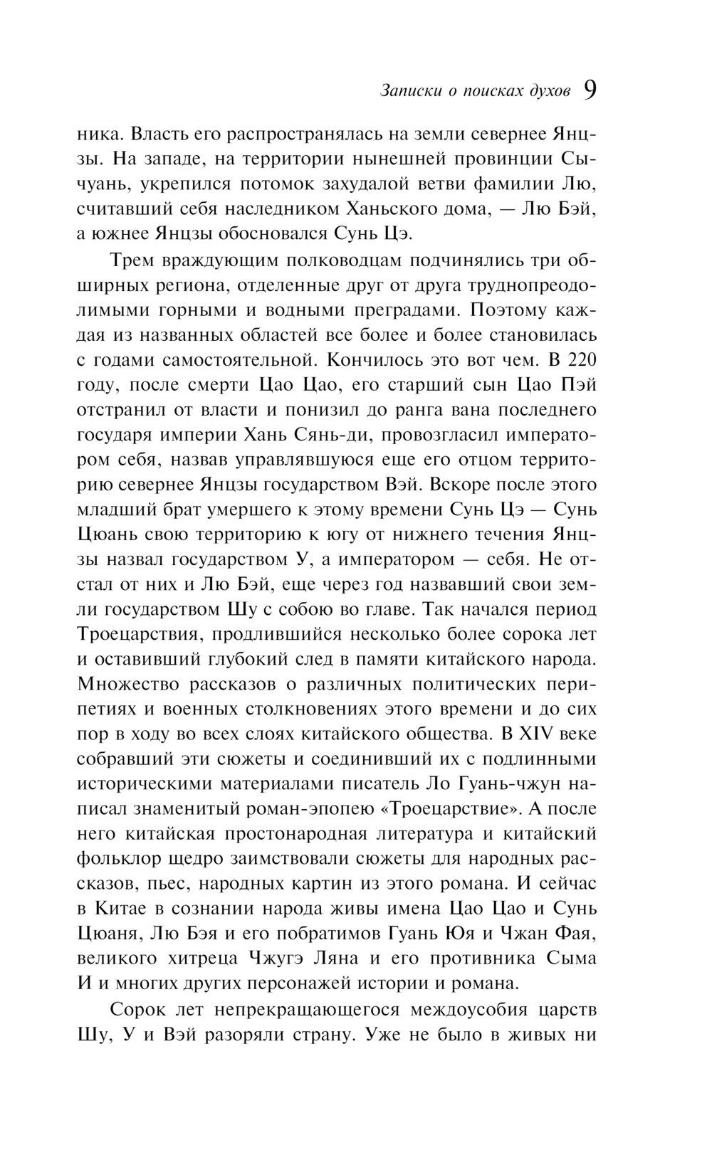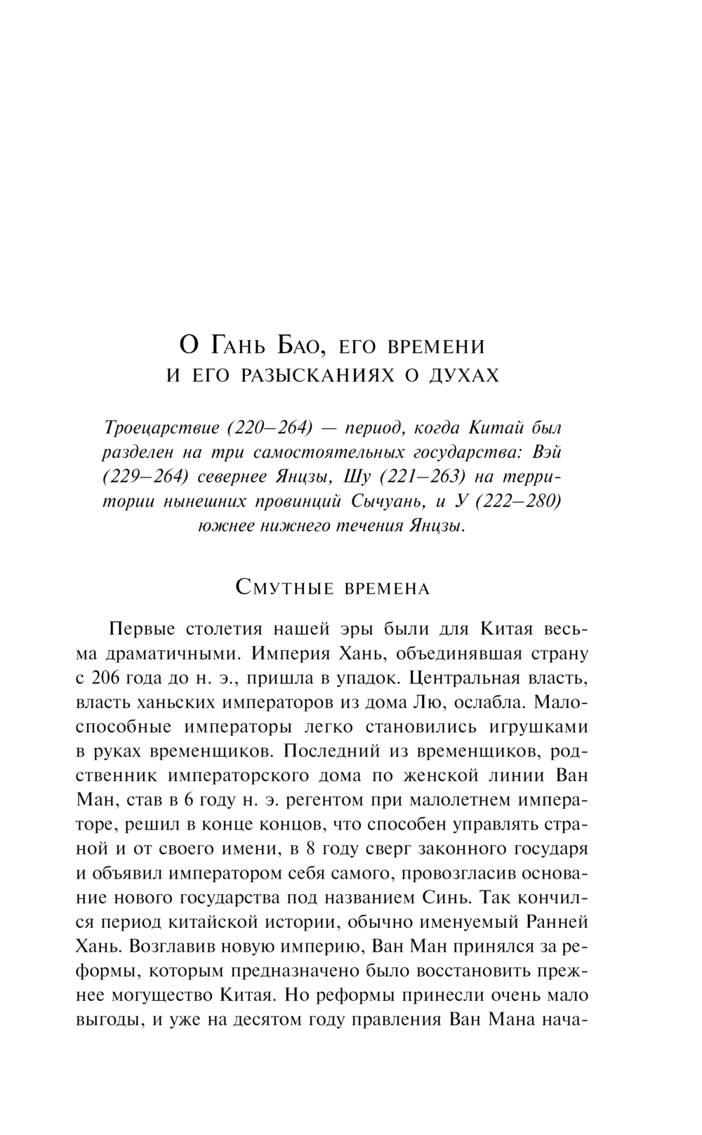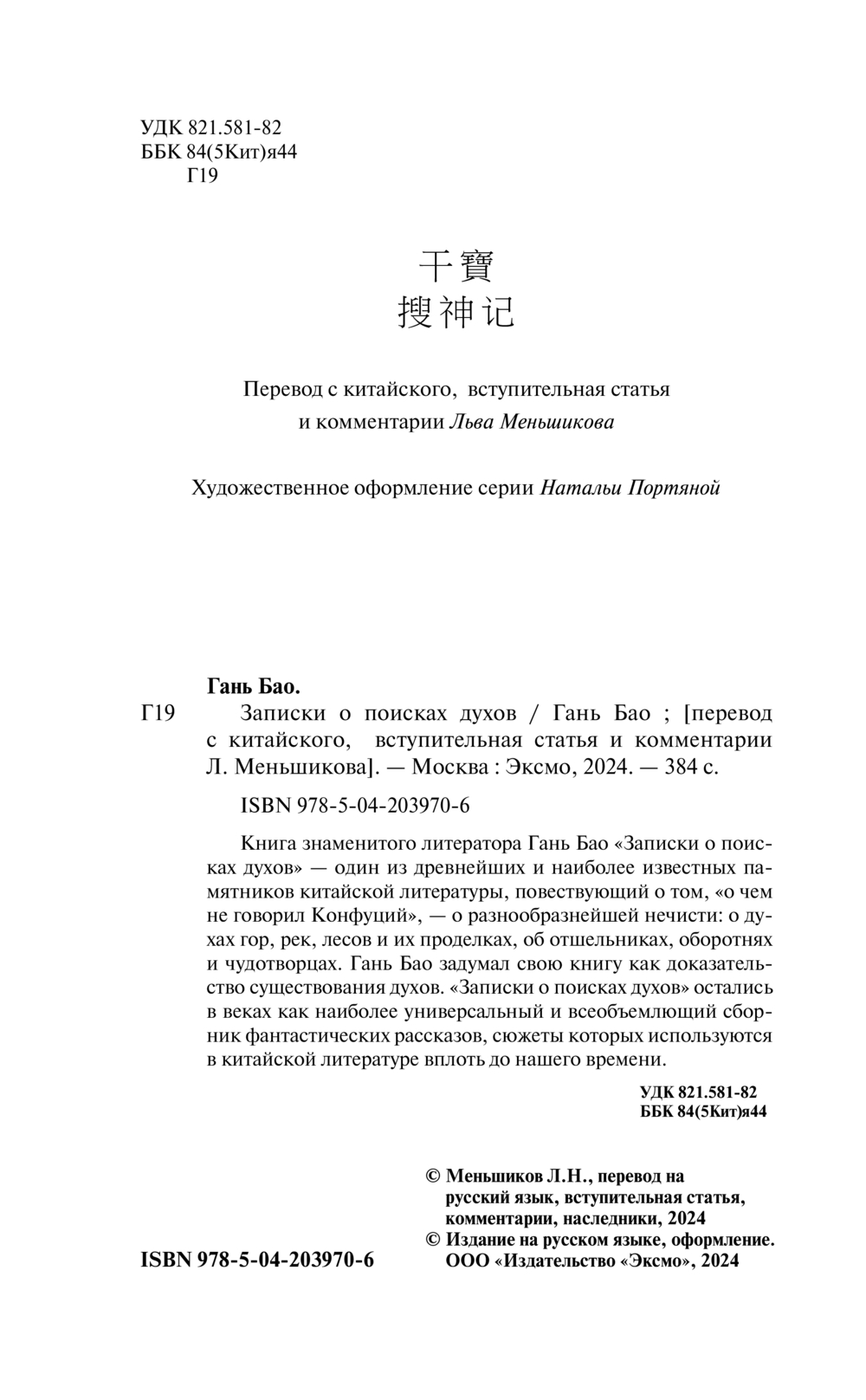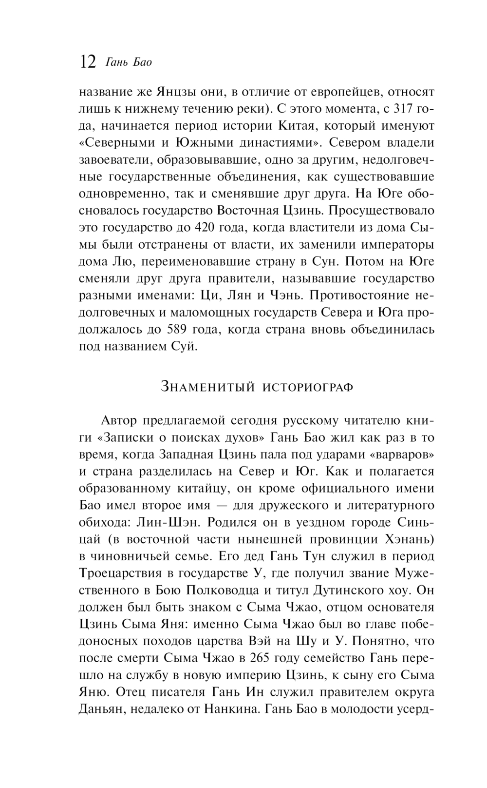 Книга знаменитого литератора Гань Бао "Записки о поисках духов" – один из древнейших и наиболее известных памятников китайской литературы, повествующий о том, "о чем не говорил Конфуций", – о разнообразнейшей нечисти: о духах гор, лек, лесов и их проделках, об отшельниках, оборотнях и чудотворцах. Гань Бао задумал свою книгу как доказательство существования духов. "Записки о поисках духов" остались в веках как наиболее универсальный и всеобъемлющий сборник фантастических рассказов, сюжеты которых используются в китайской литературе вплоть до нашего времени.
