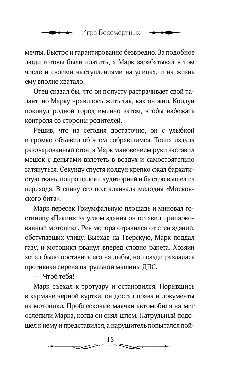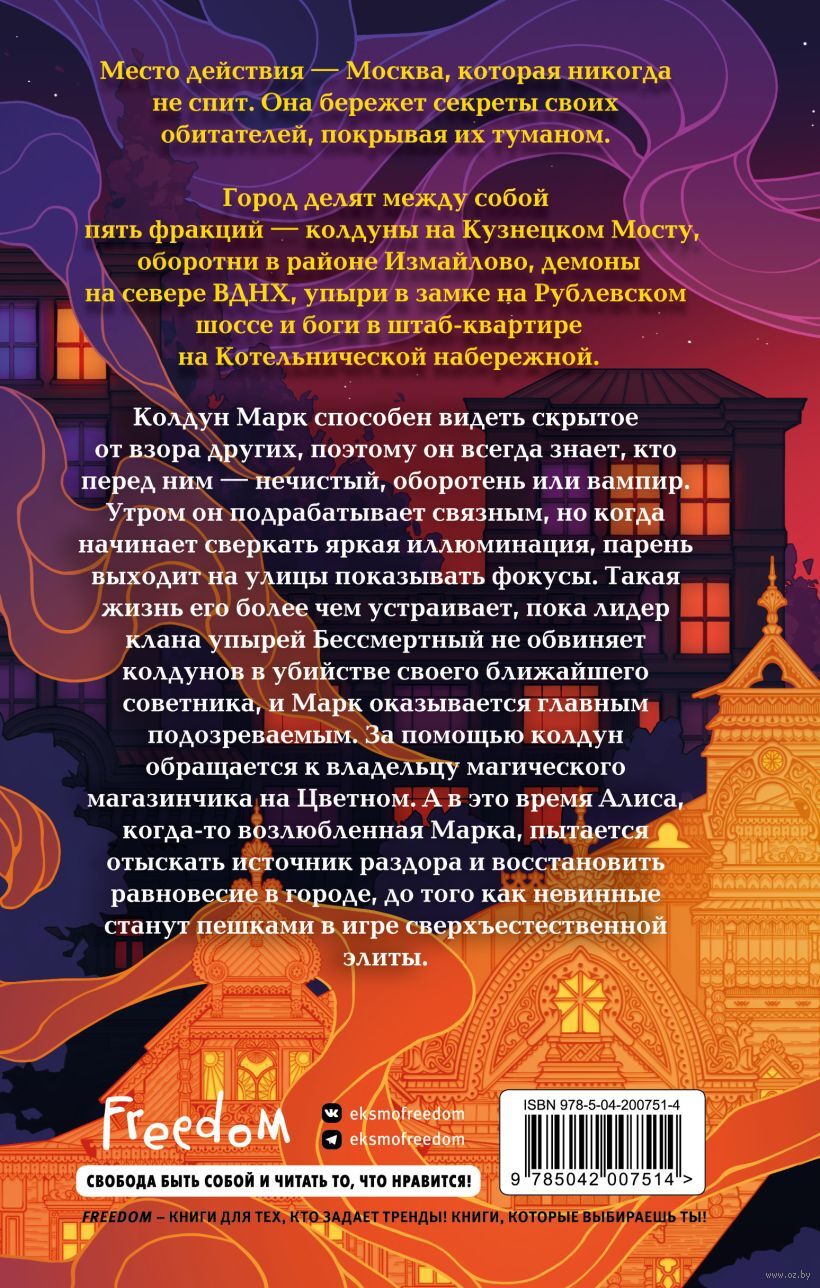 Колдун Марк способен видеть скрытое от взора других, поэтому он всегда знает, кто перед ним – нечистый, оборотень или вампир. Утром он подрабатывает связным, но когда начинает сверкать яркая иллюминация, парень выходит на улицы показывать фокусы. Такая жизнь его более чем устраивает, пока лидер клана упырей Бессмертный не обвиняет колдунов в убийстве своего ближайшего советника, и Марк оказывается главным подозреваемым. За помощью колдун обращается к владельцу магического магазинчика на Цветном. А в это время Алиса, когда-то возлюбленная Марка, пытается отыскать источник раздора и восстановить равновесие в городе, пока невинные не стали пешками в игре сверхъестественной элиты.