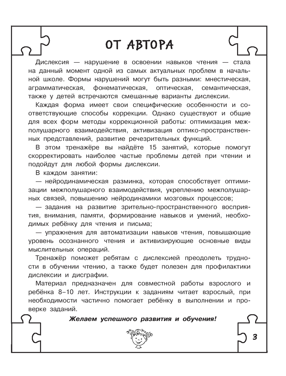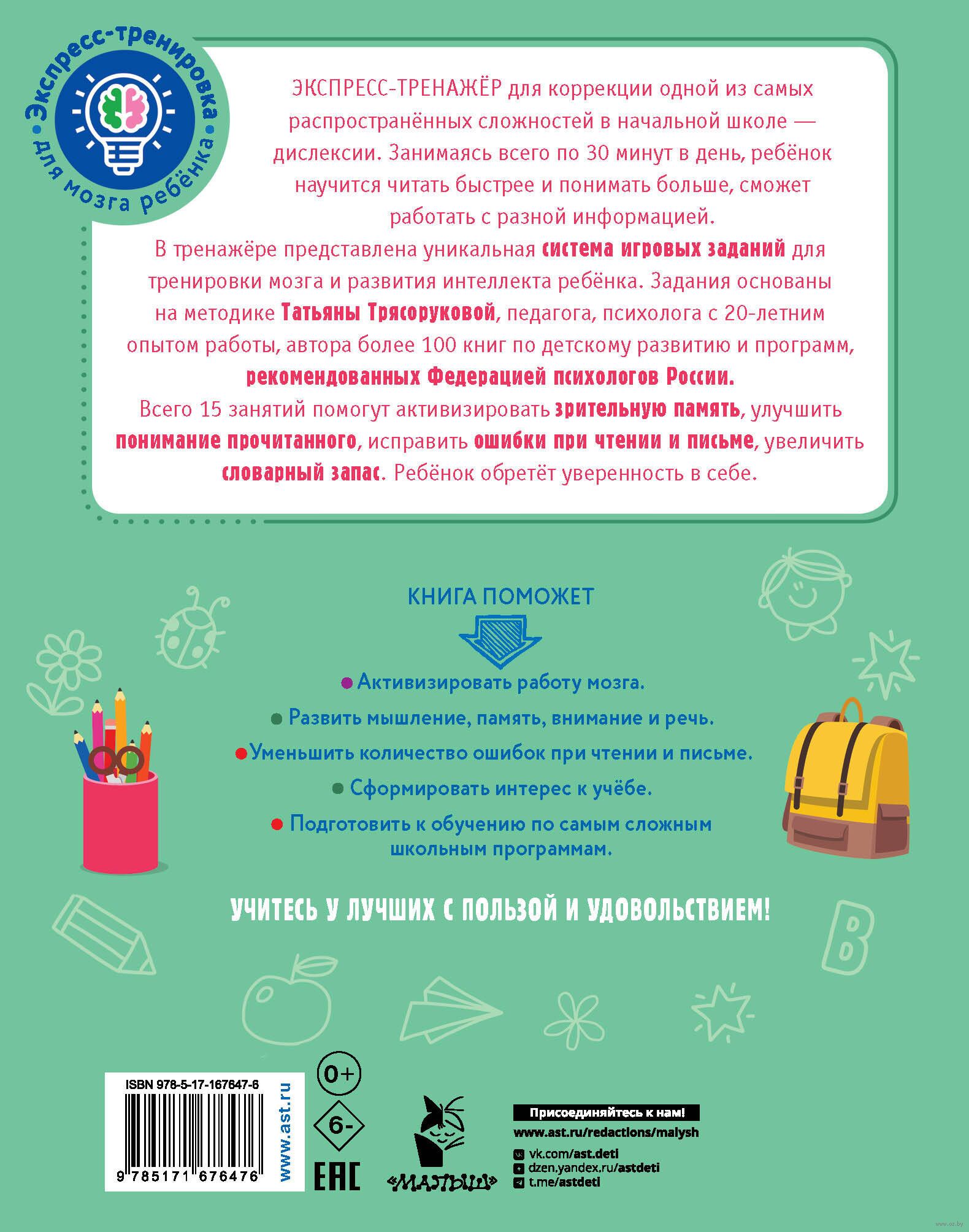 Опытный психолог и педагог Т. Трясорукова поможет справиться с одной из самых распространённых проблем младших школьников – дислексией. Увлекательные игровые задания не только помогут избавиться от ошибок при чтении и письме, но и научат вашего ребёнка анализировать и систематизировать информацию, помогут лучше понимать прочитанное. Тренажёр позволит улучшить внимание и память, сформирует новые и укрепит уже имеющиеся межполушарные связи и улучшат работу мозга.