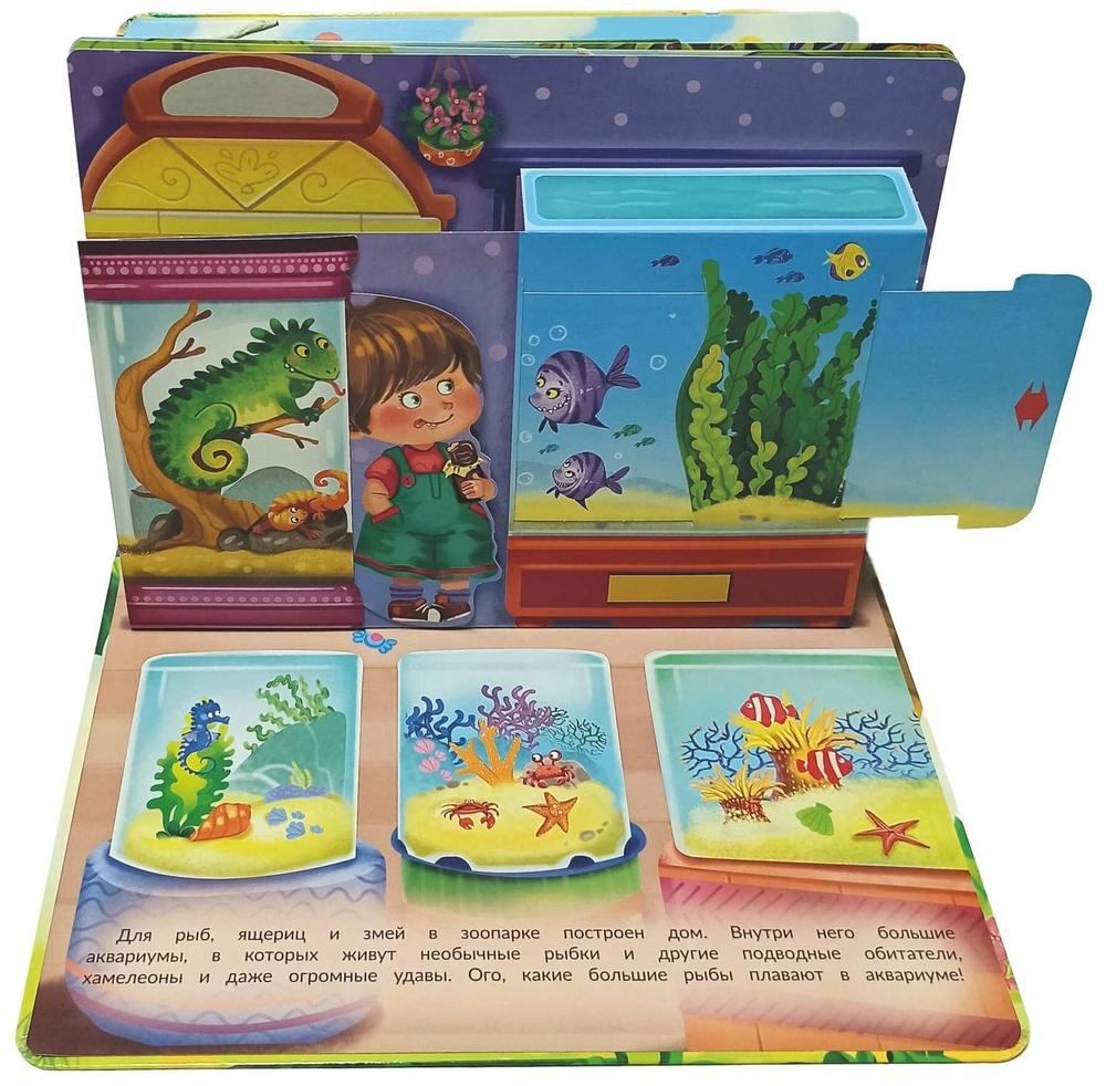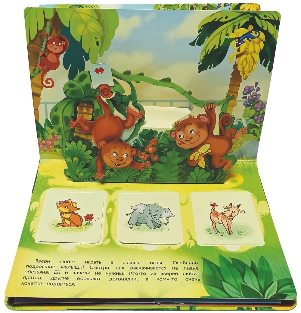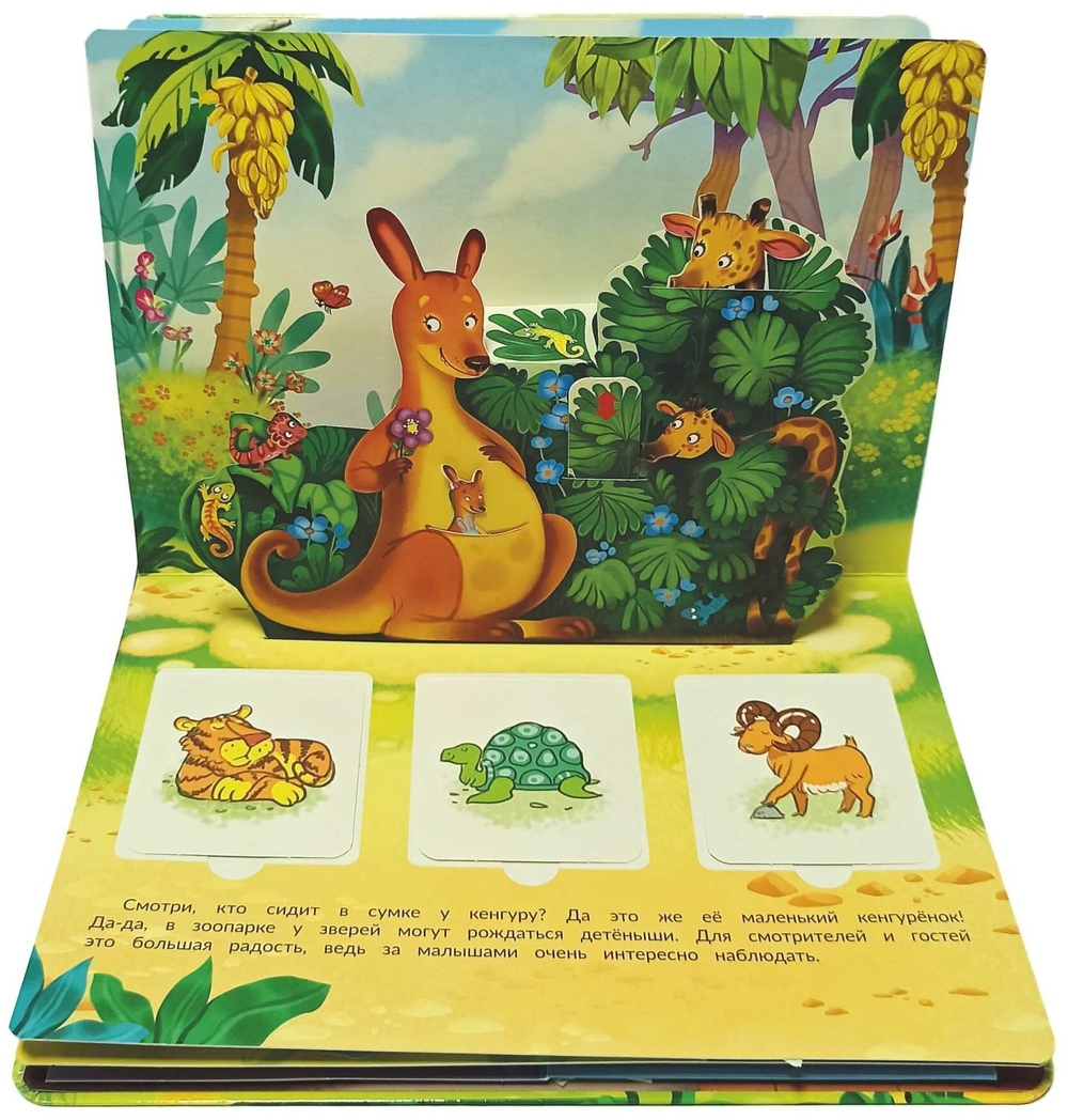 В зоопарке живут удивительные звери. Они едят, играют, купаются, спят, растят детёнышей. Листая книгу можно познакомится с обитателями зоопарка и узнать много интересного. На каждом развороте есть объемные предметы, подвижные элементы и даже окошки. А значит книгу можно не только читать, с ней можно играть.