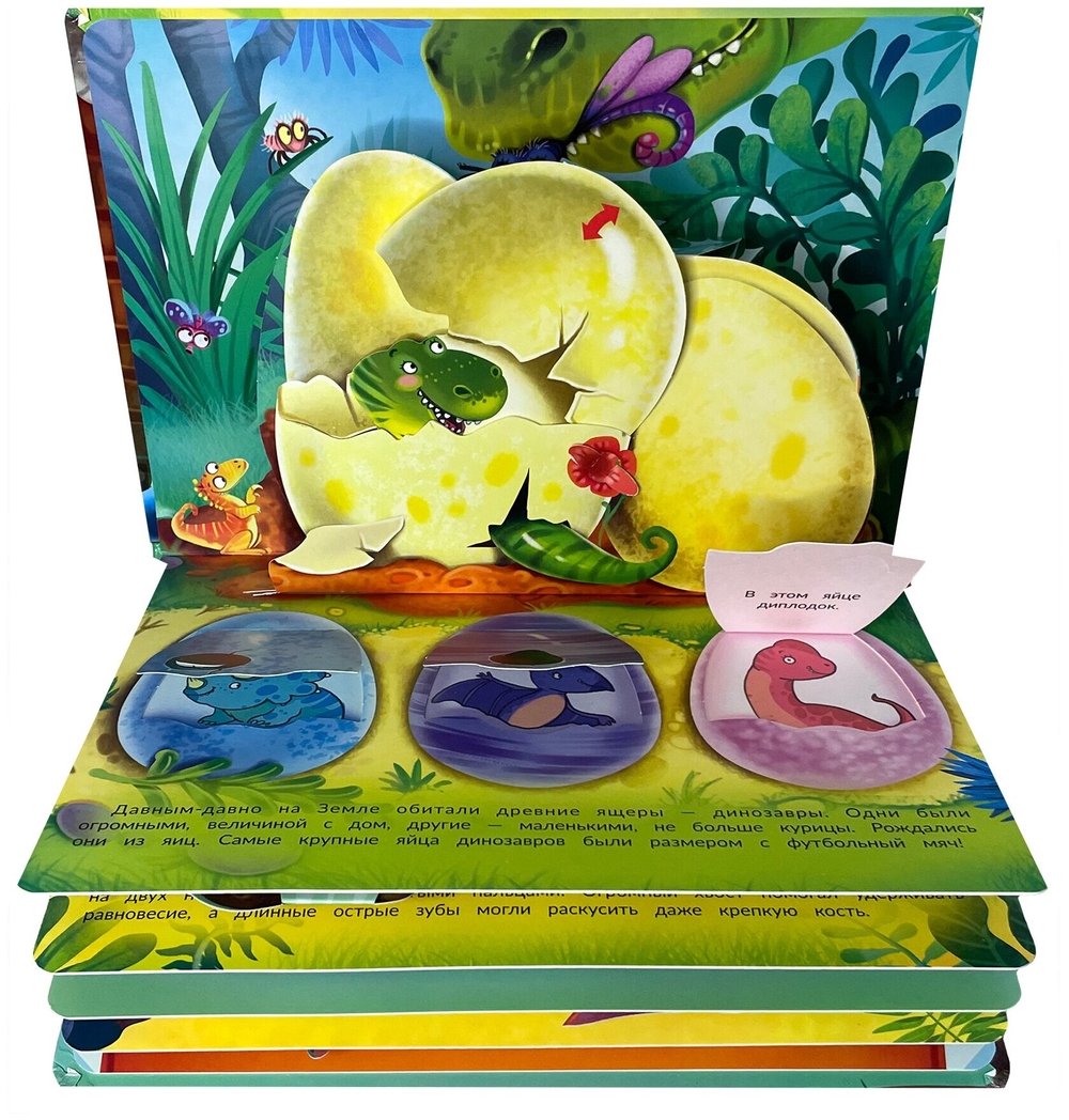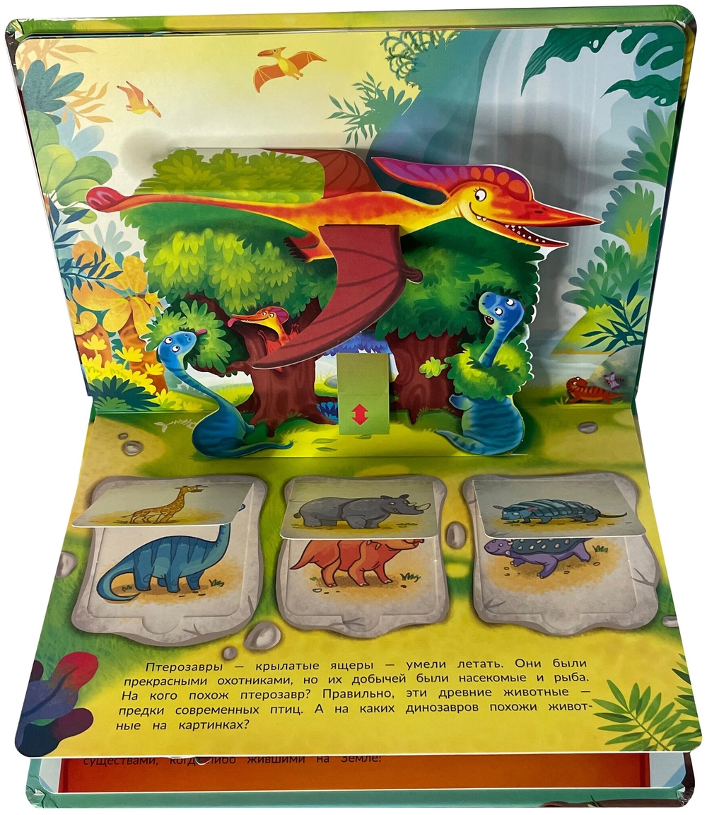 Давным-давно на Земле жили удивительные существа – динозавры. Откуда они появились? Как они выглядели? Кто сильнее – хищный тираннозавр или травоядный трицератопс? А может, они были пра-пра-пра-прадедушками современных животных? В этой книжке самые первые рассказы о динозаврах для малышей. Большие, яркие картинки могут двигаться, а в окошках-створках спрятались секреты и увлекательные задания. А значит книгу можно не только читать, с ней можно играть.