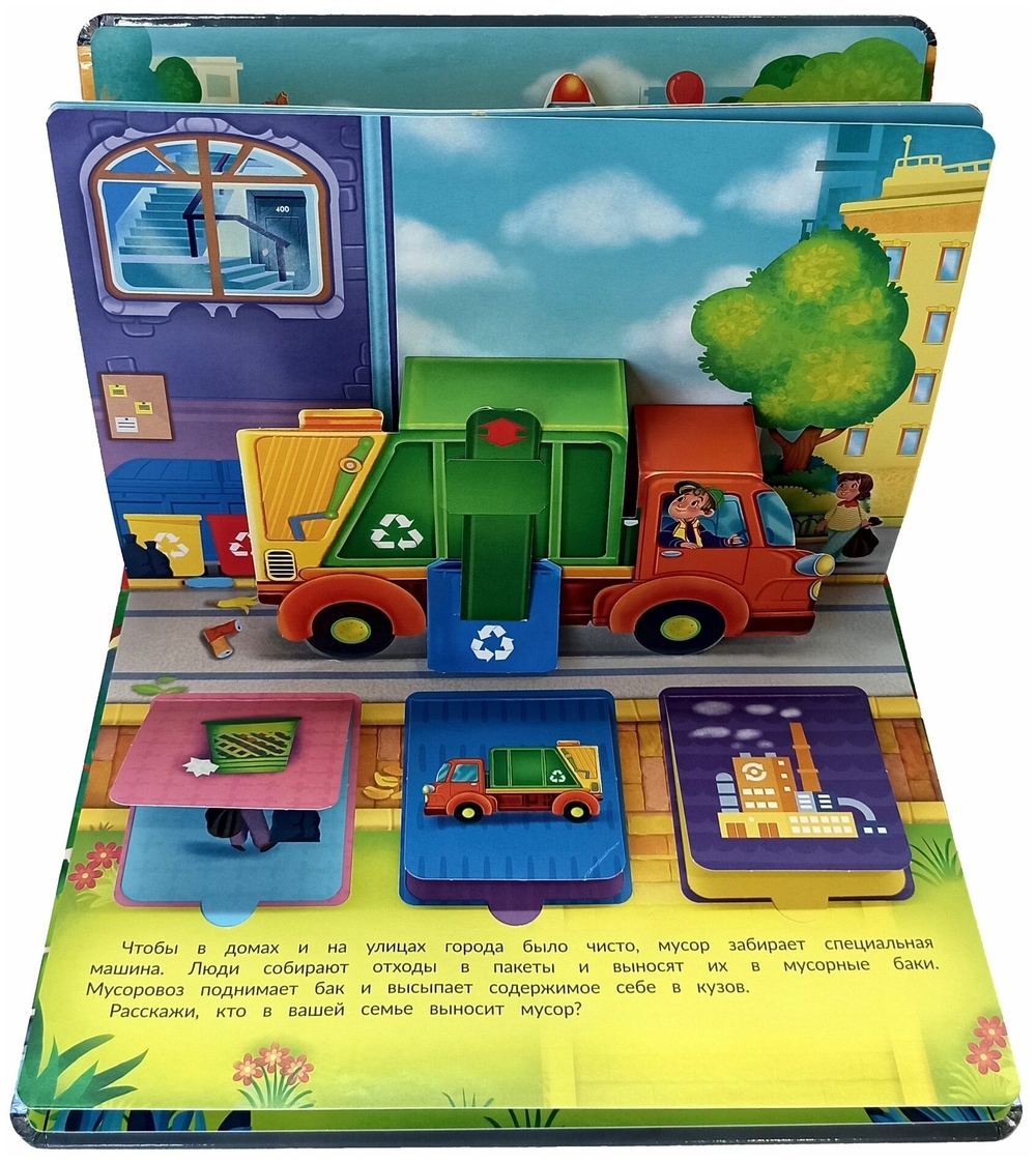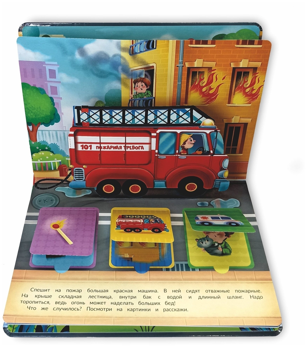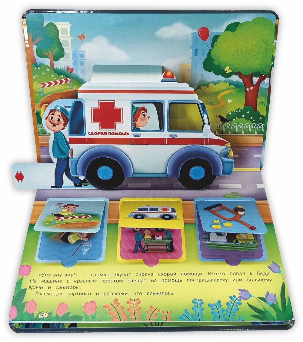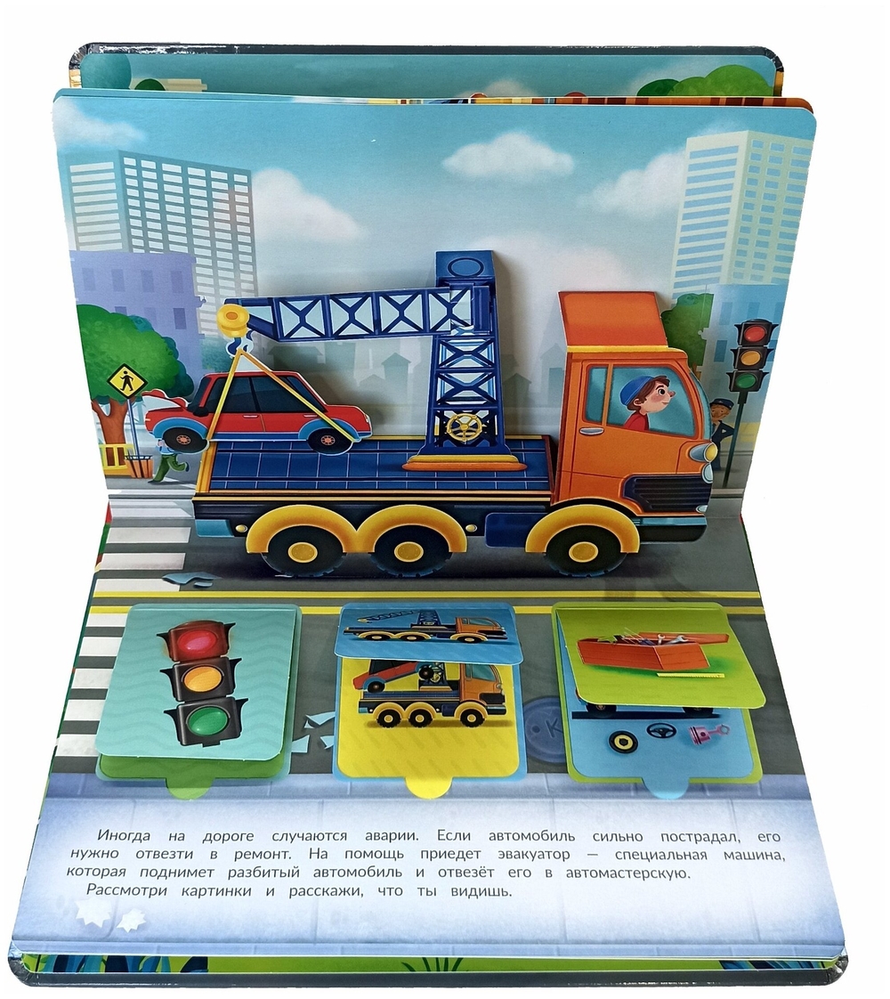 Каждую минуту на улицах города что-то происходит, и на помощь спешат важные и нужные машины. Это удивительная книга! На каждом развороте есть объемные машины с подвижными деталями и окошки. А значит книгу можно не только читать, с ней можно играть. Издание подойдет для занятий и игр с детьми в возрасте от двух лет. Развивает пространственное мышление, логику, мелкую моторику, зрительное восприятие, дает первые знания о полезных и очень любимых всеми мальчишками машинах. Книга большого формата, изготовлена из целлюлозного картона, на обложке глянцевая ламинация, а все страницы покрыты защитным безопасным лаком. На пяти разворотах 15 окошек с познавательной информацией и пять больших объемных картинок с подвижными элементами.